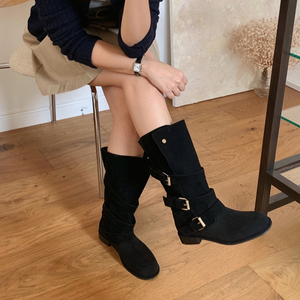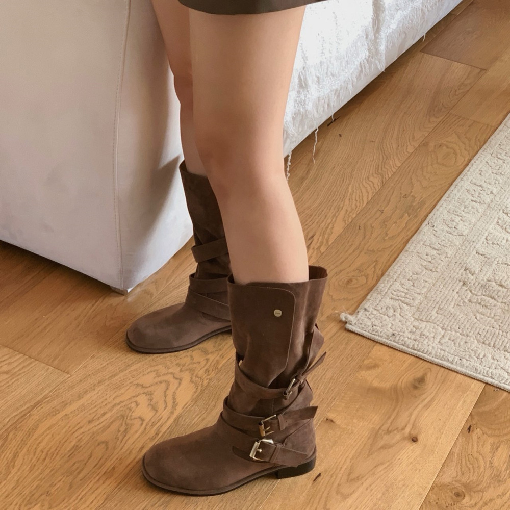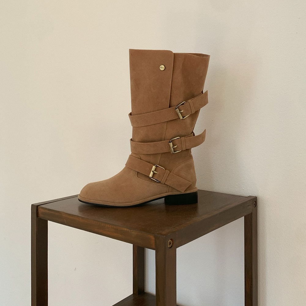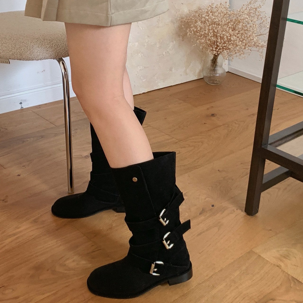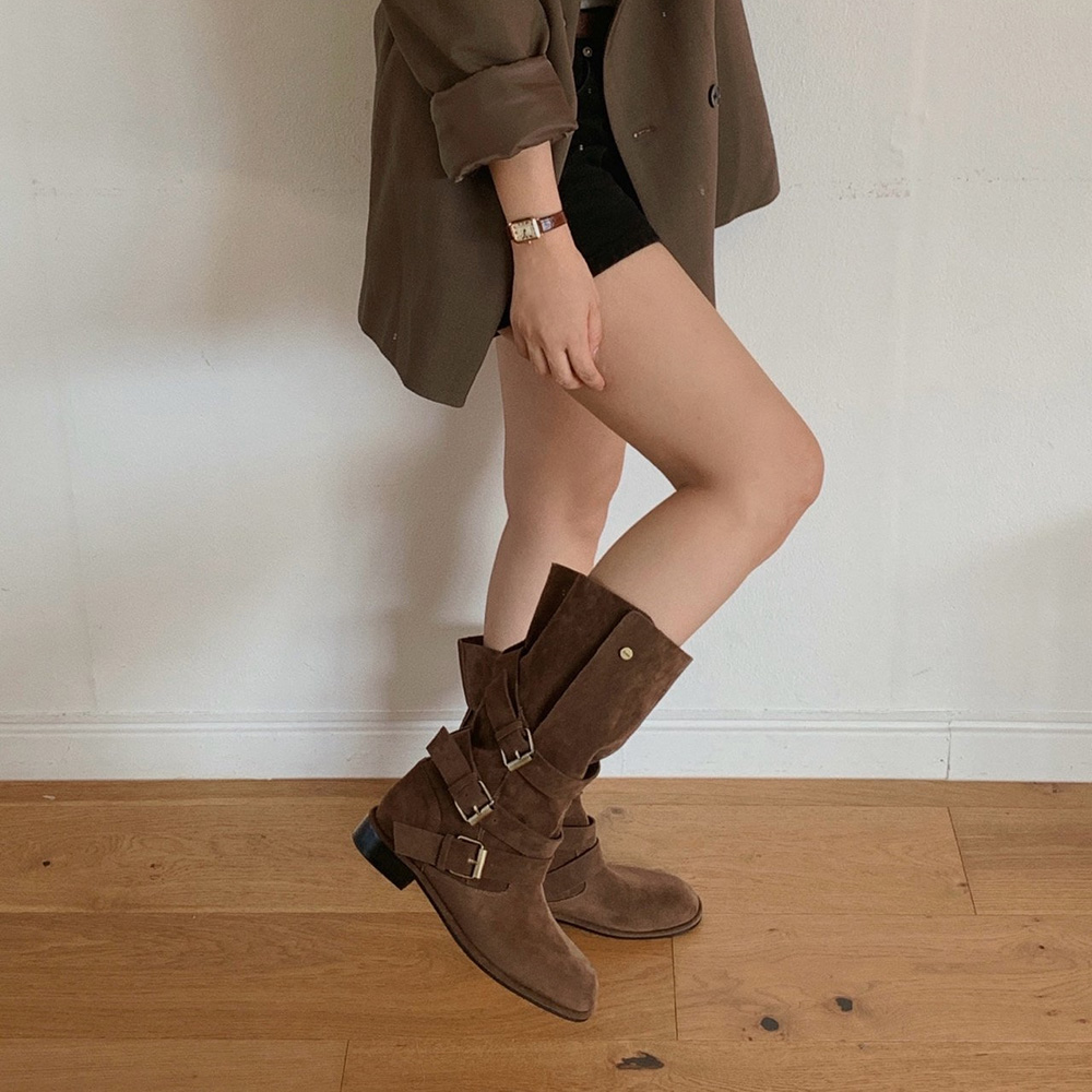 스웨이드 바이커 투웨이 벨트 여자 미디 하프 미들부츠
