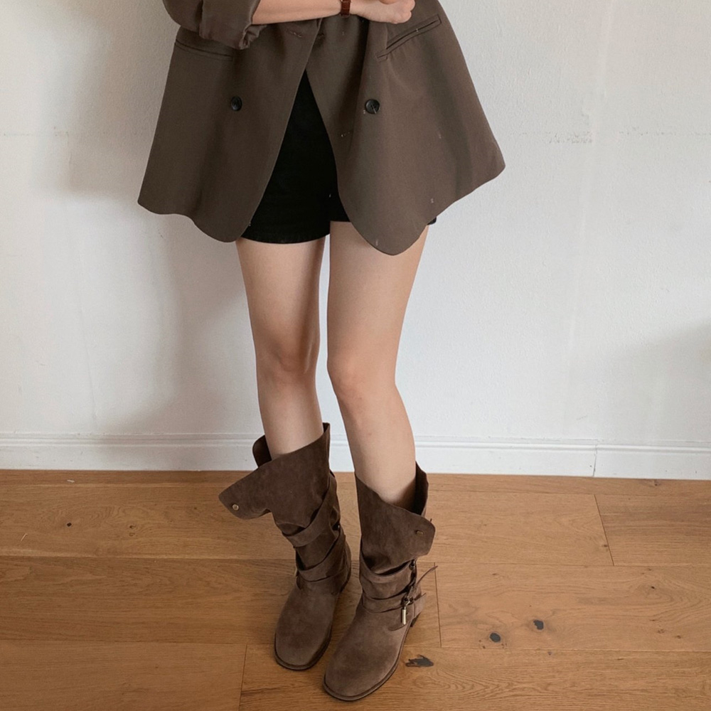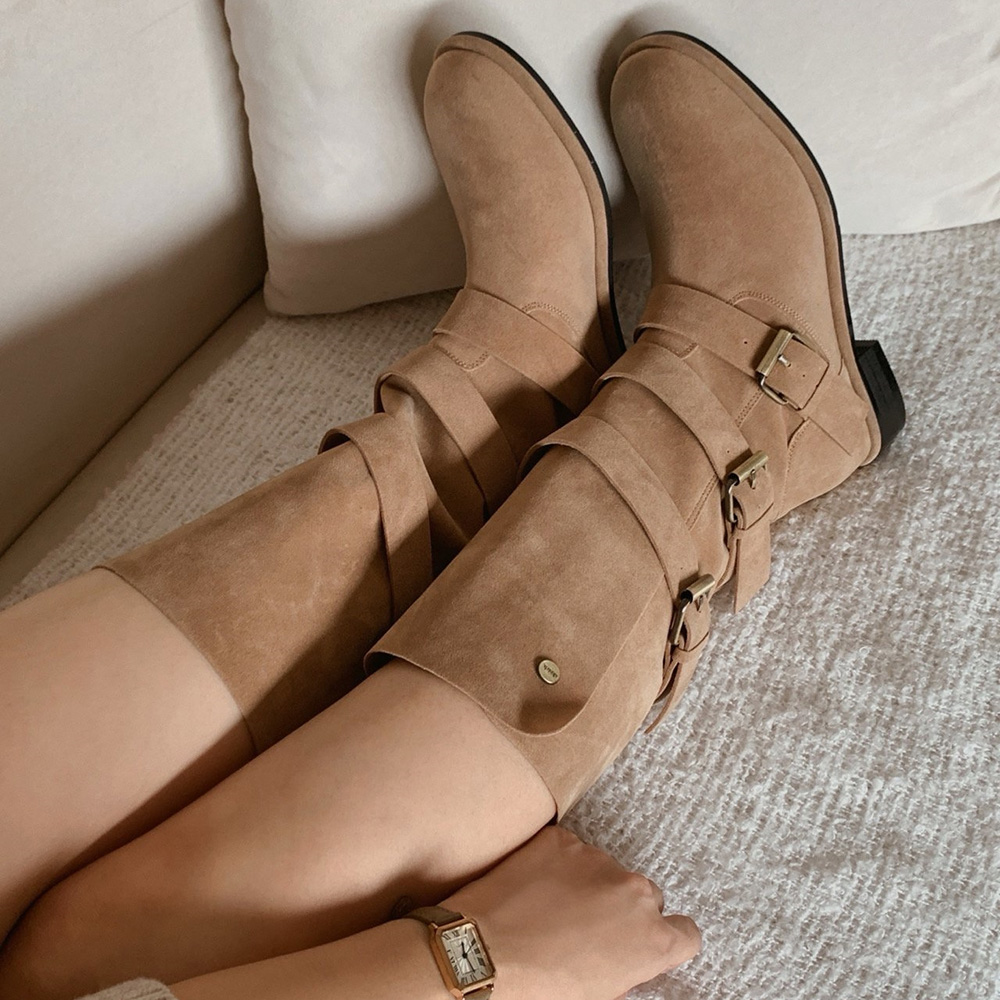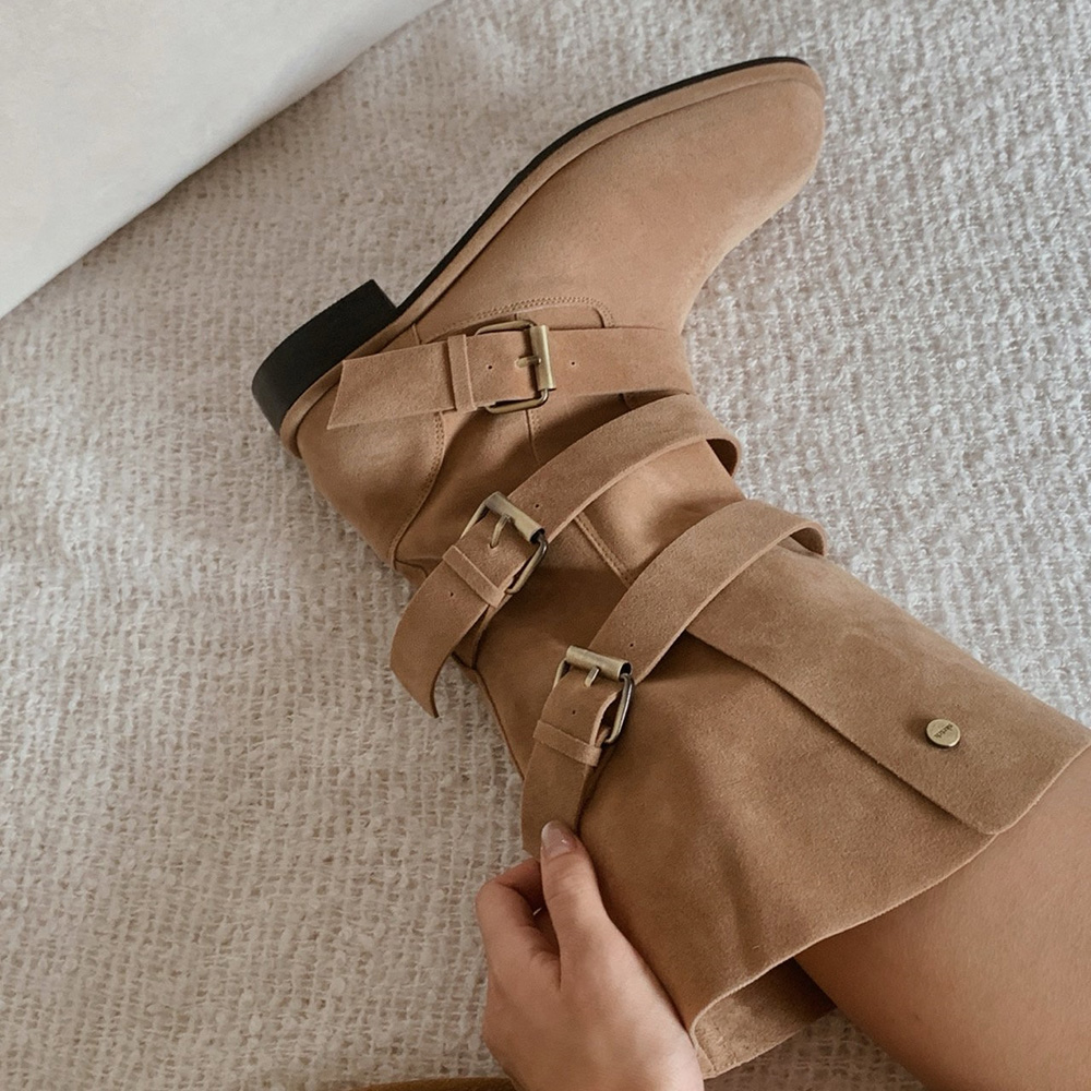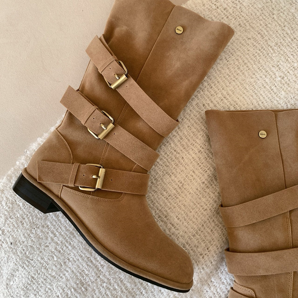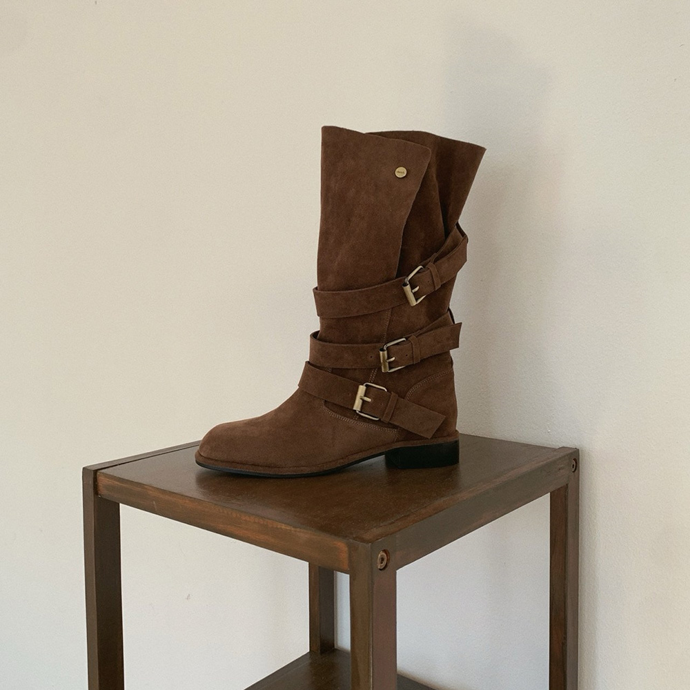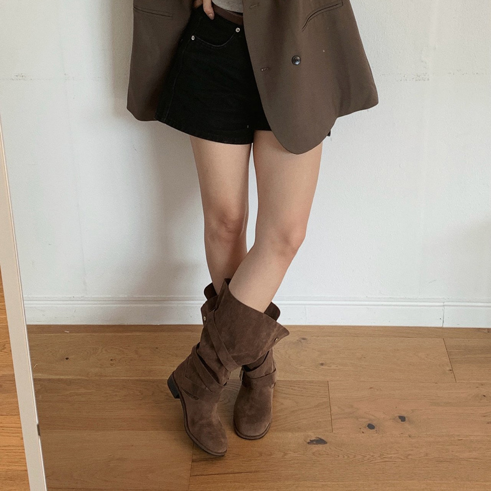 스웨이드 바이커 투웨이 벨트 여자 미디 하프 미들부츠