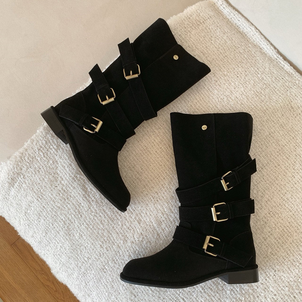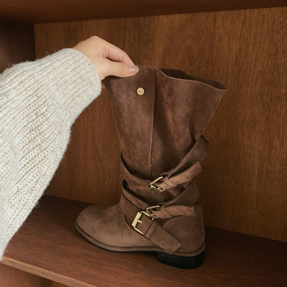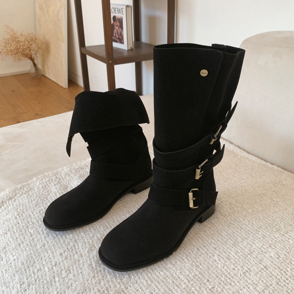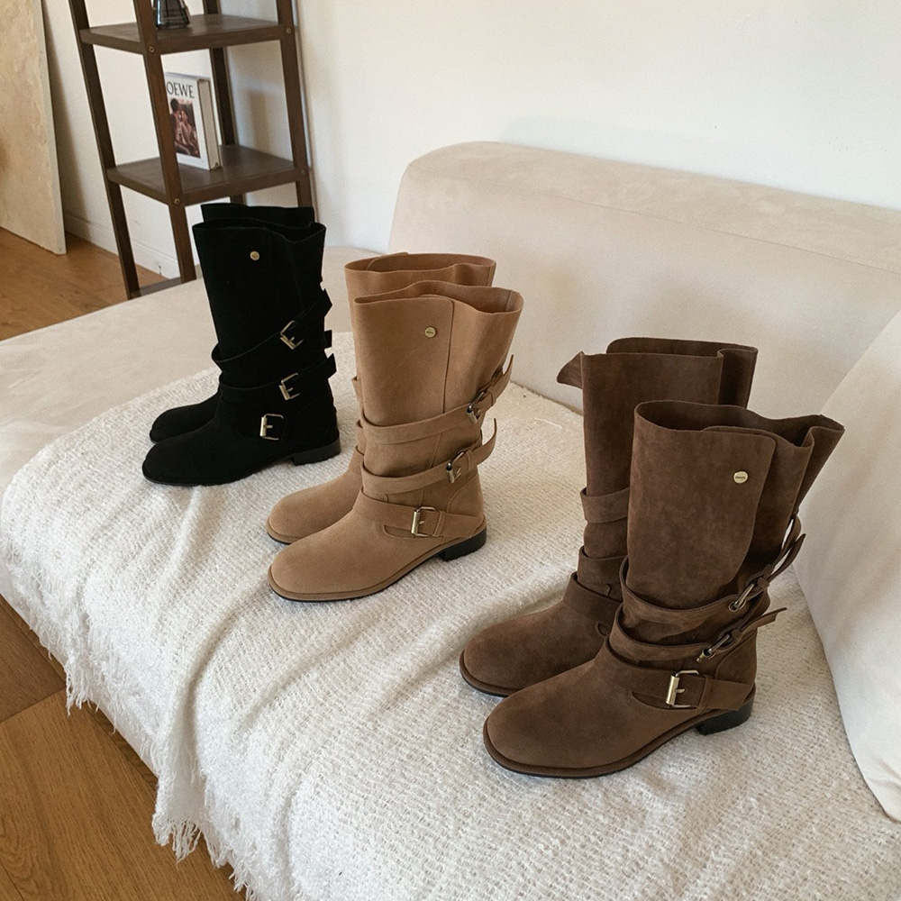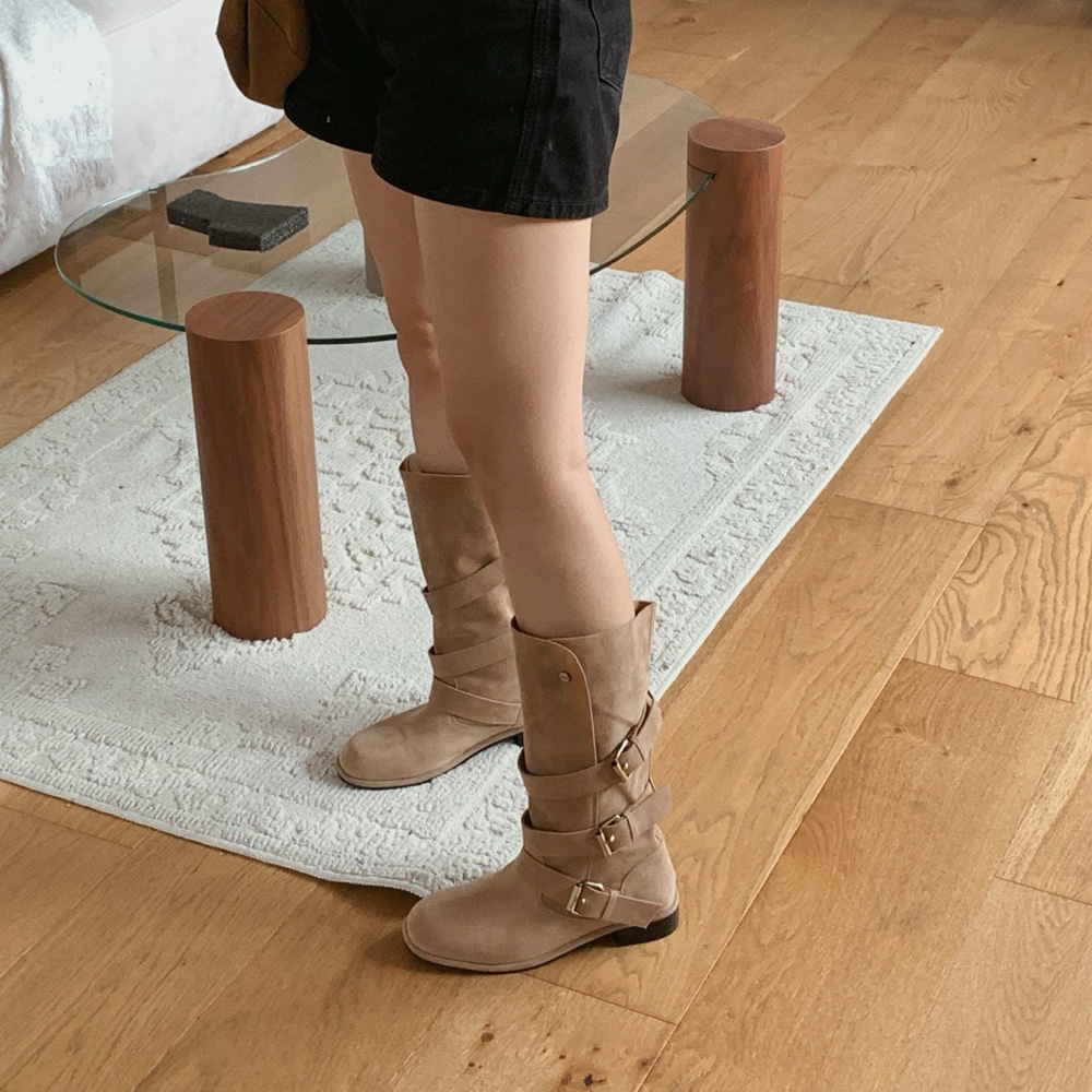 스웨이드 바이커 투웨이 벨트 여자 미디 하프 미들부츠