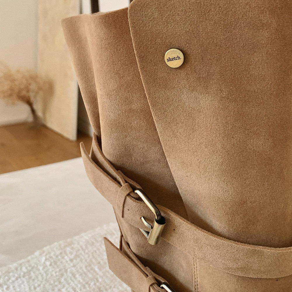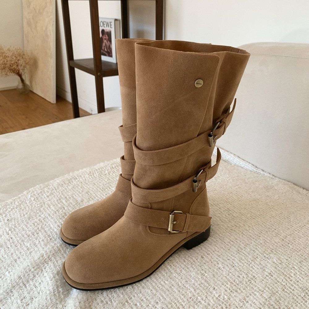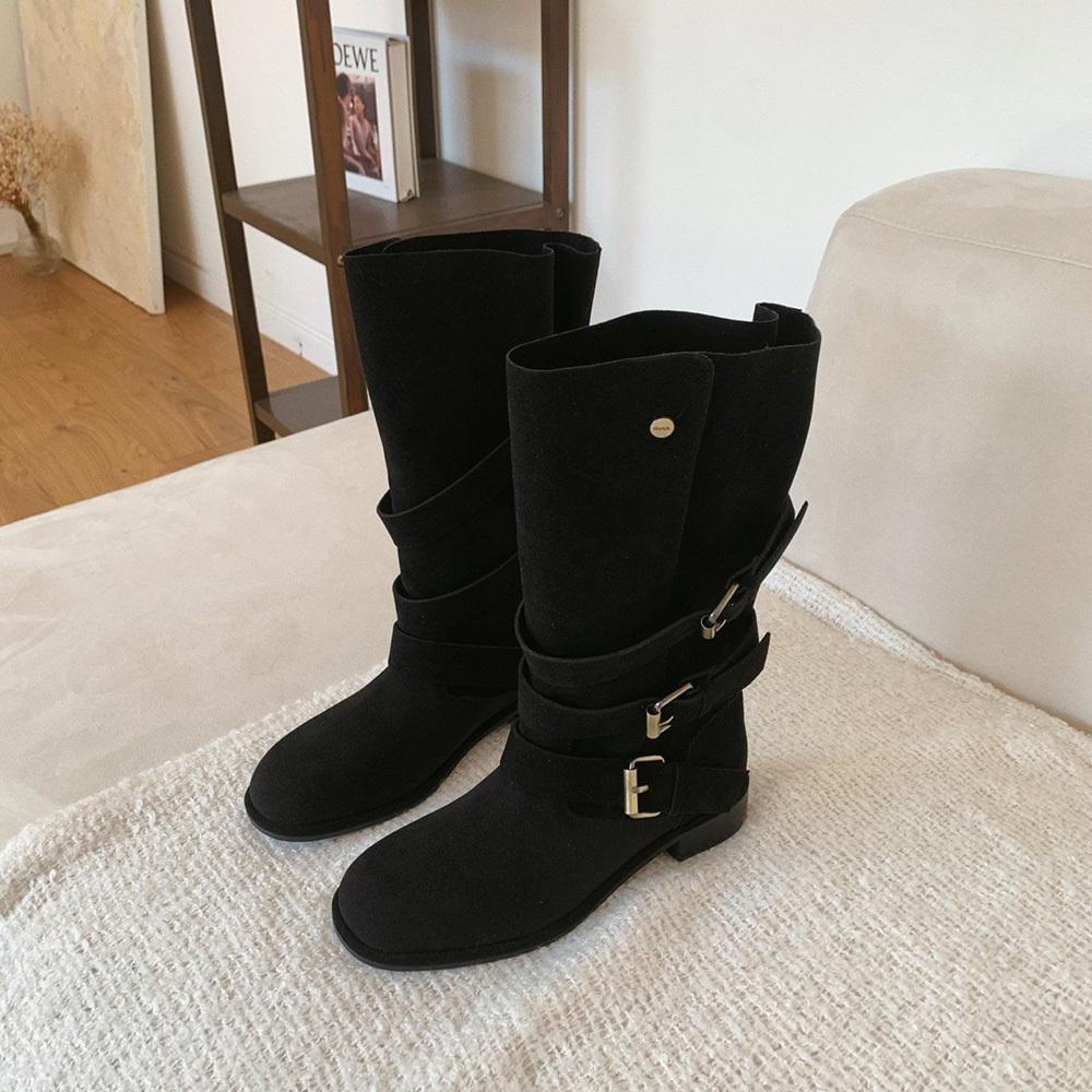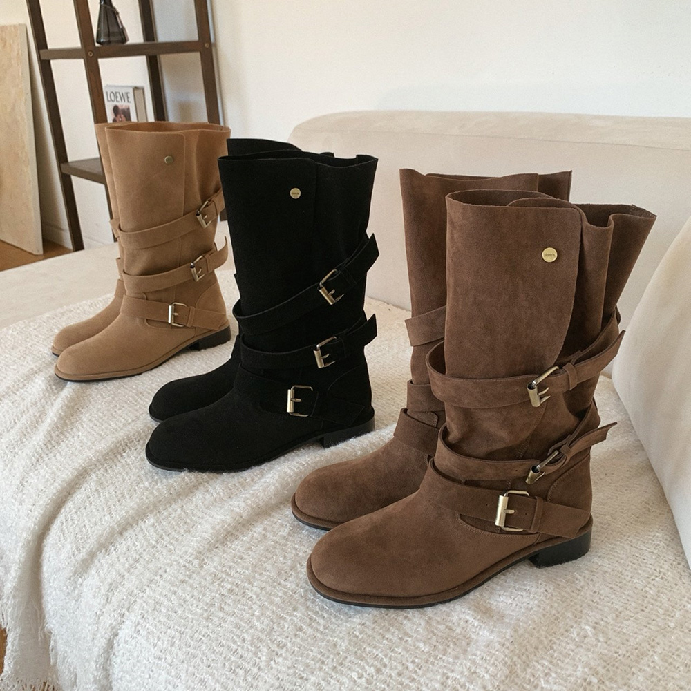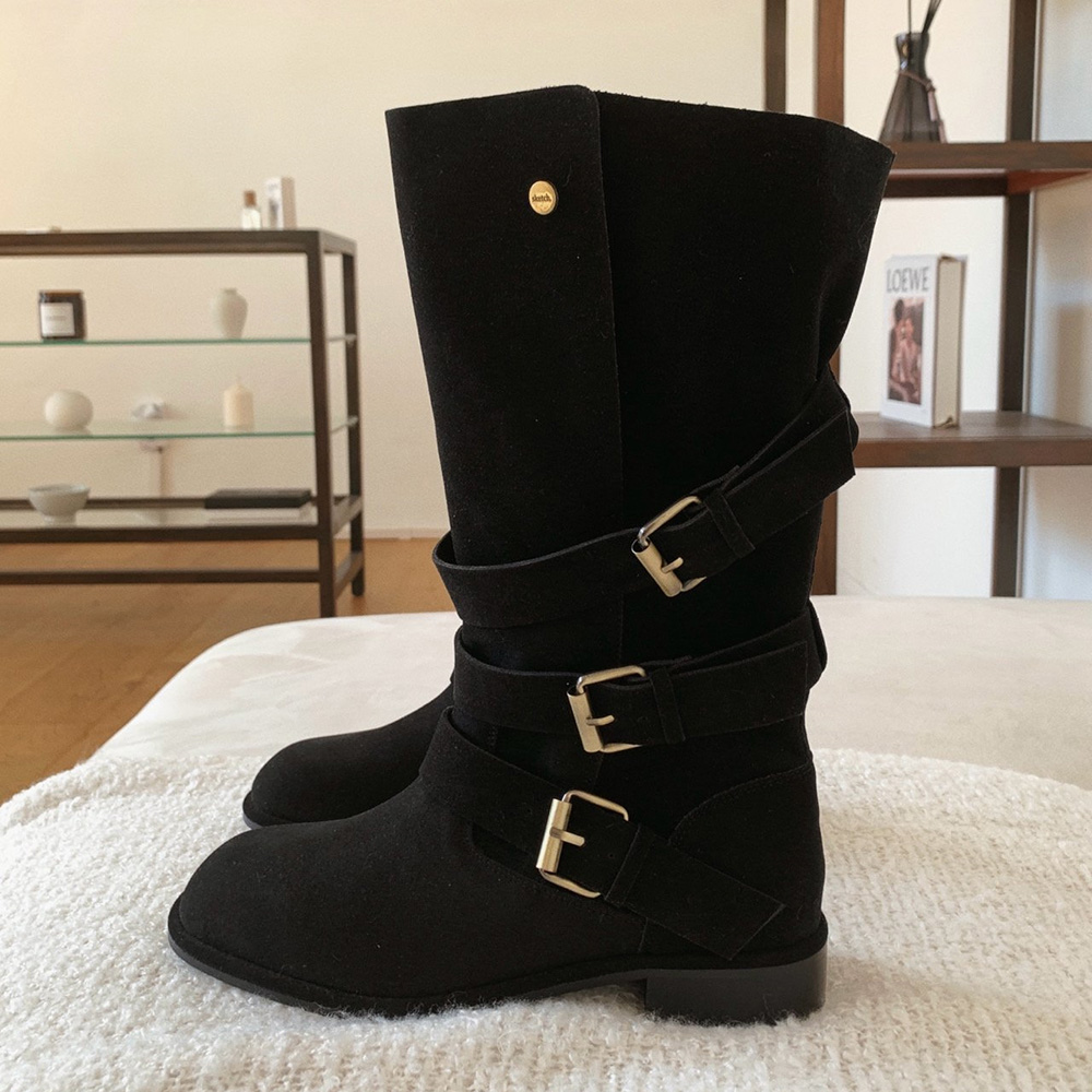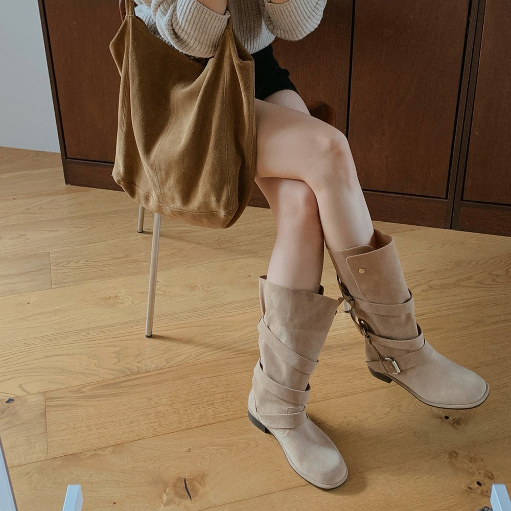 스웨이드 바이커 투웨이 벨트 여자 미디 하프 미들부츠