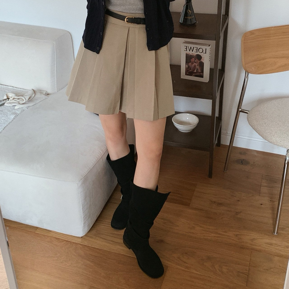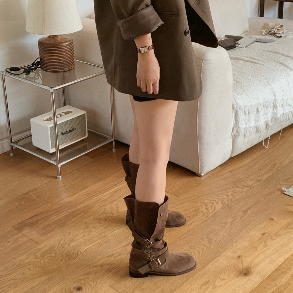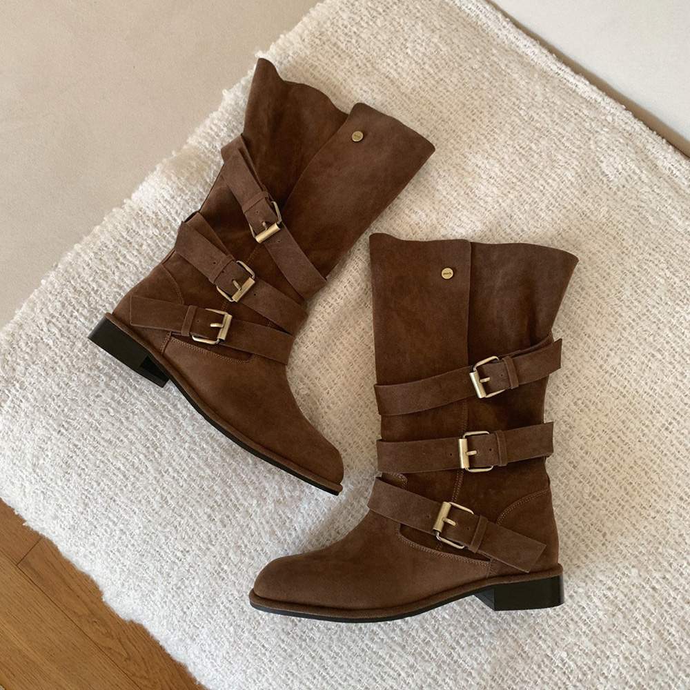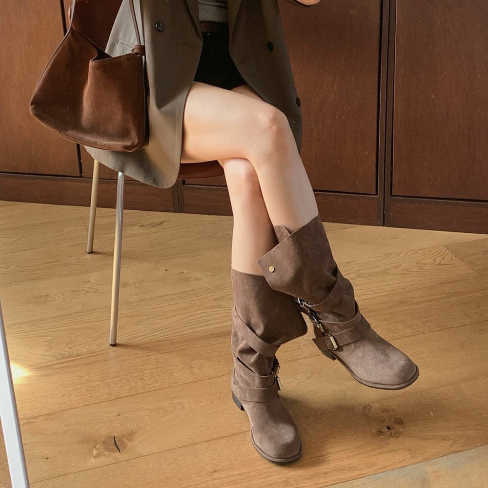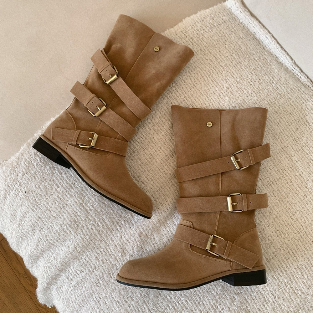 스웨이드 바이커 투웨이 벨트 여자 미디 하프 미들부츠