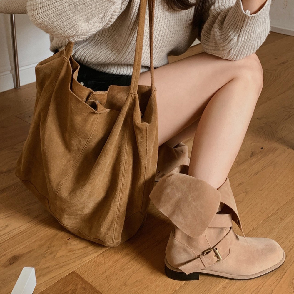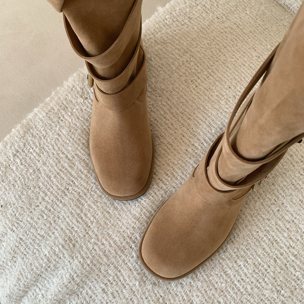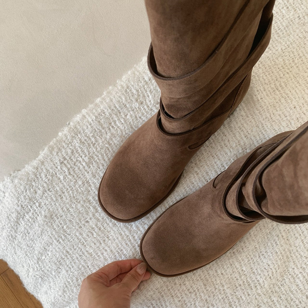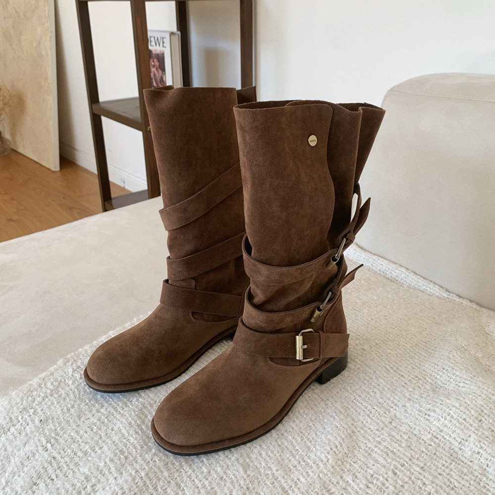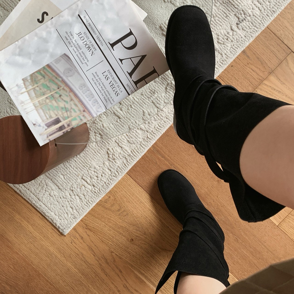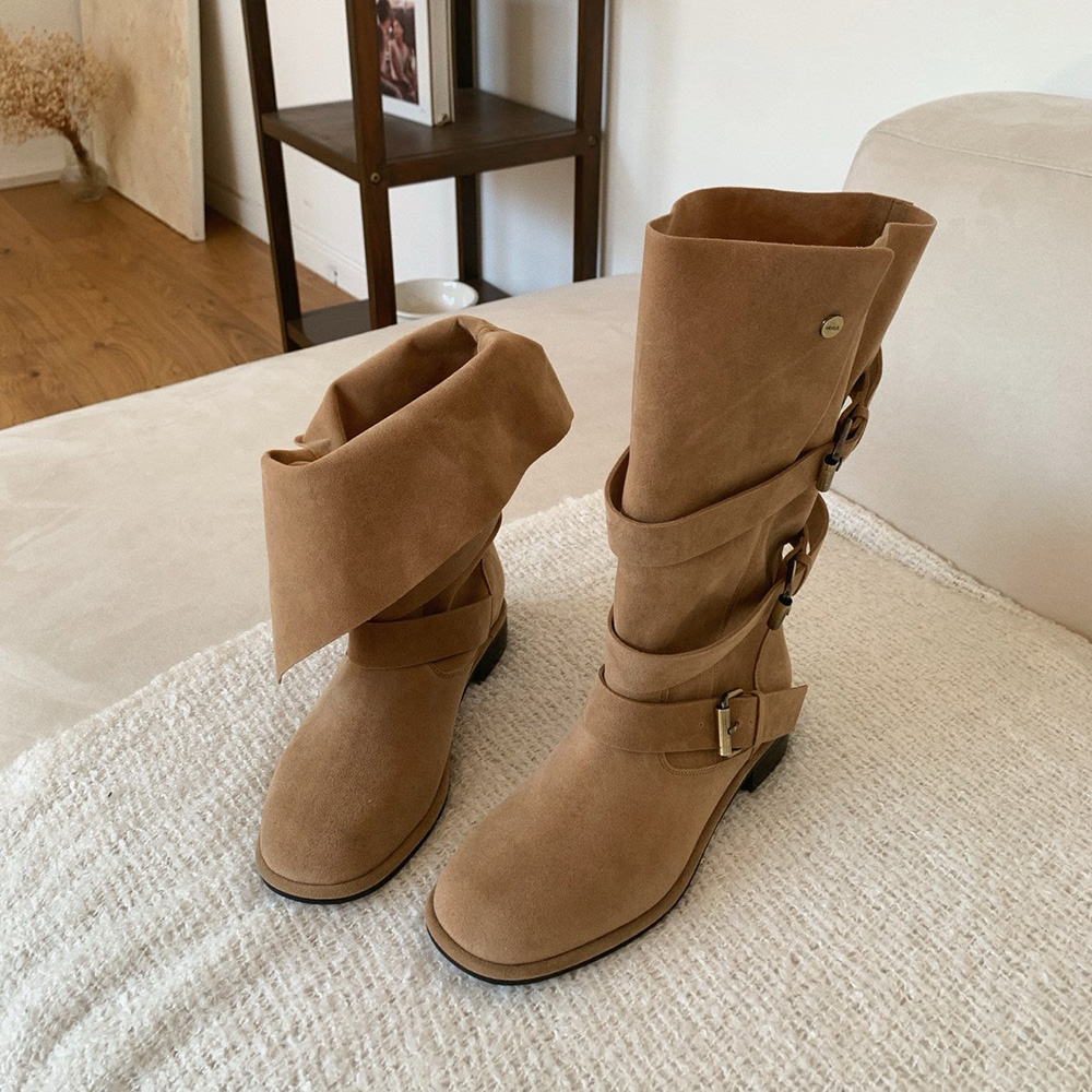 스웨이드 바이커 투웨이 벨트 여자 미디 하프 미들부츠