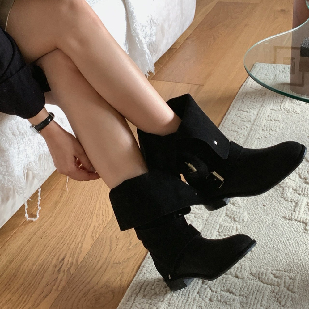 투웨이 벨트 스웨이드 바이커 미디 하프 여자 미들부츠
