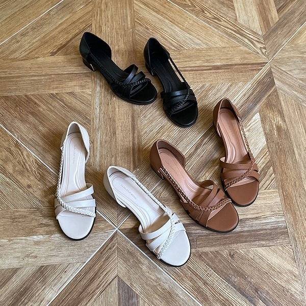 - 라운드토 꼬임 스트랩 사이드 오픈 천연 소가죽 여름 플랫슈즈