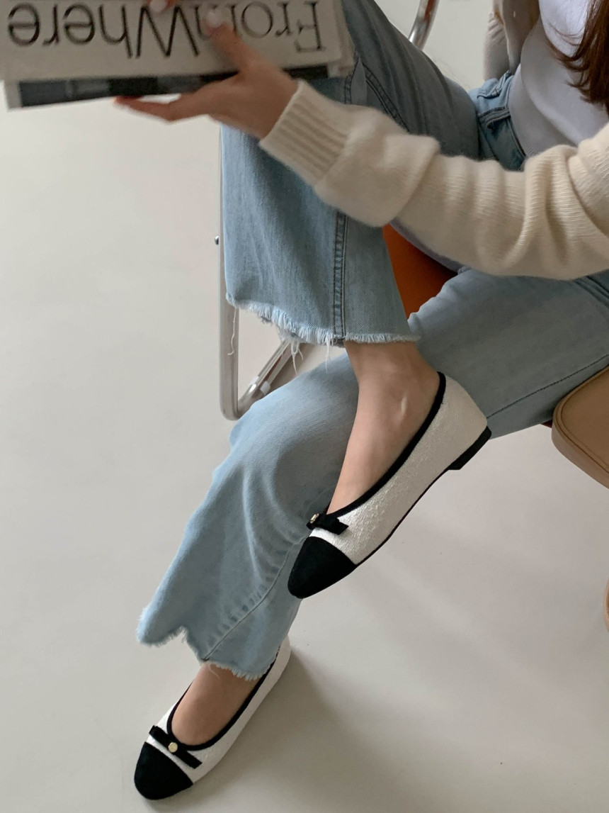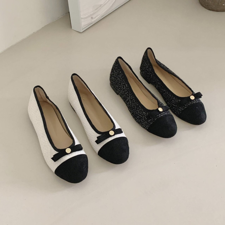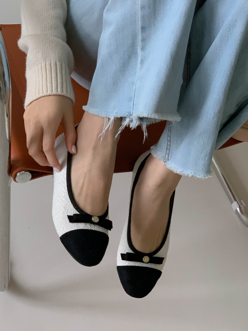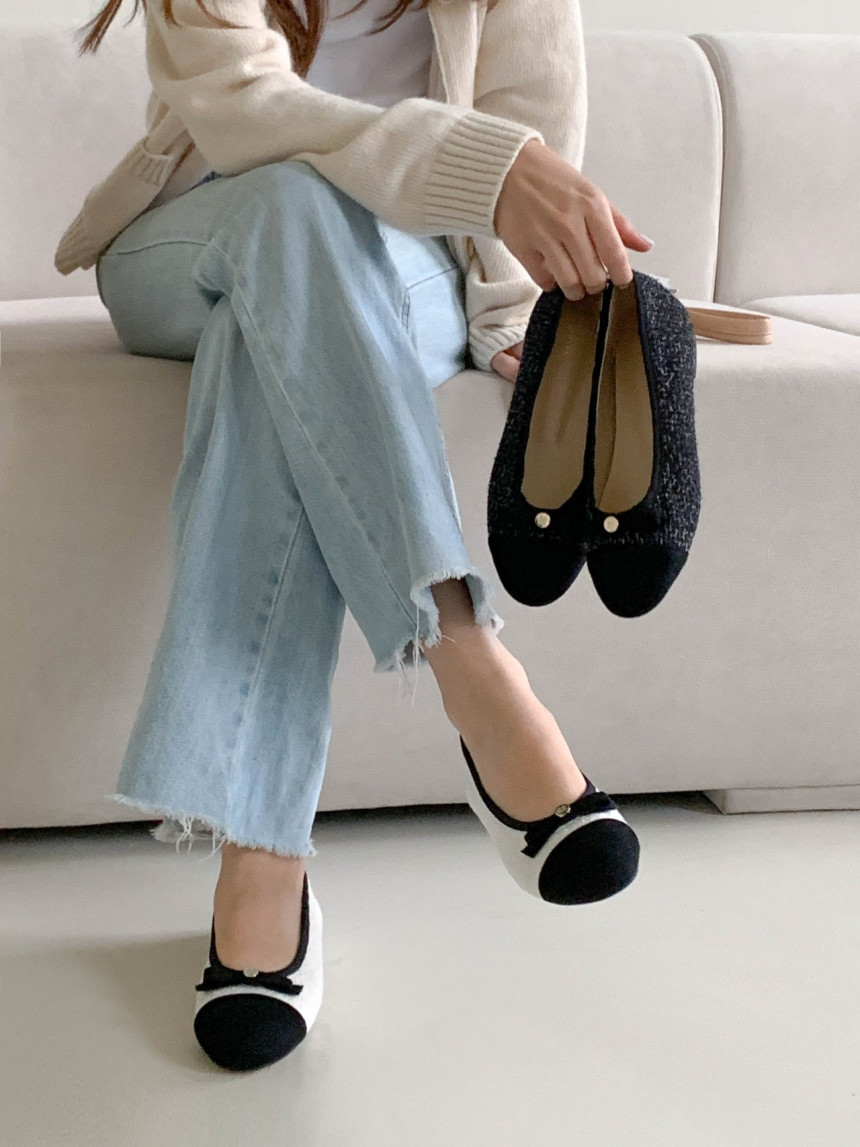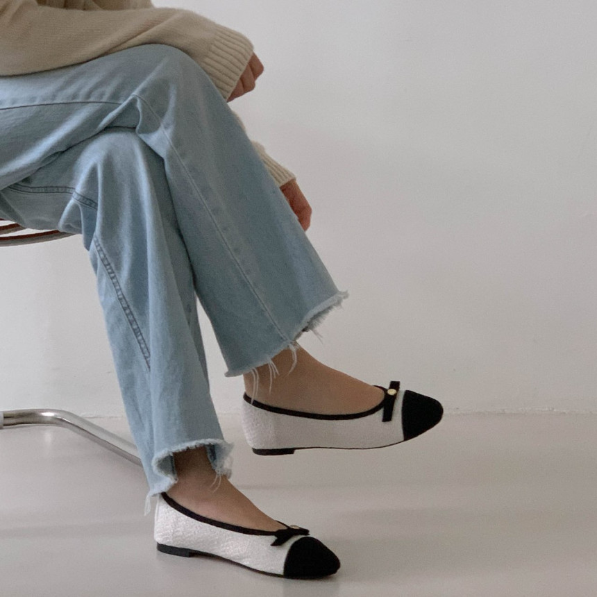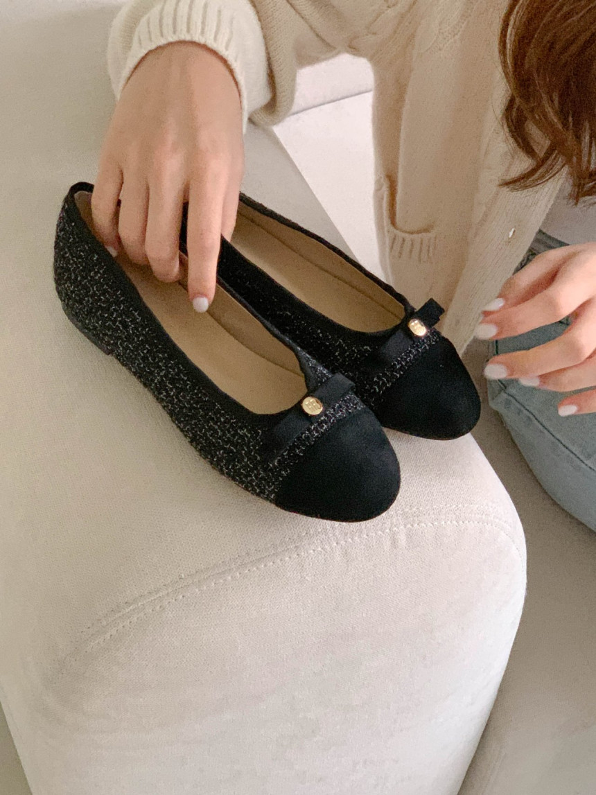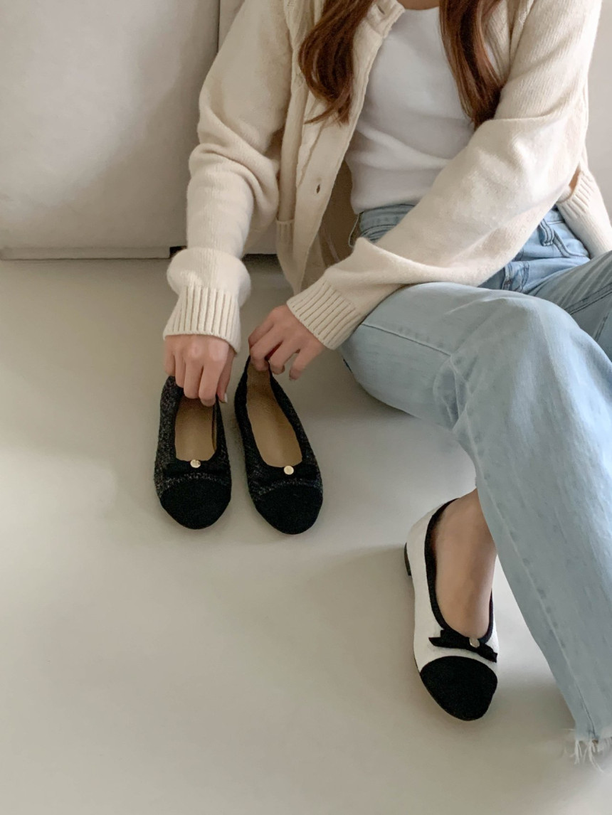 투톤 콤비 라운드토 트위드 여자 리본 플랫슈즈