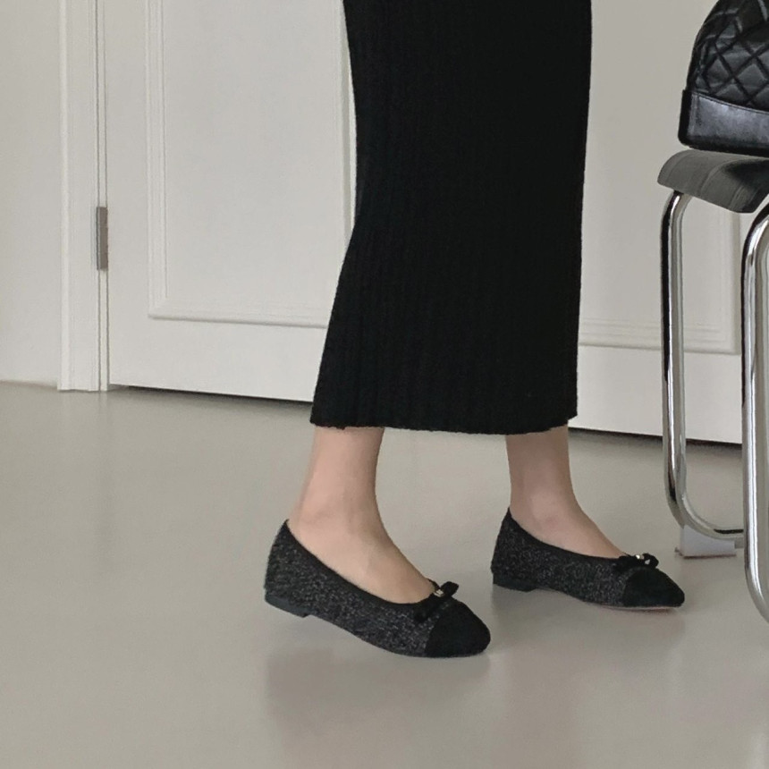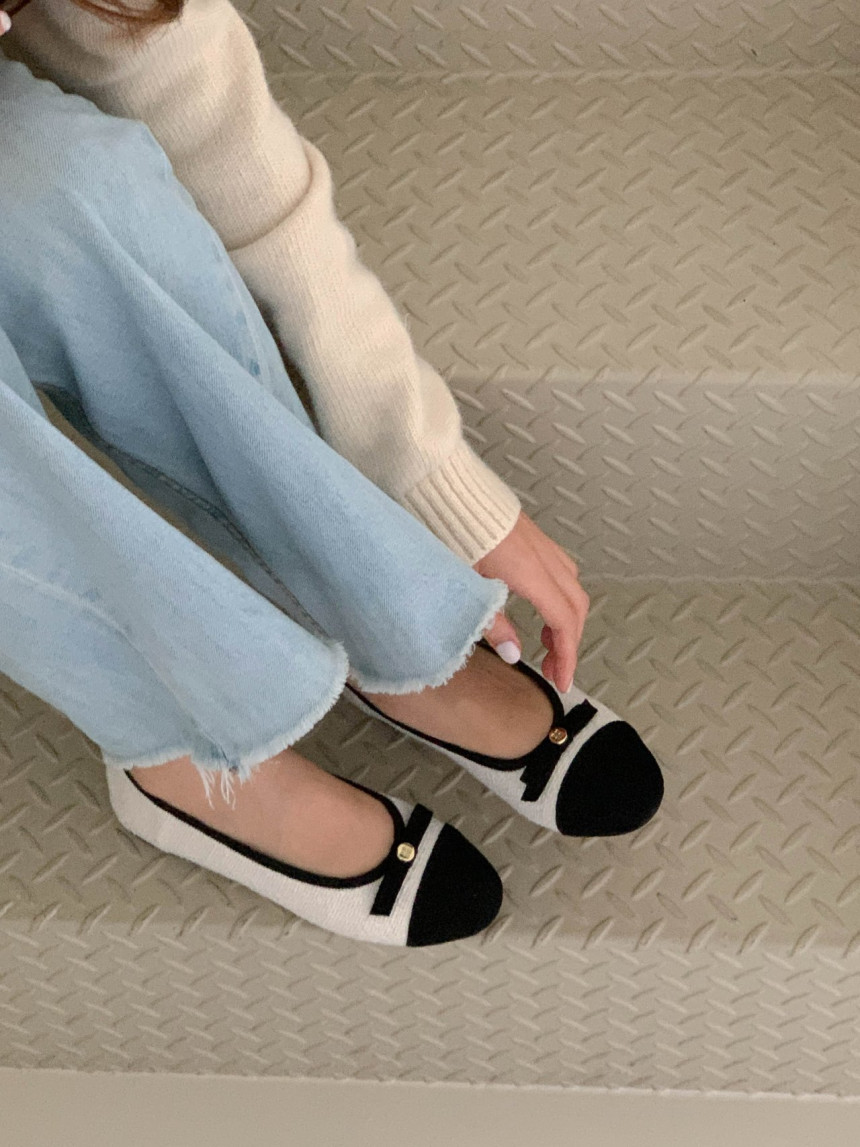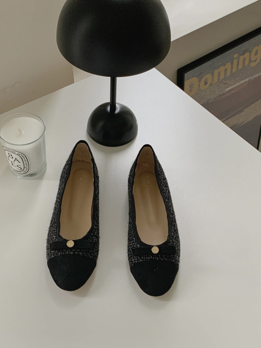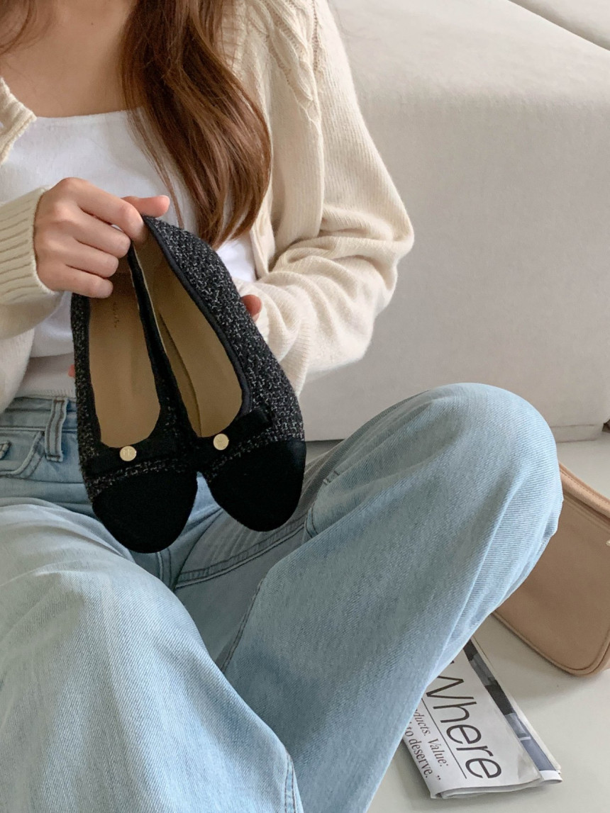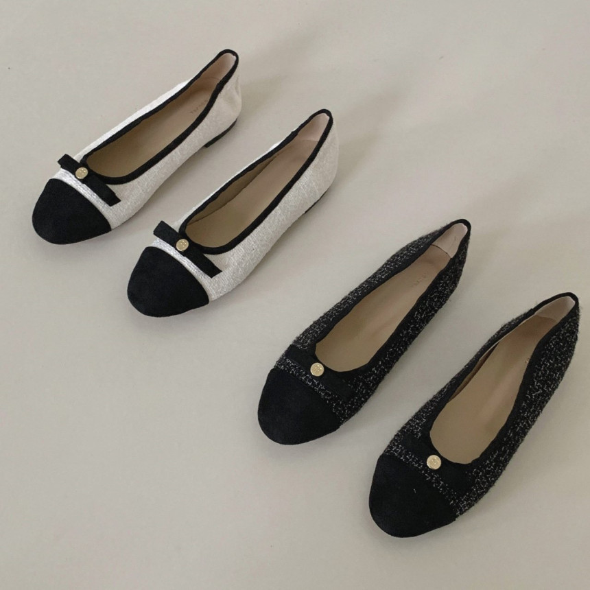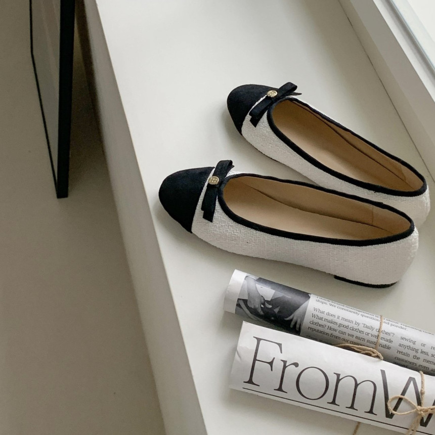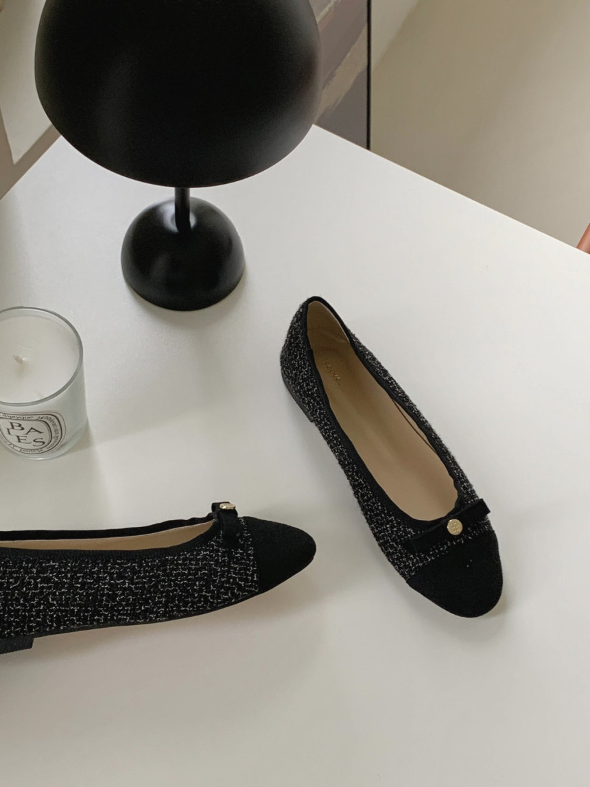 투톤 콤비 라운드토 트위드 여자 리본 플랫슈즈