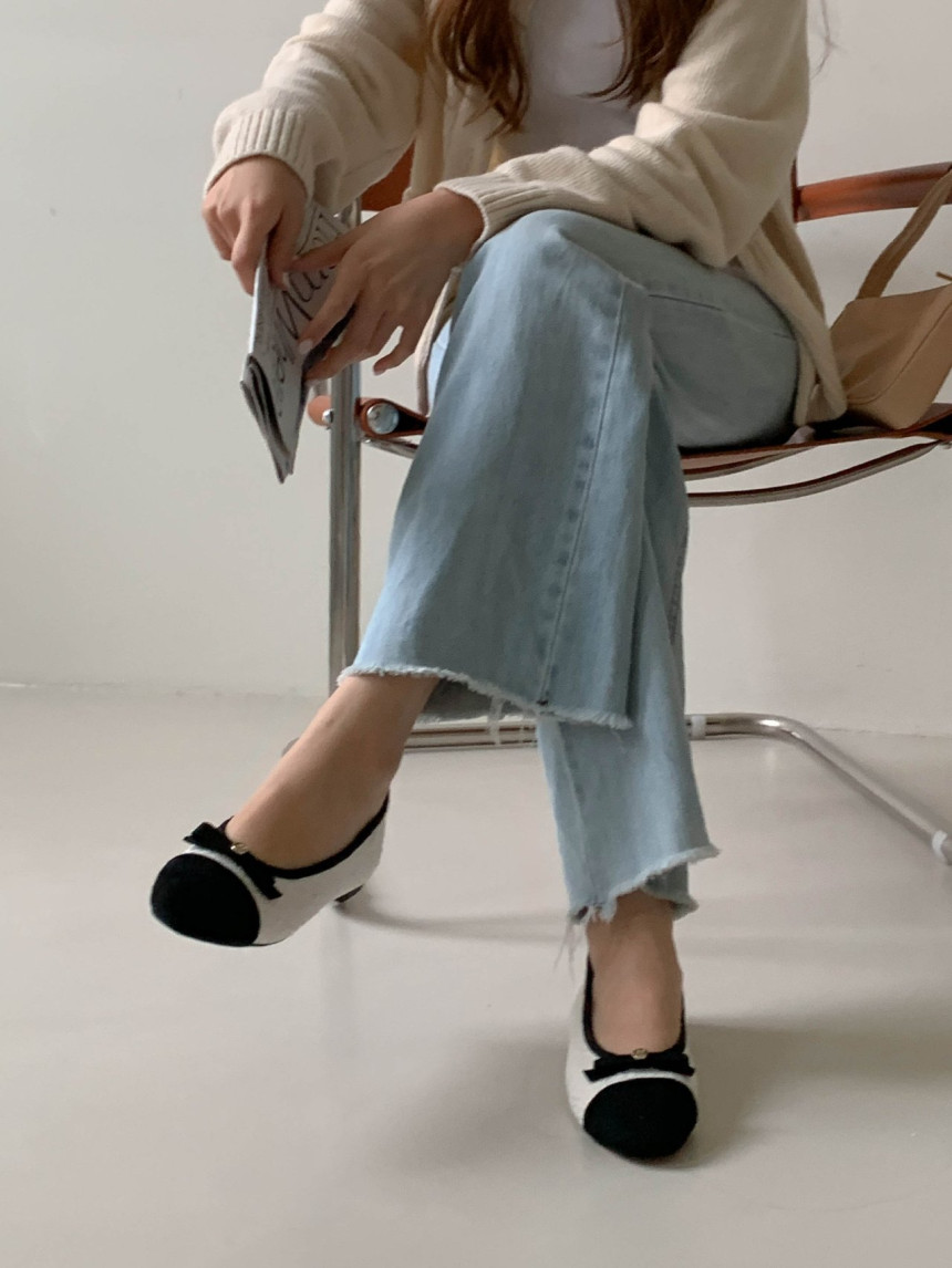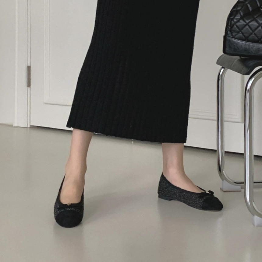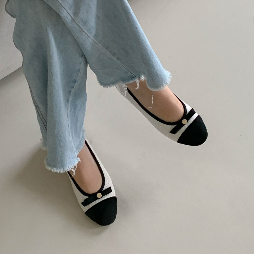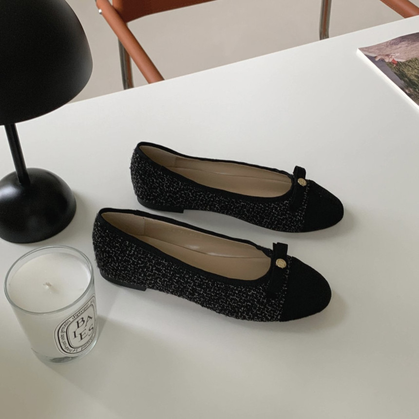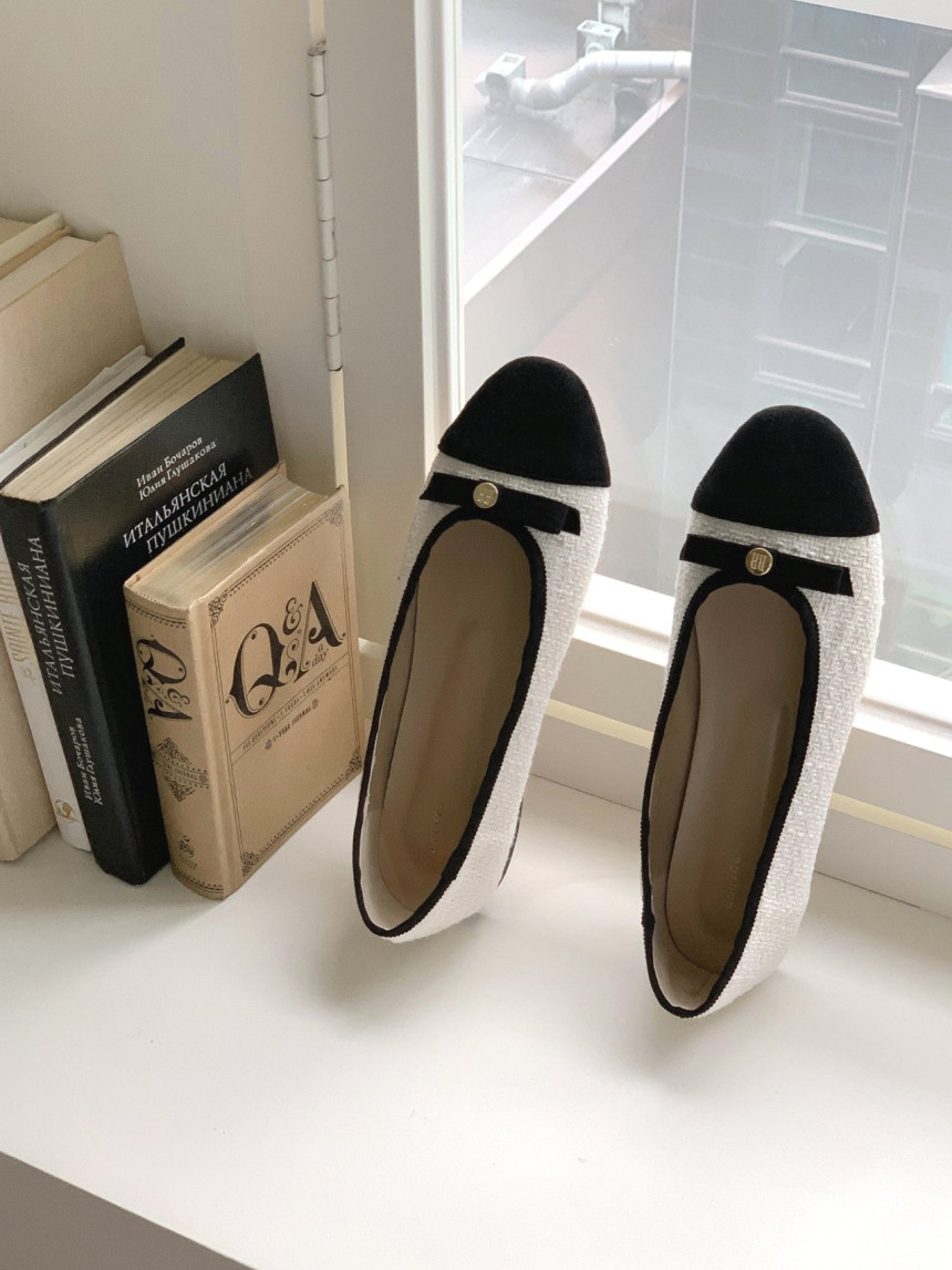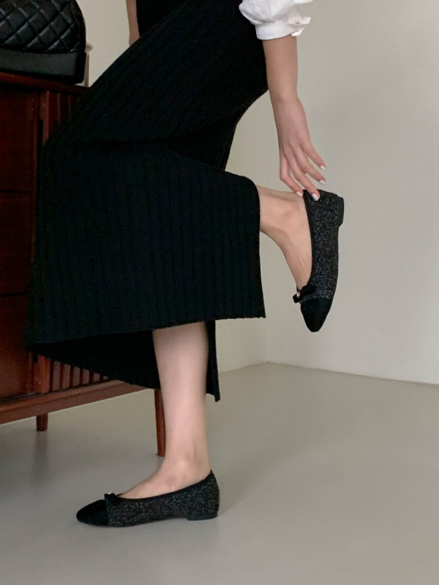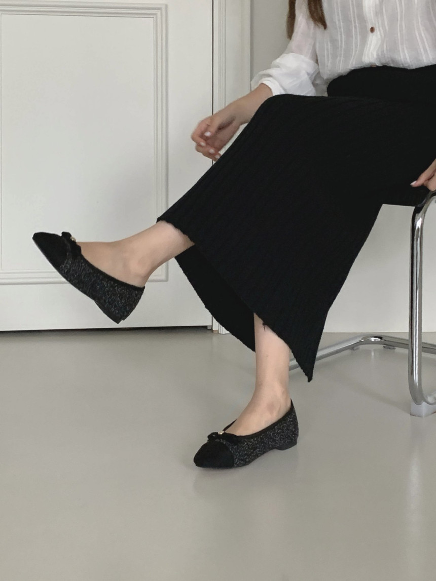 투톤 콤비 라운드토 트위드 여자 리본 플랫슈즈