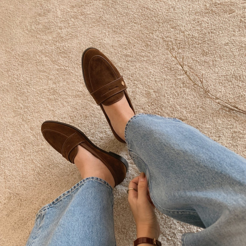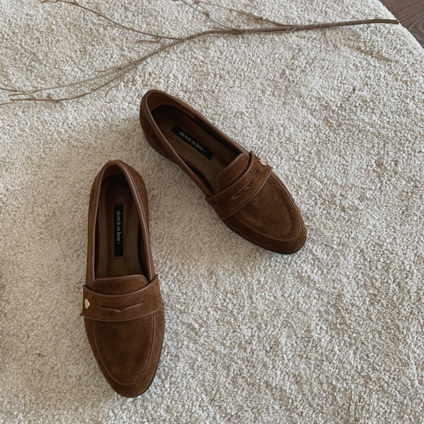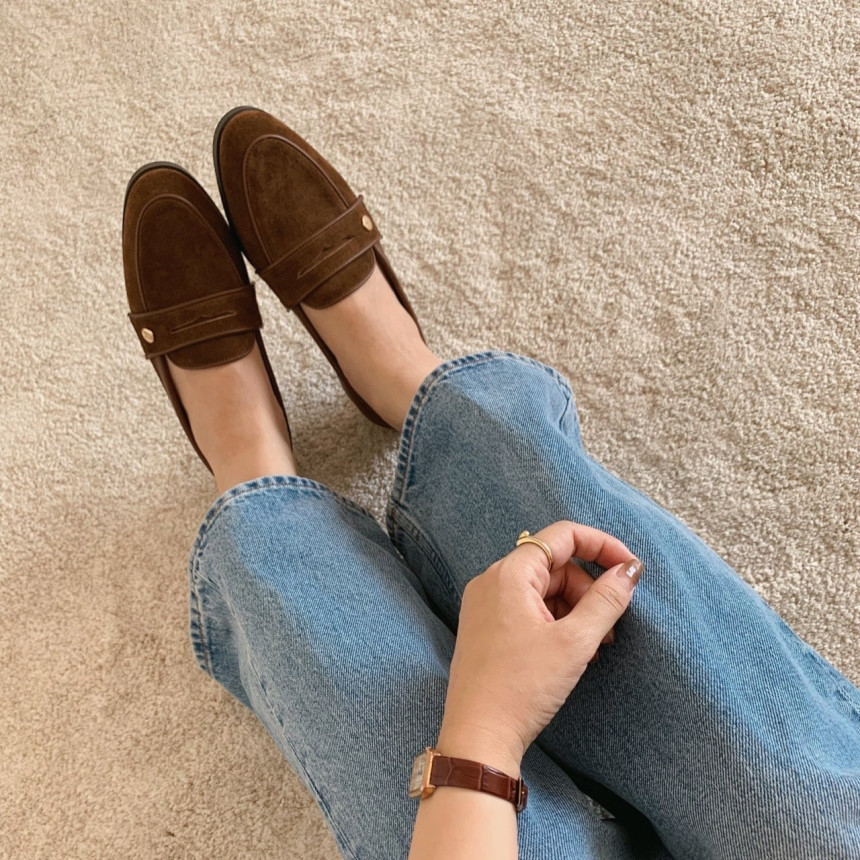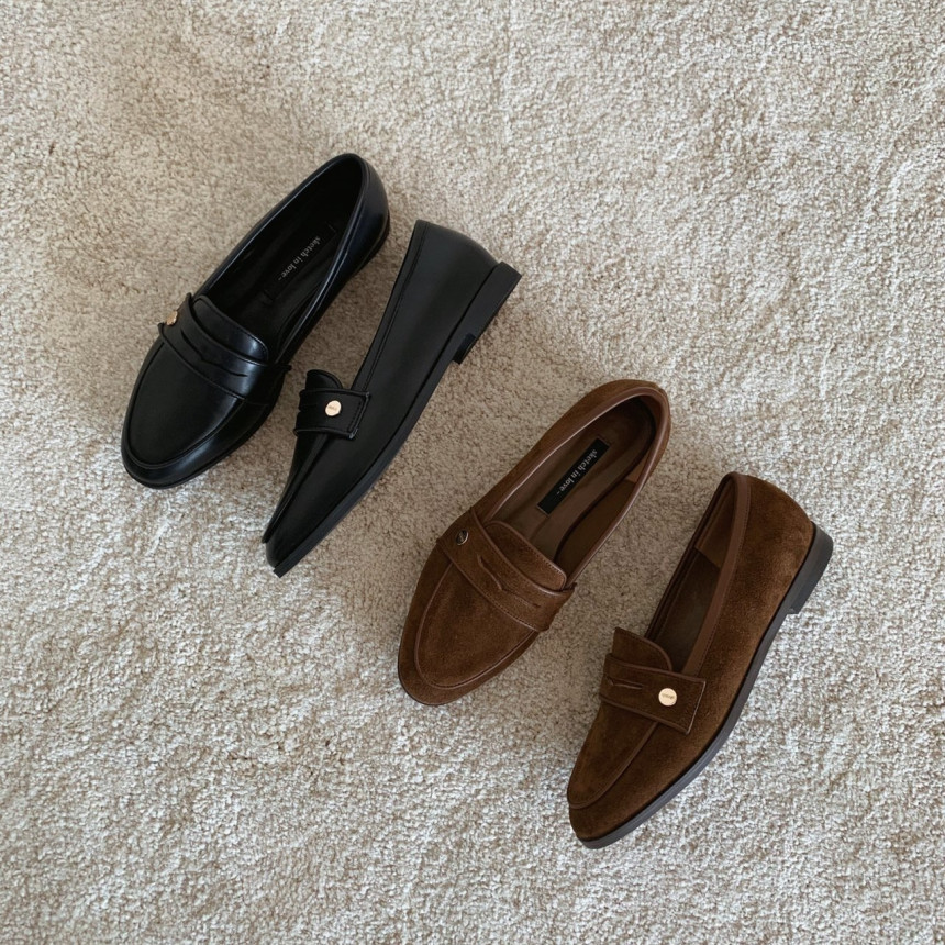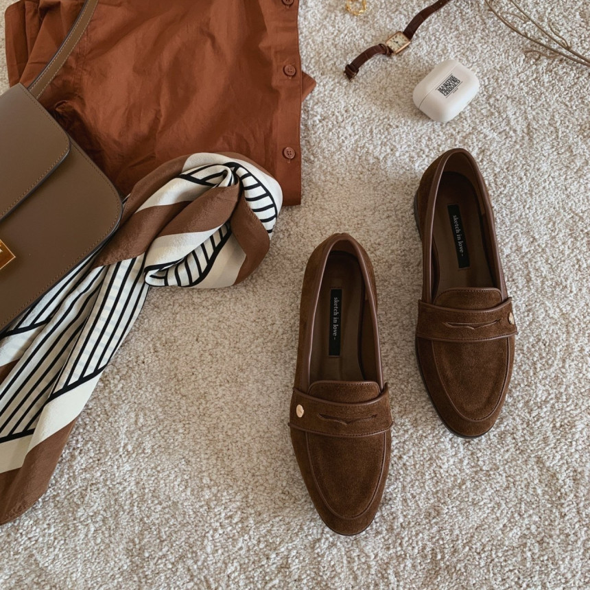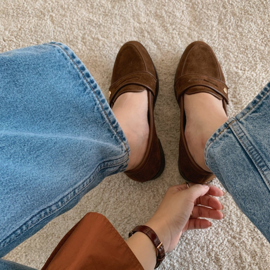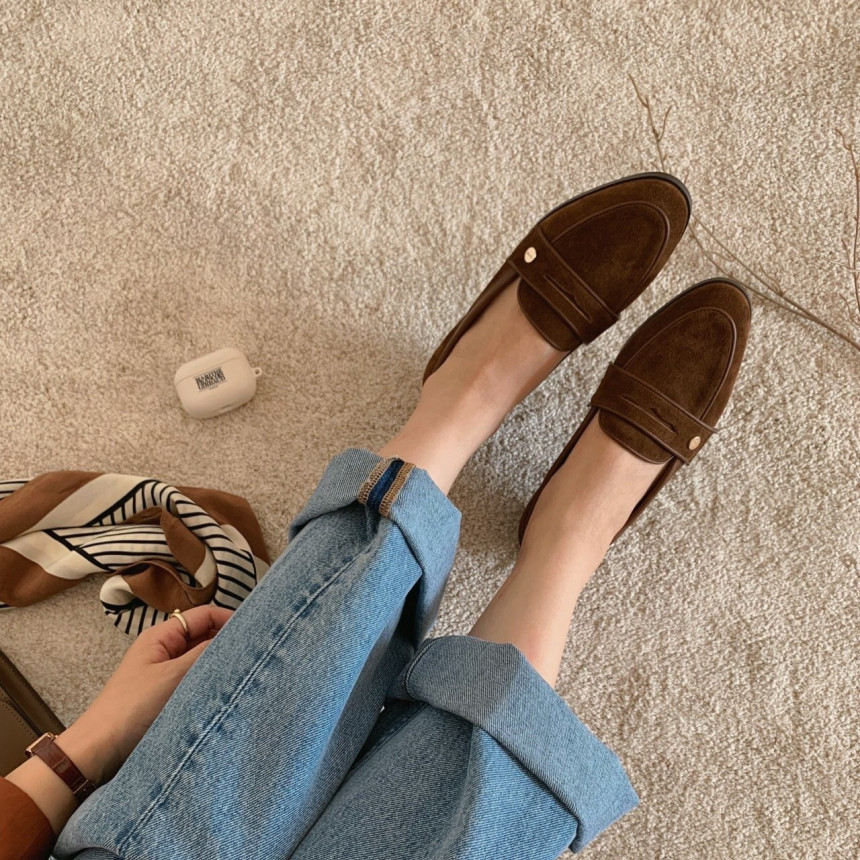 골드 버튼 로고 리얼 소가죽 스웨이드 페니 여자 로퍼