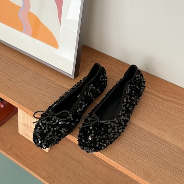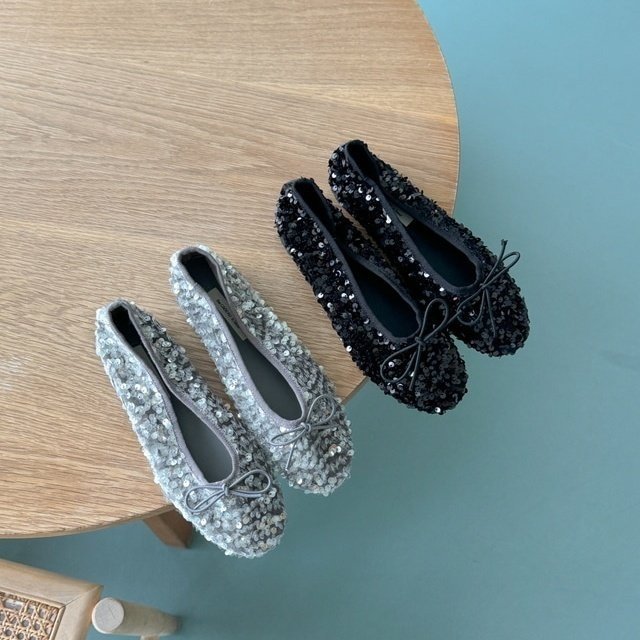 스퀘어 스팽글 반짝이 쿠션 리본 여자 플랫슈즈