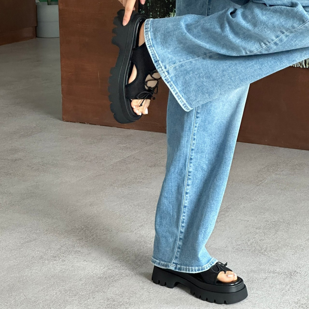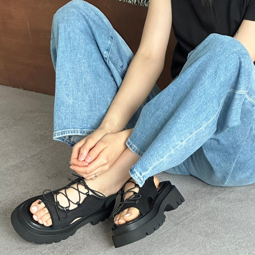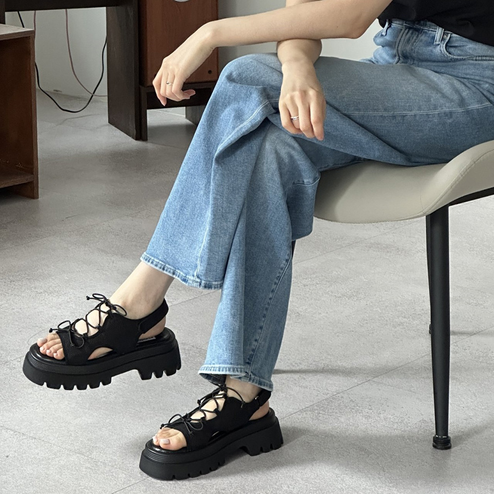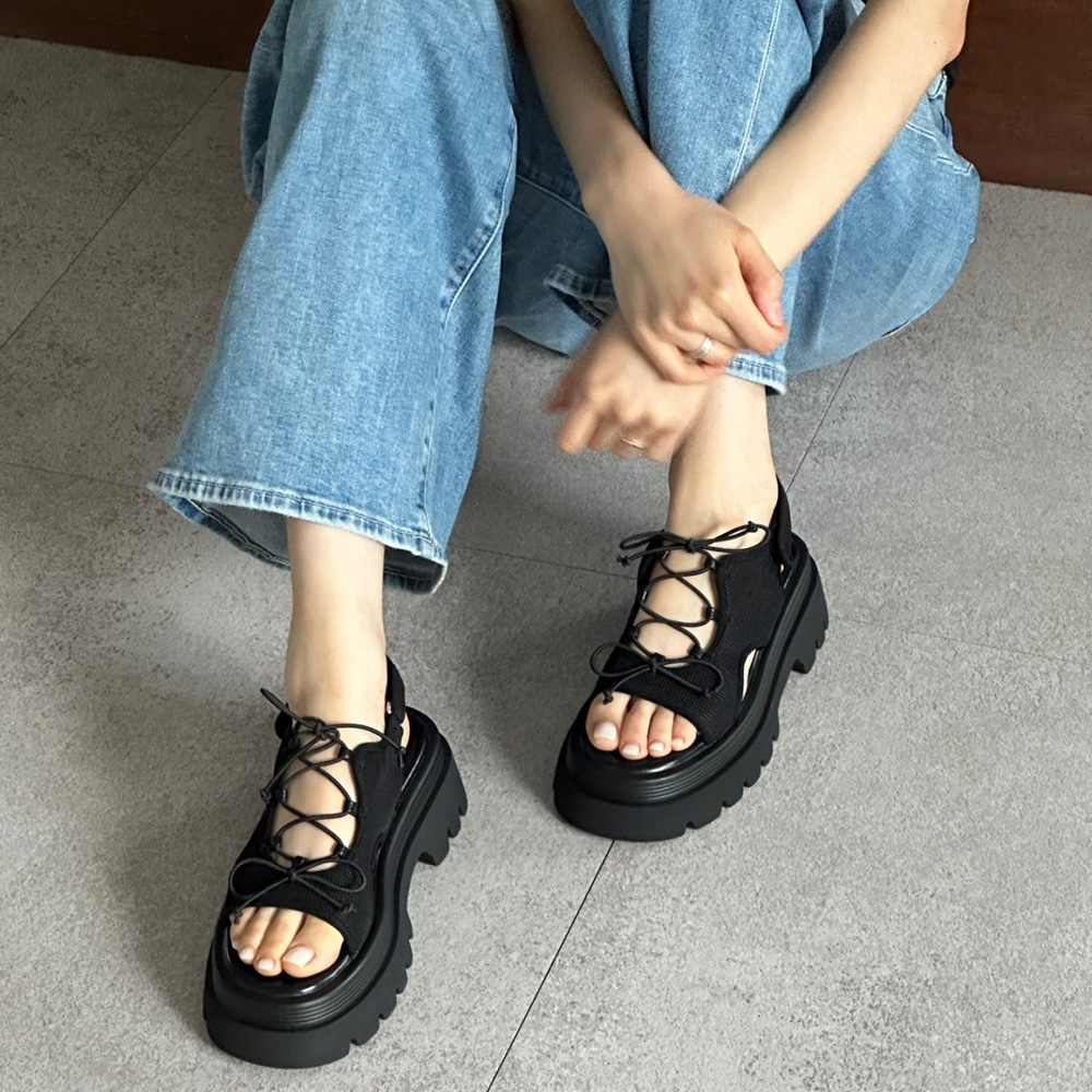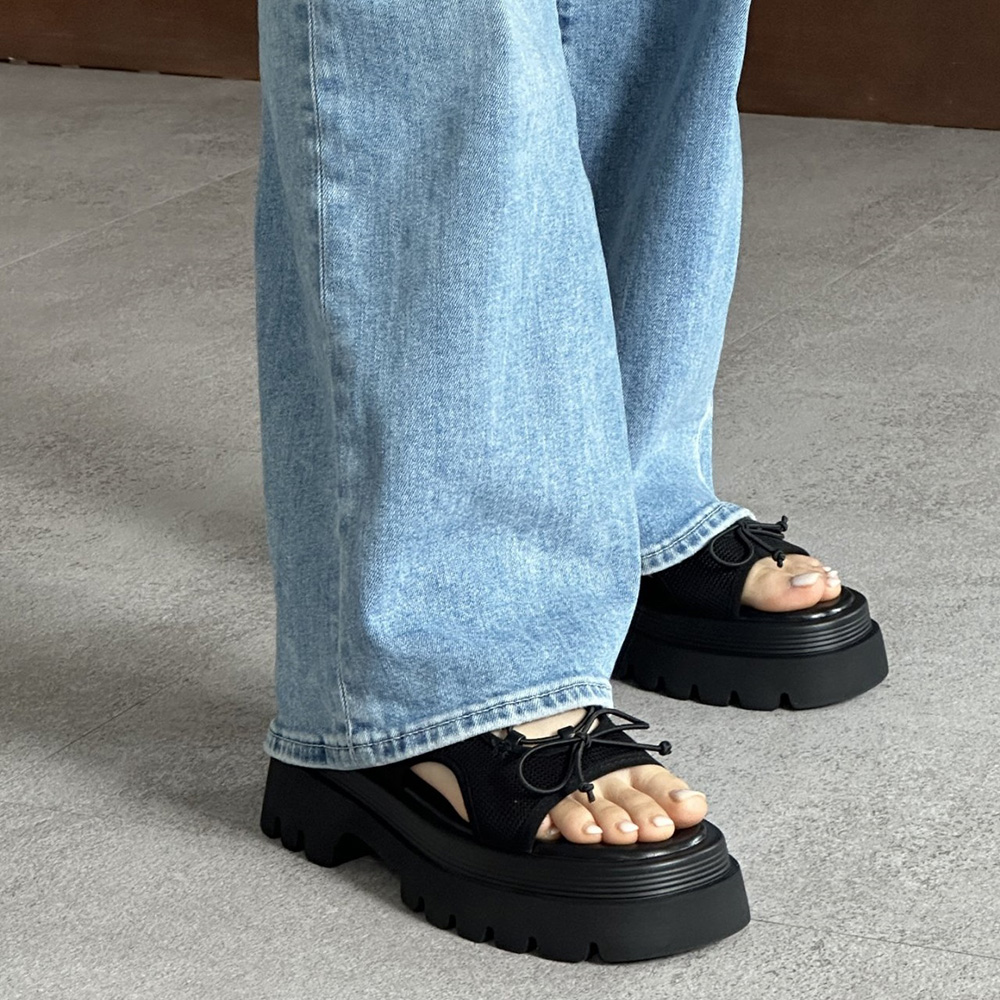 메쉬 시스루 스트랩 여름 미들힐 통굽 청키굽 여자 샌들