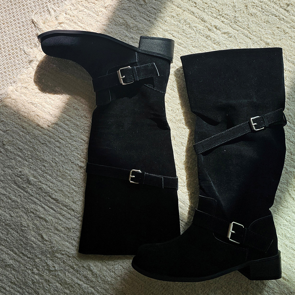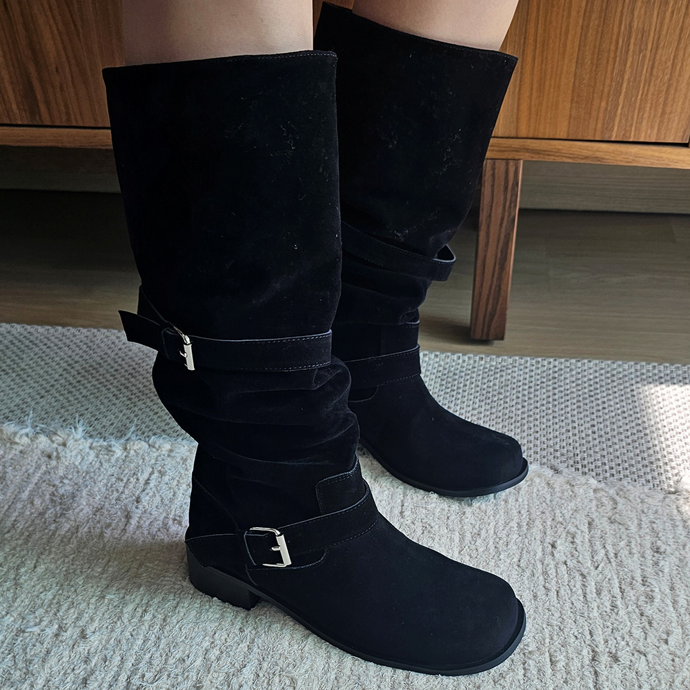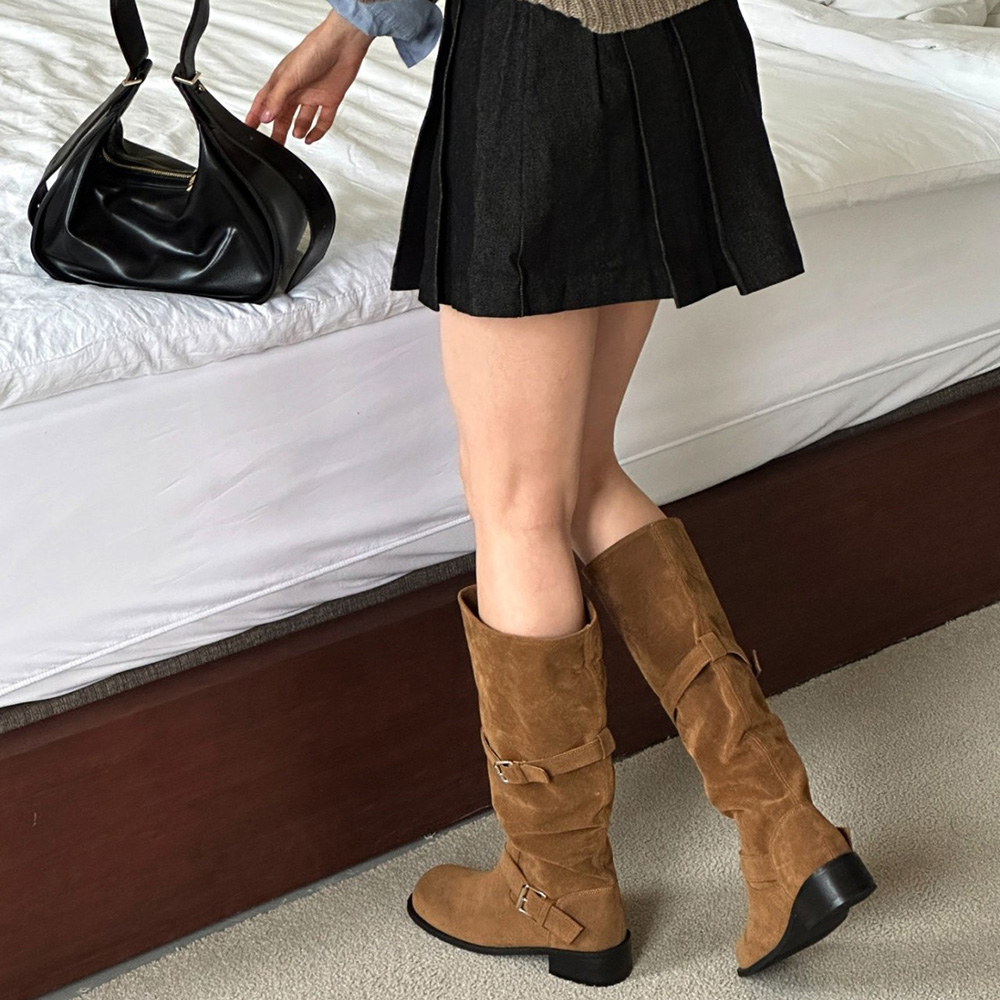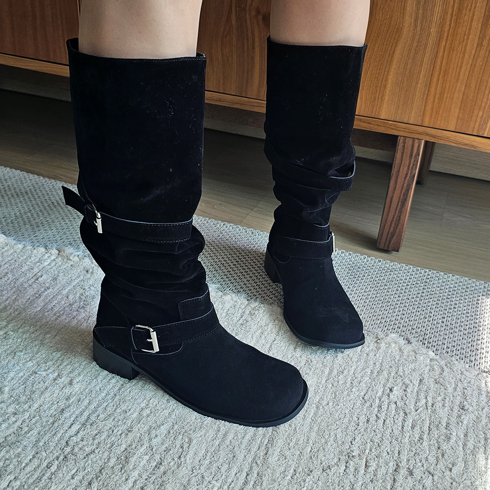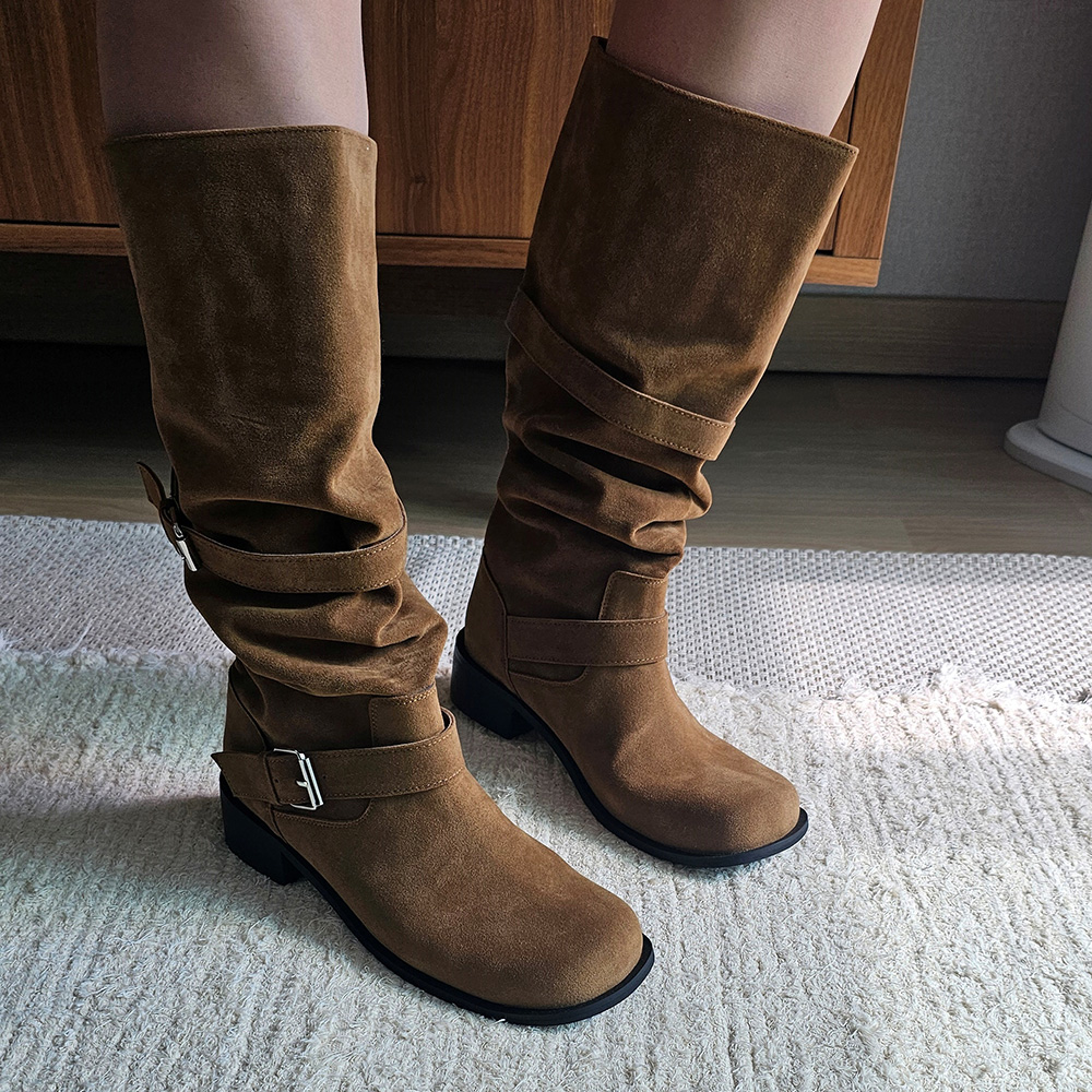 스웨이드 투웨이 벨트 바이커부츠 미들힐 여자 롱부츠