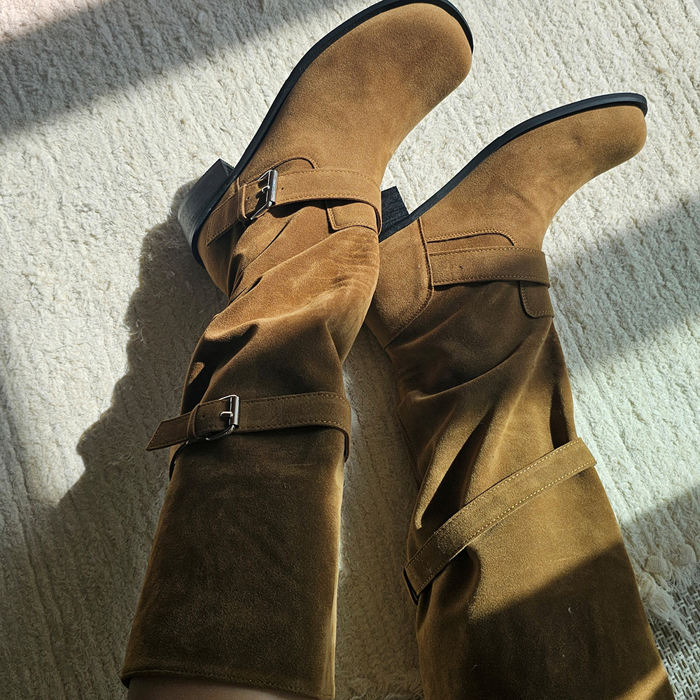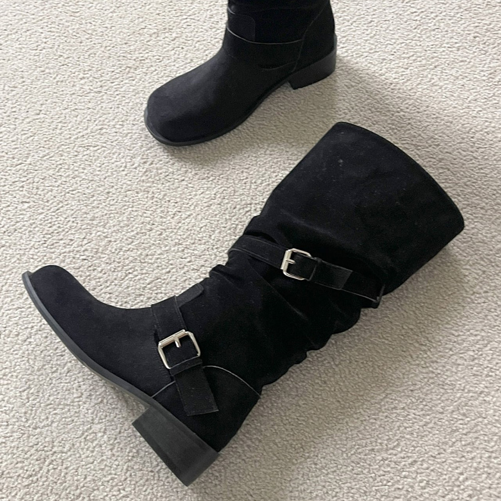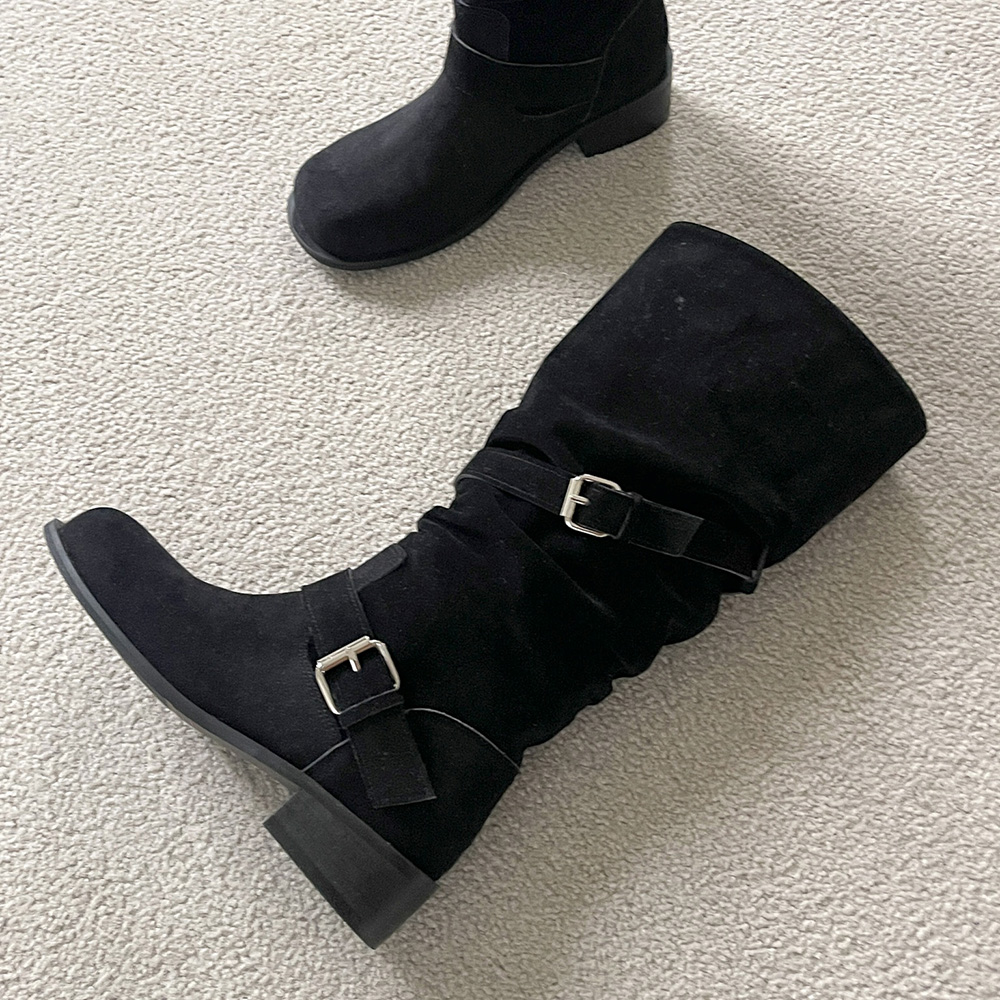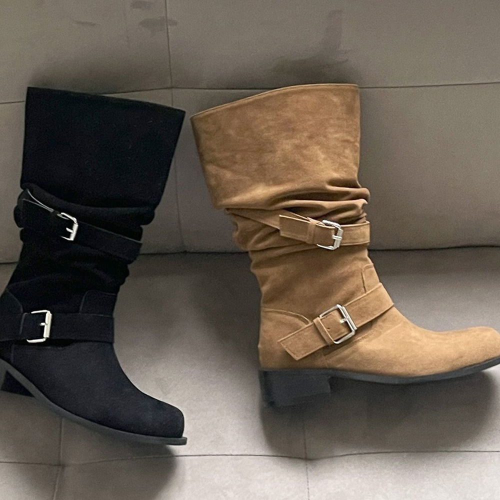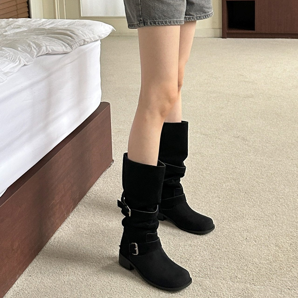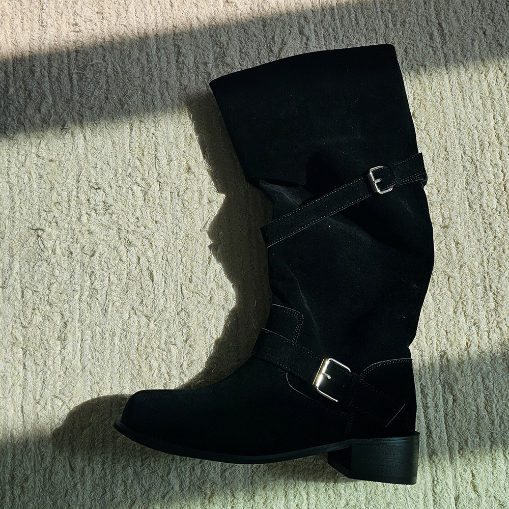 스웨이드 투웨이 벨트 바이커부츠 미들힐 여자 롱부츠