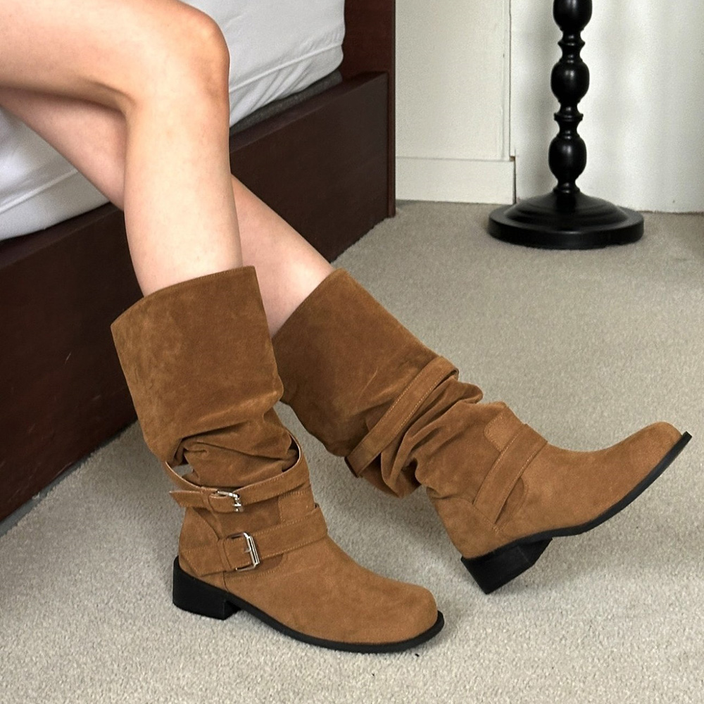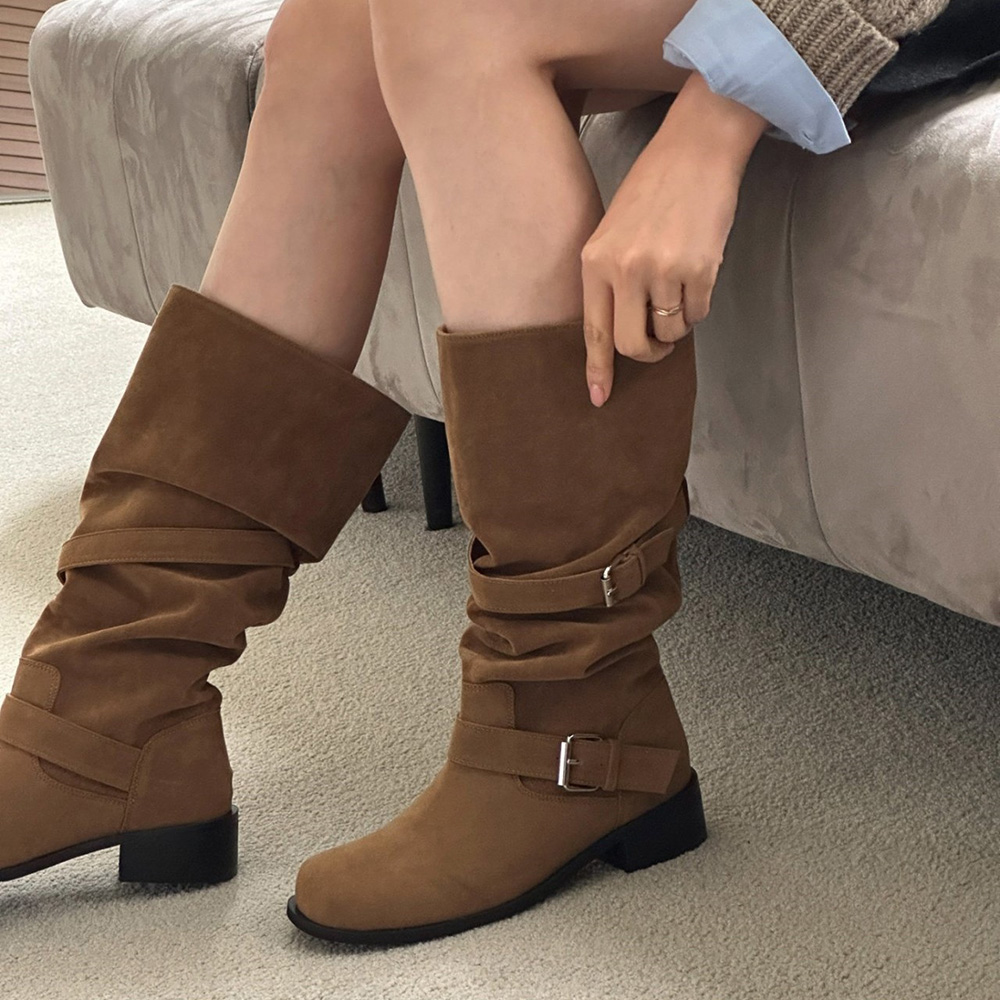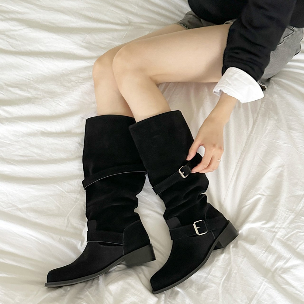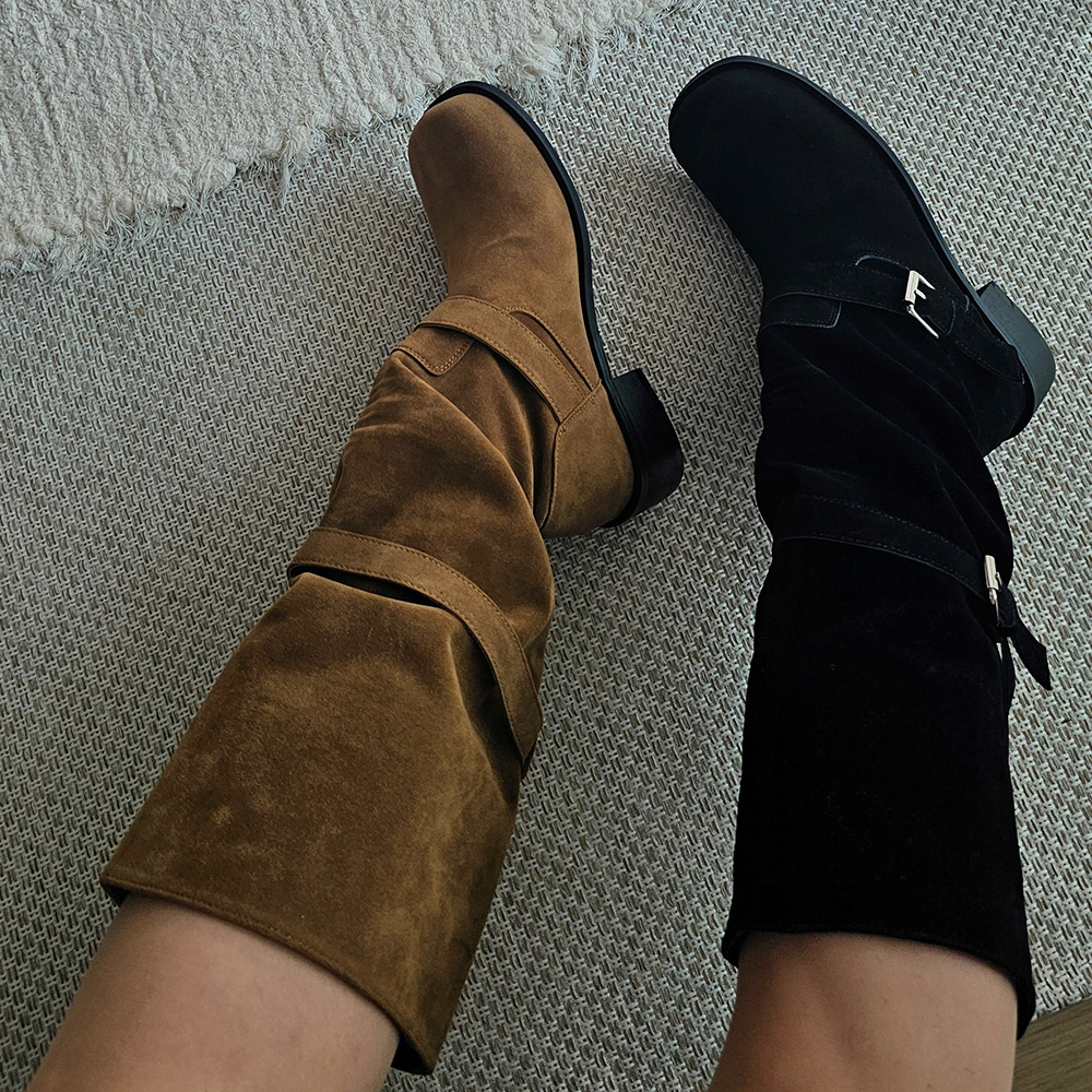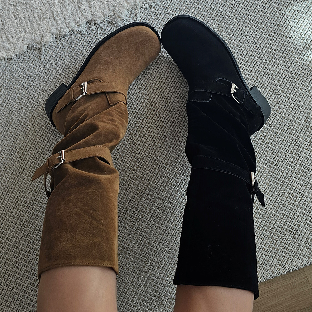 스웨이드 투웨이 벨트 바이커부츠 미들힐 여자 롱부츠