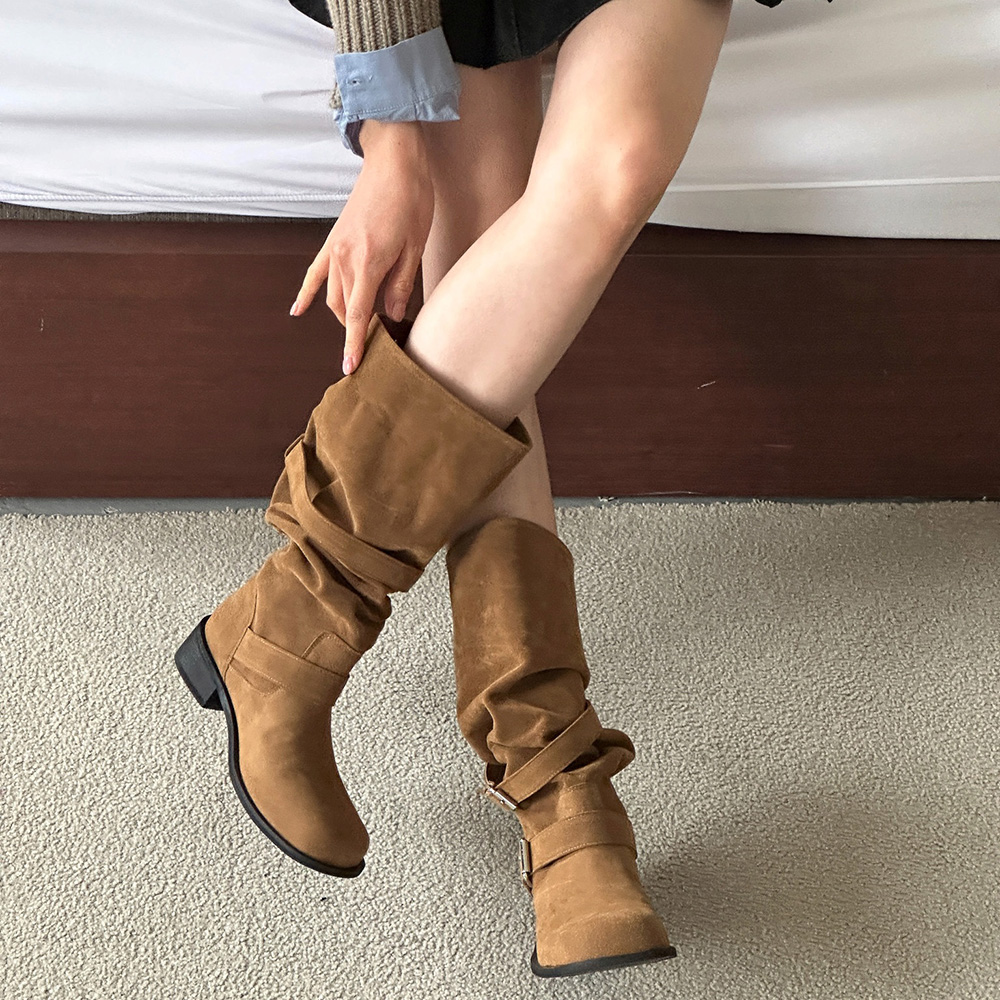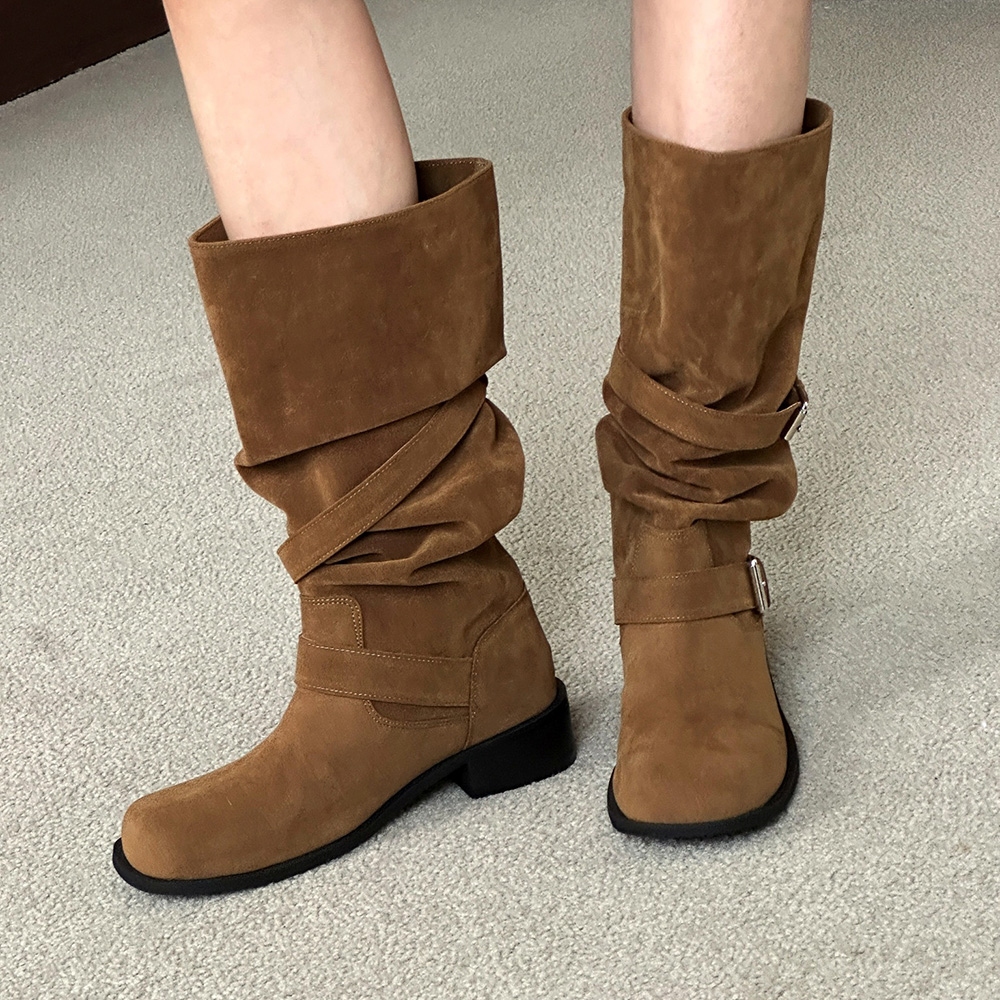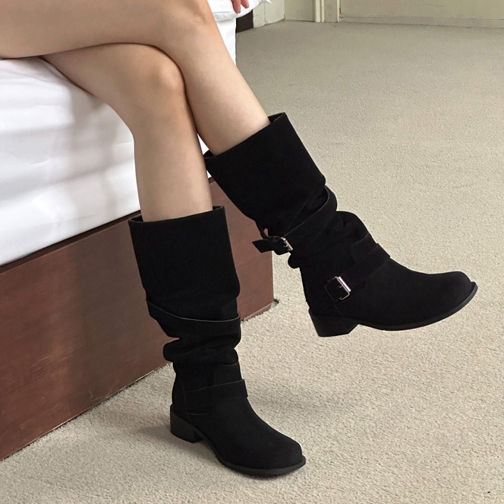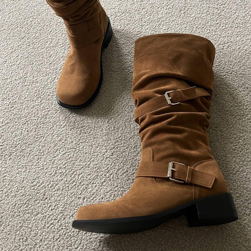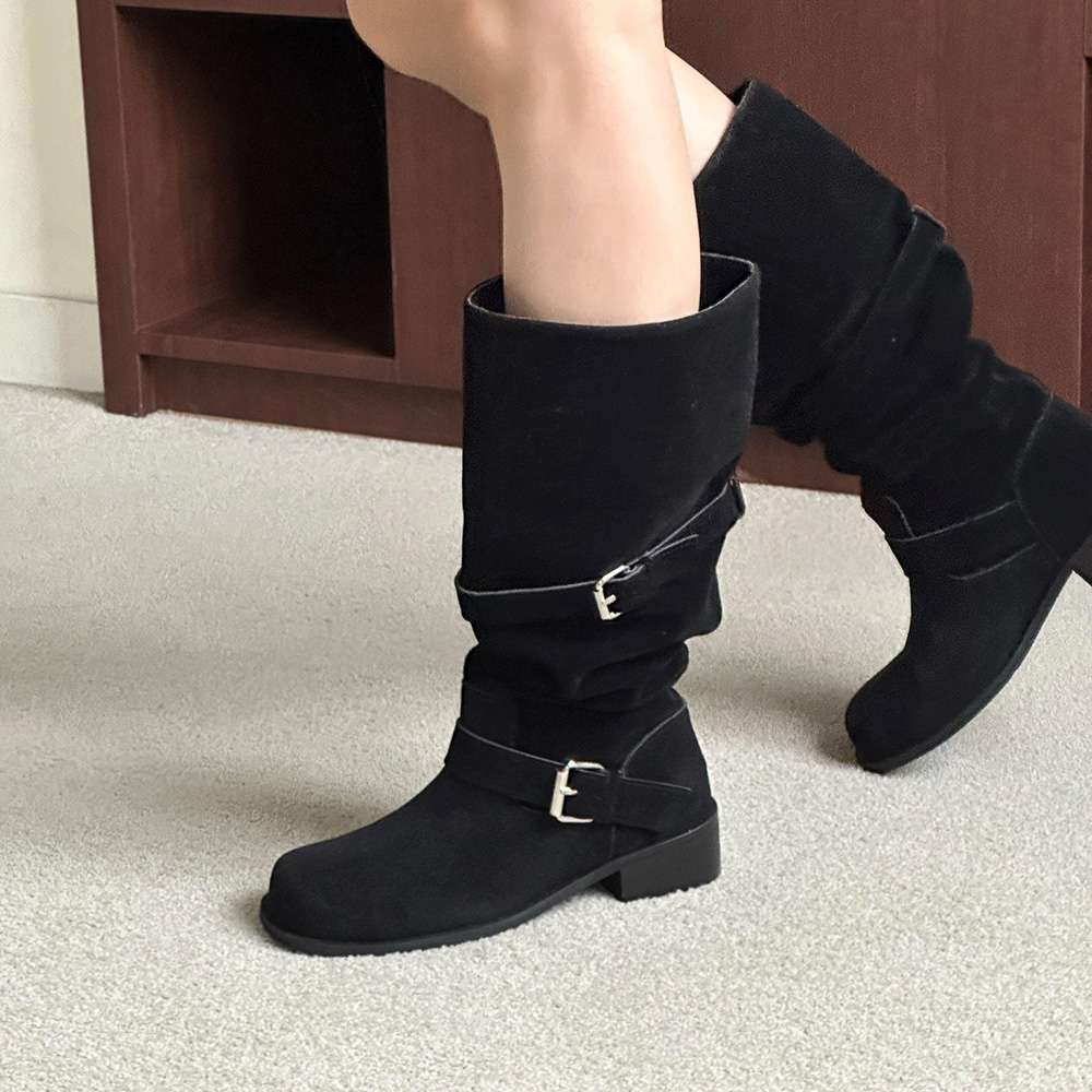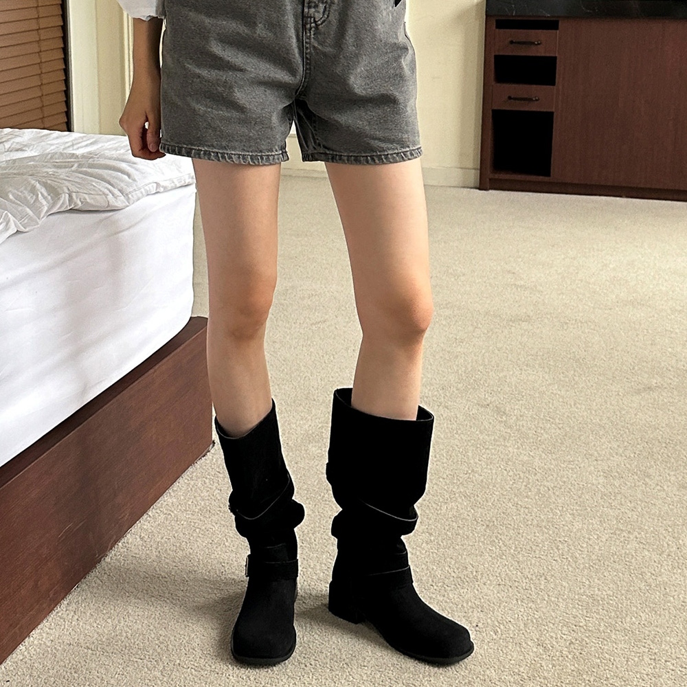 스웨이드 투웨이 벨트 바이커부츠 미들힐 여자 롱부츠