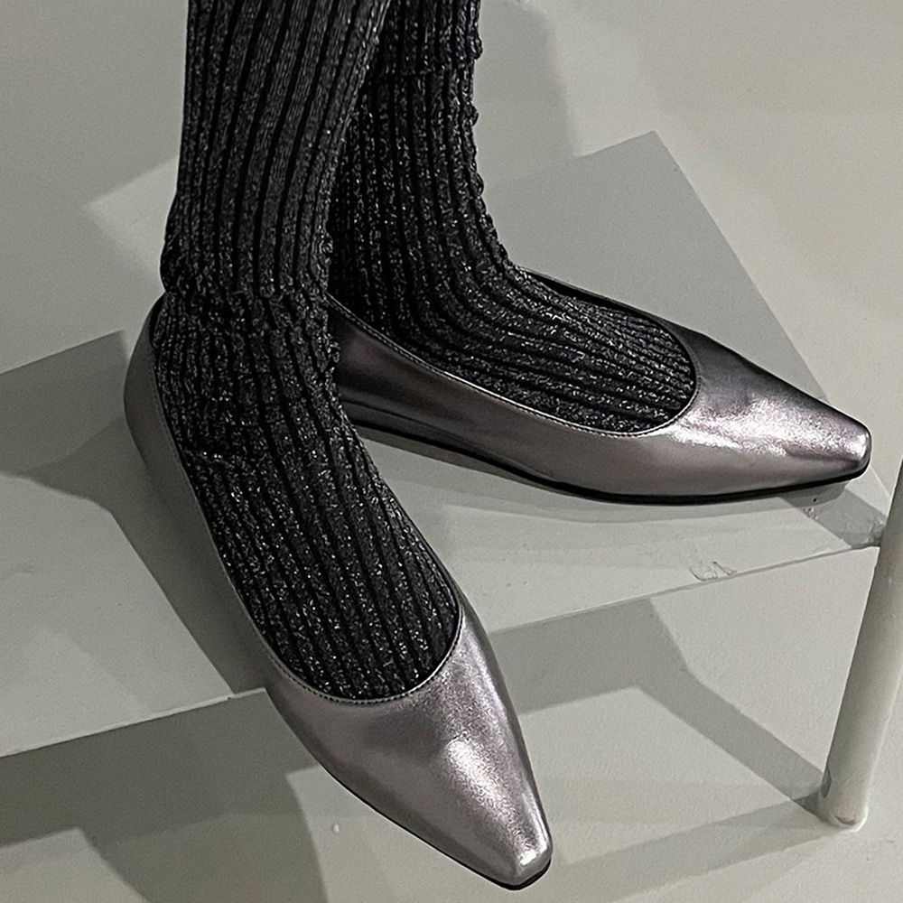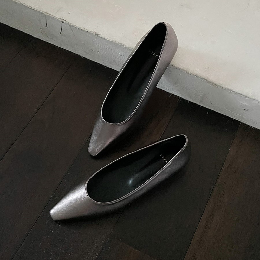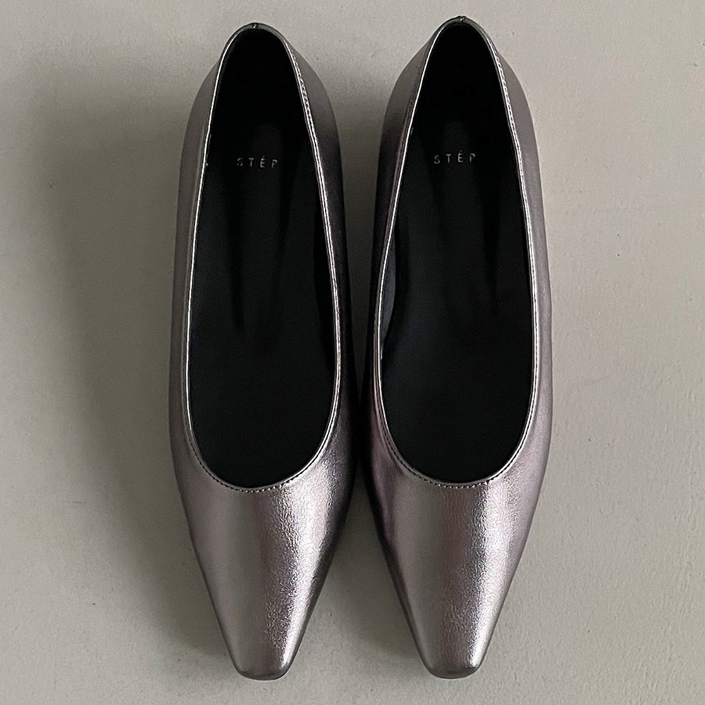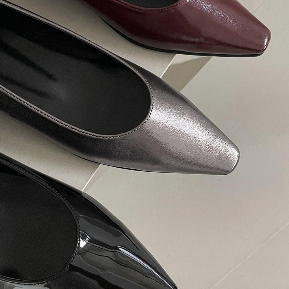 에나멜과 메탈릭한 소재의 플랫슈즈예요