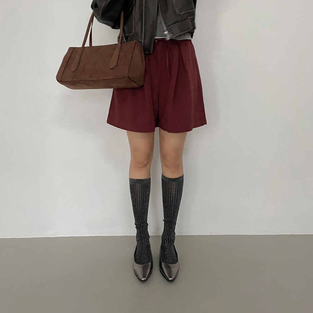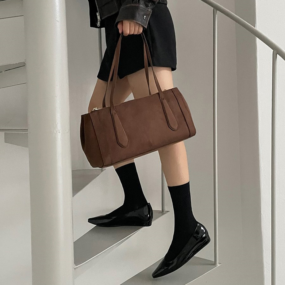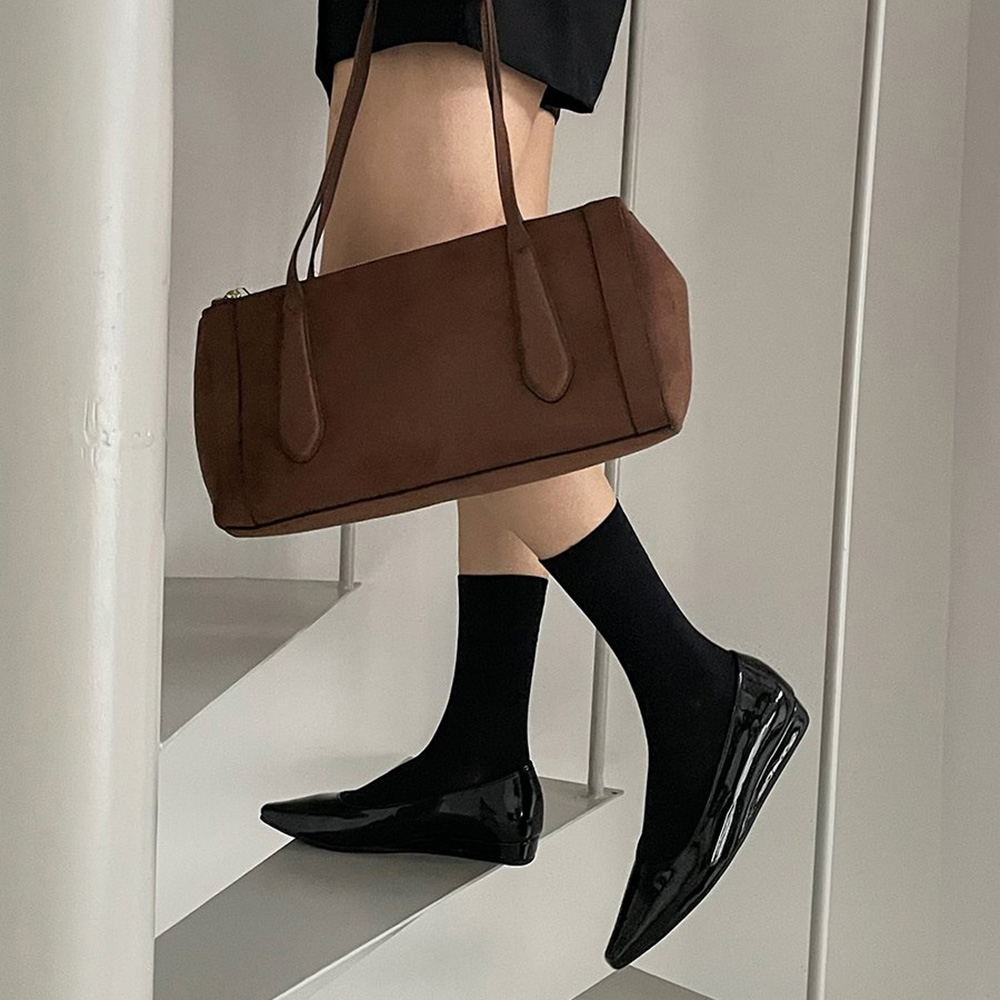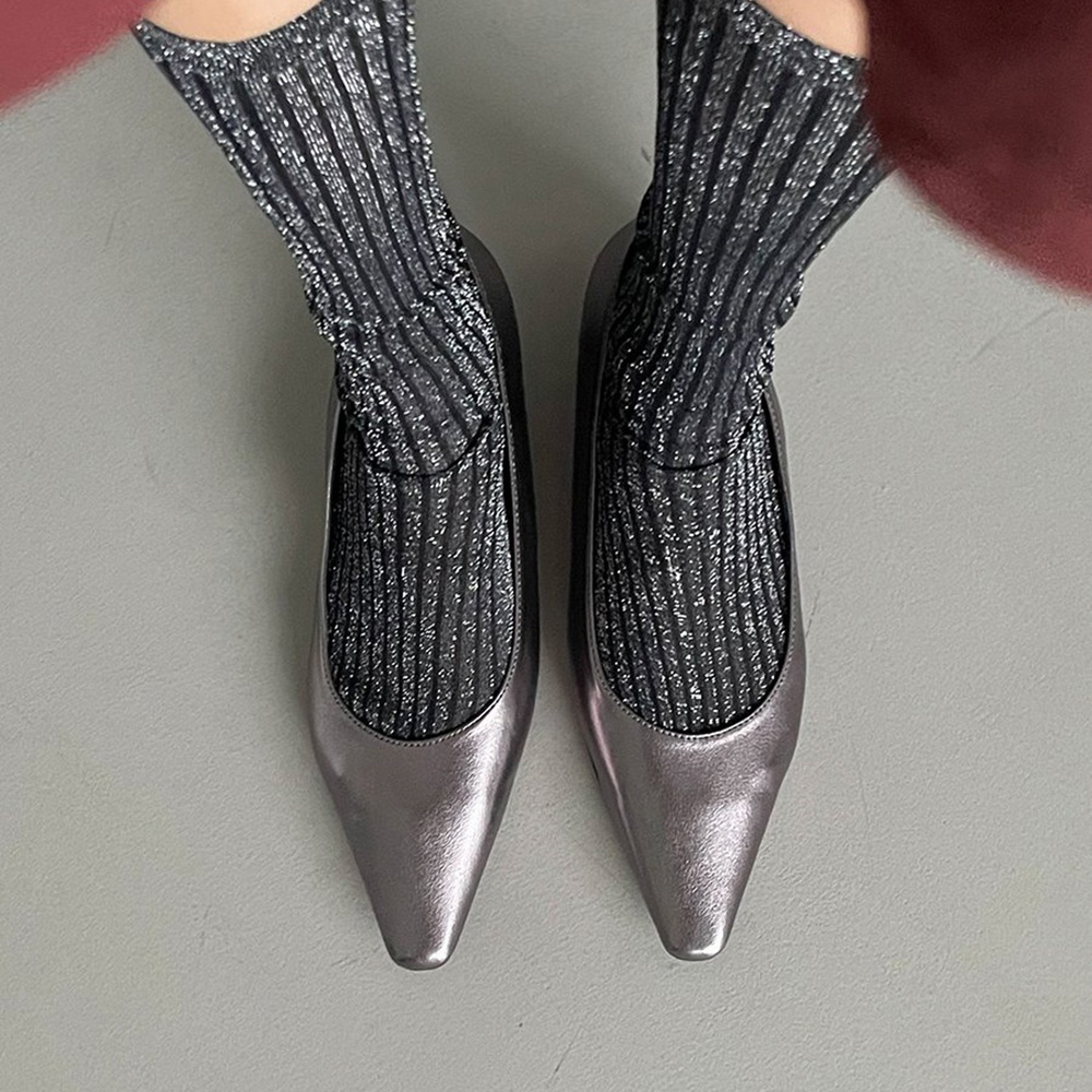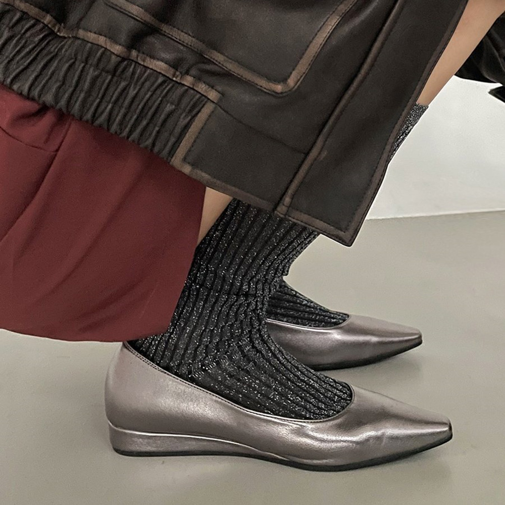 에나멜과 메탈릭한 소재의 플랫슈즈예요