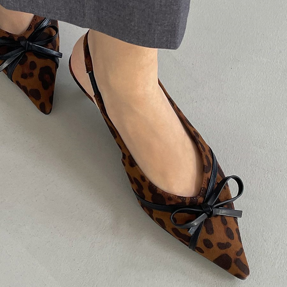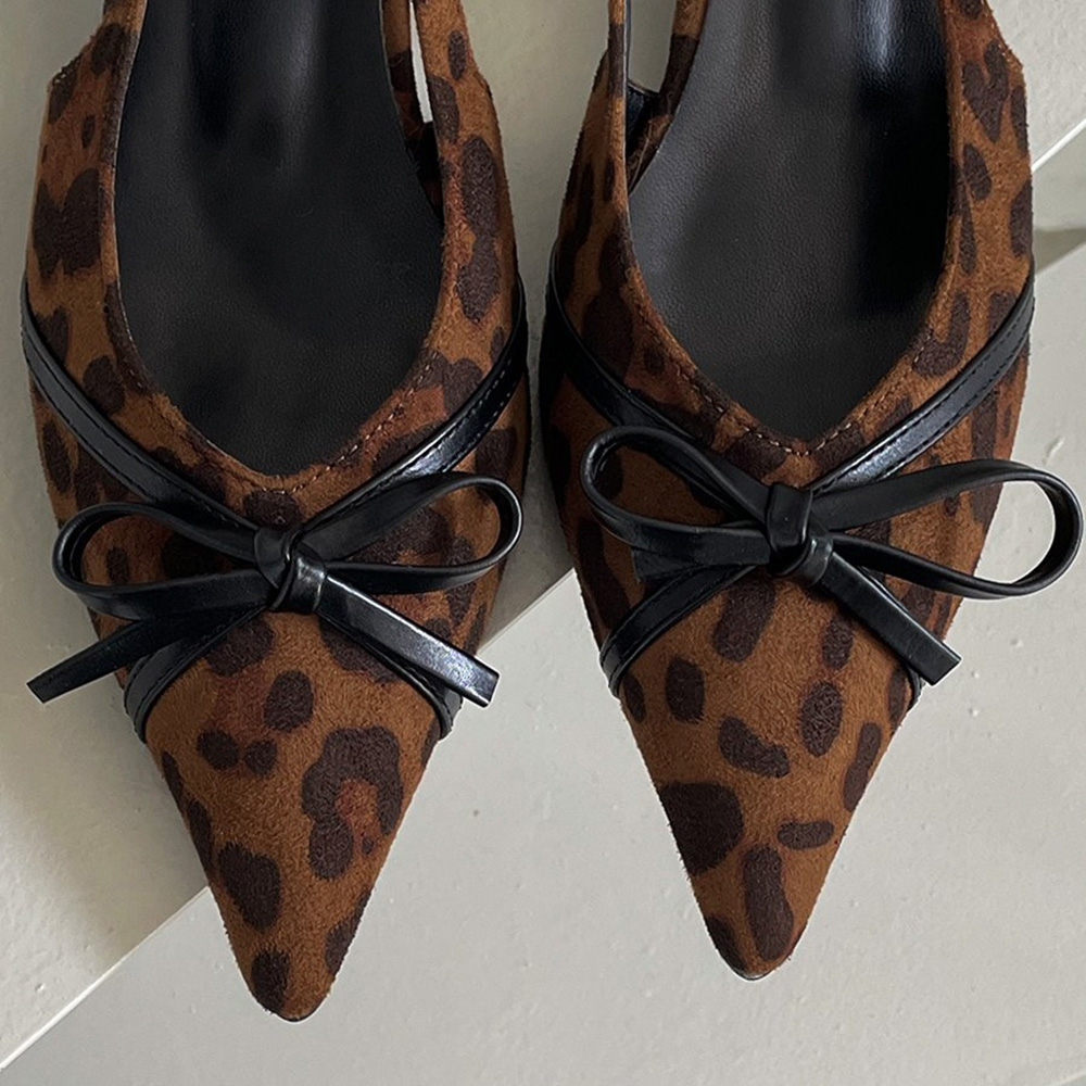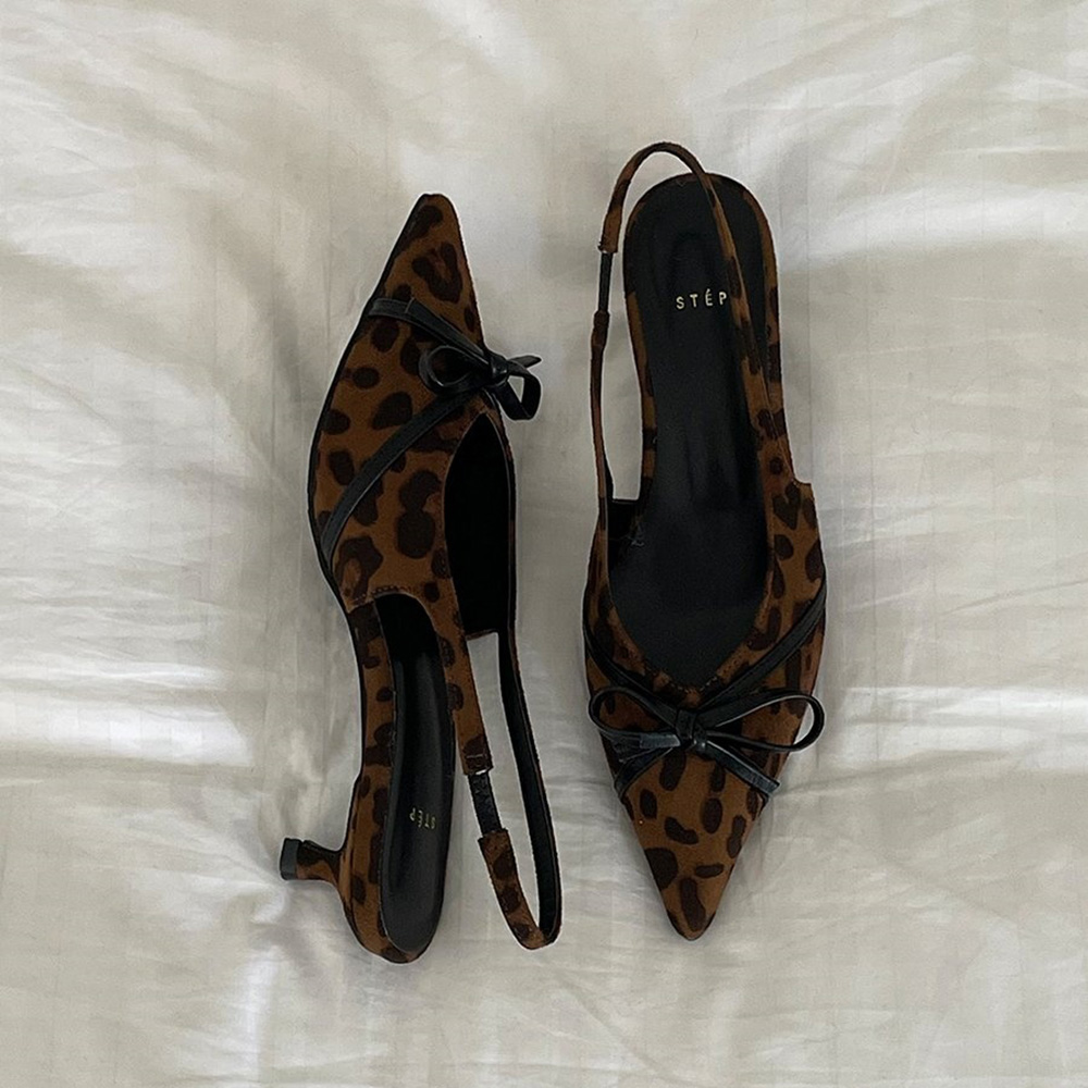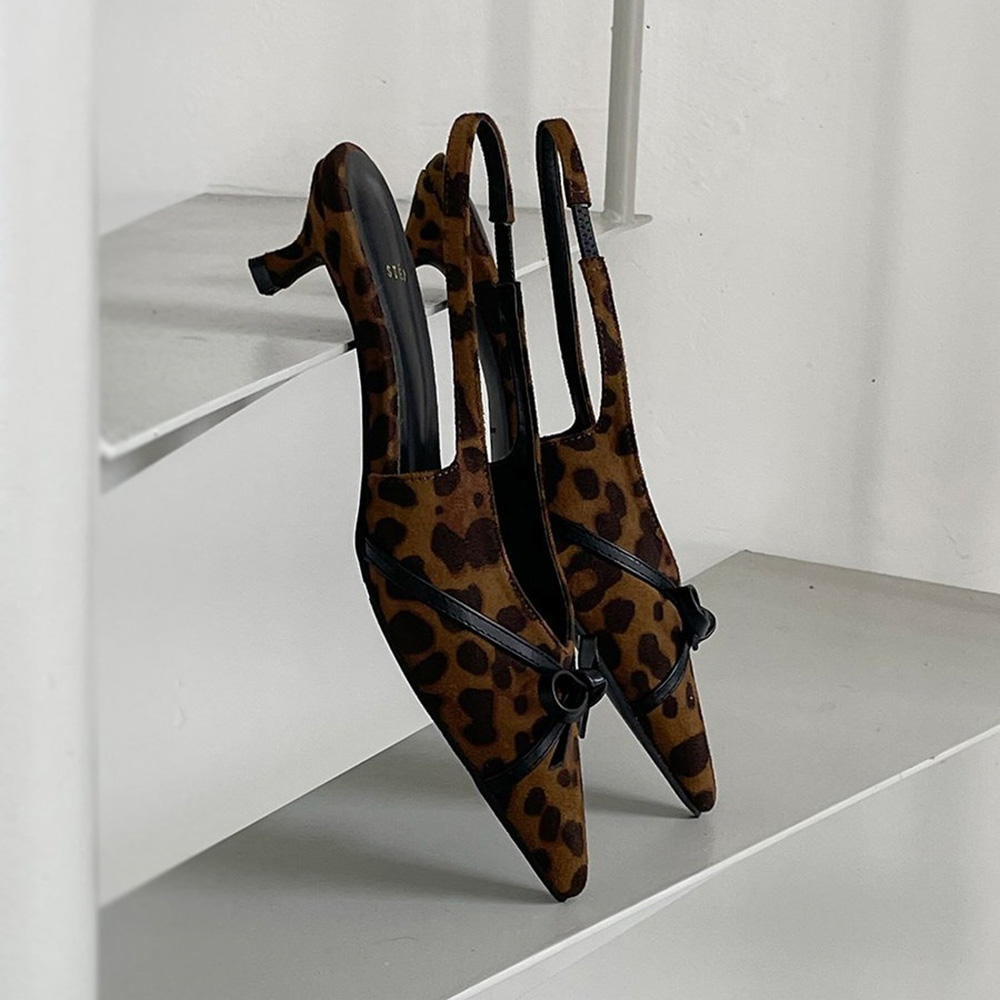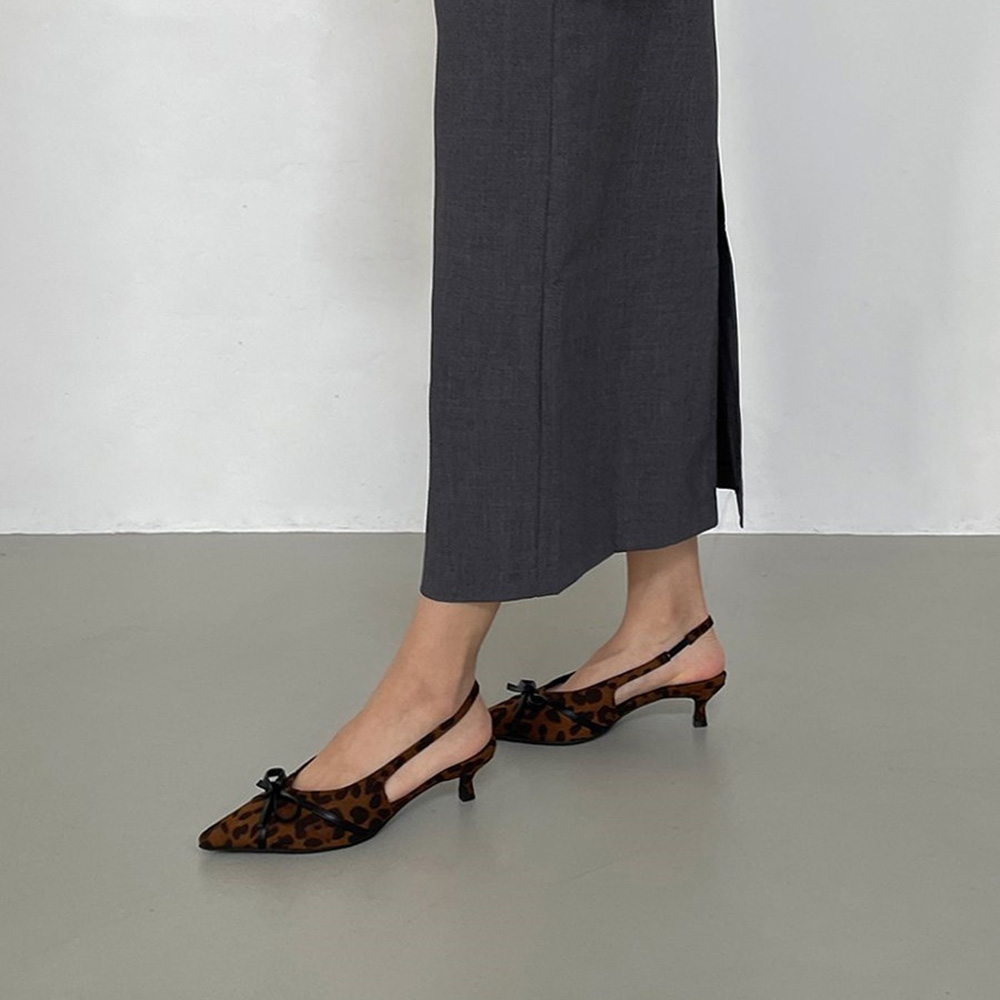 스틸레토 레오파드 스웨이드 리본 미들힐 슬링백힐