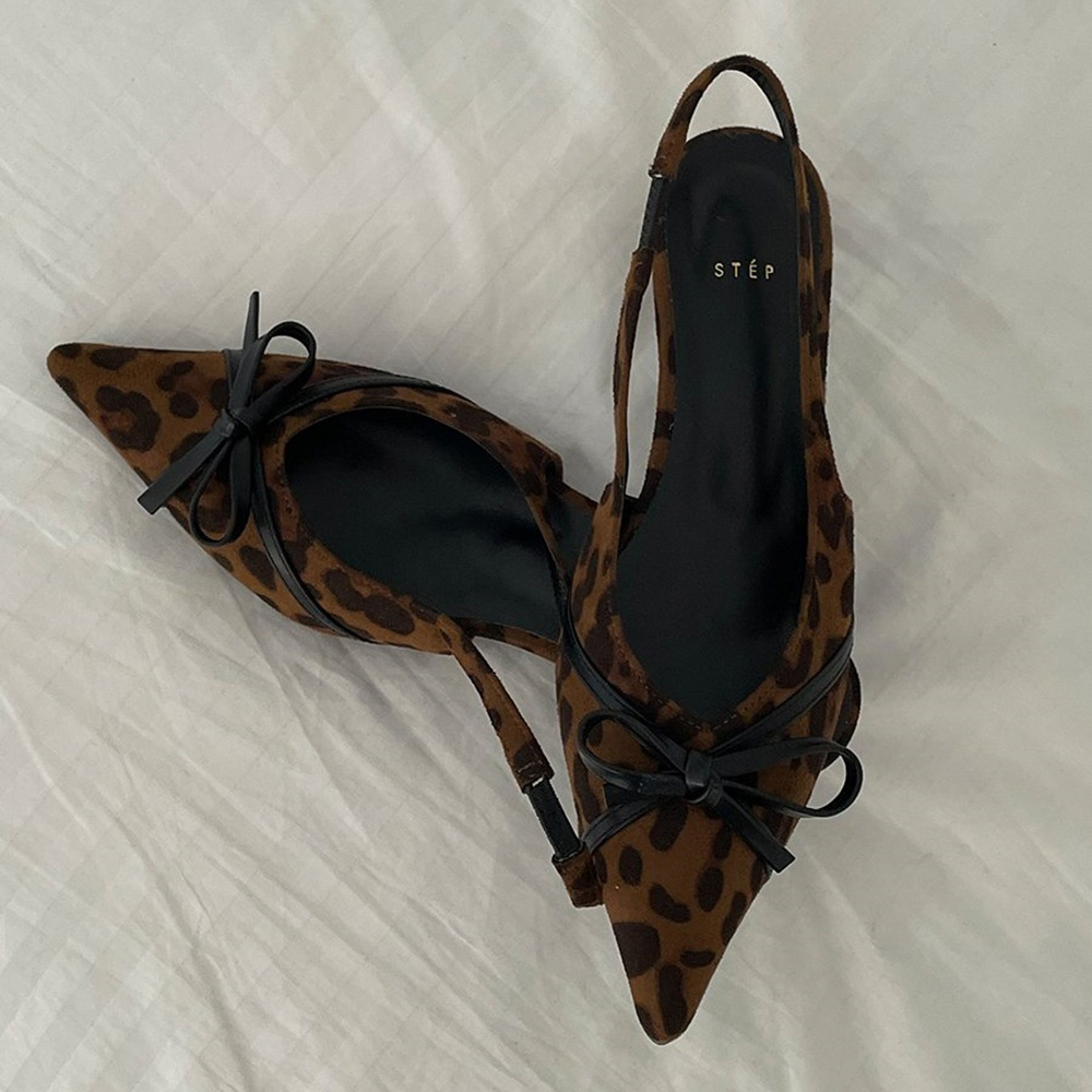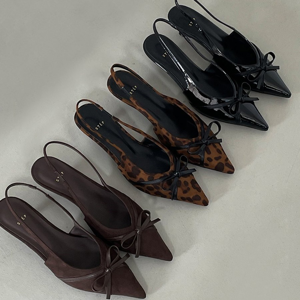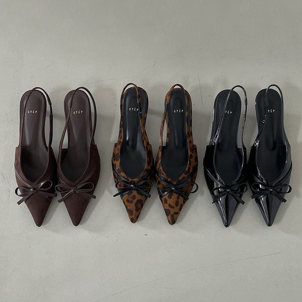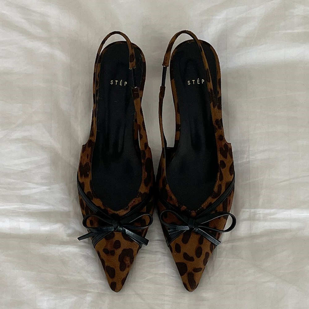 스틸레토 레오파드 스웨이드 리본 미들힐 슬링백힐