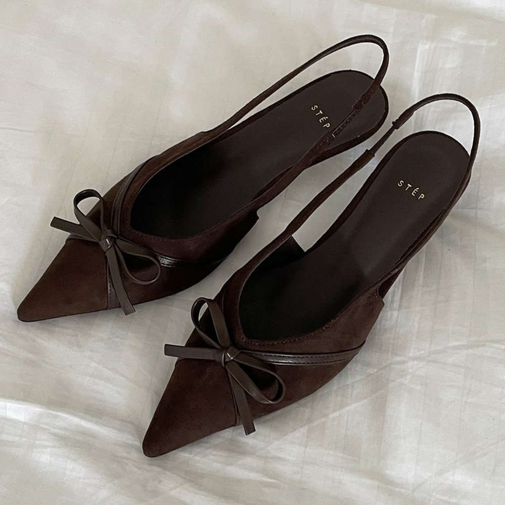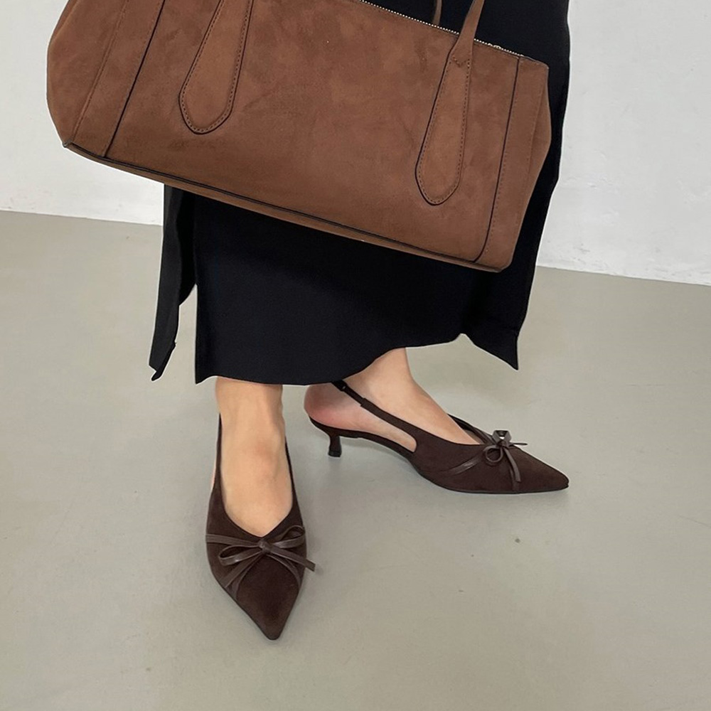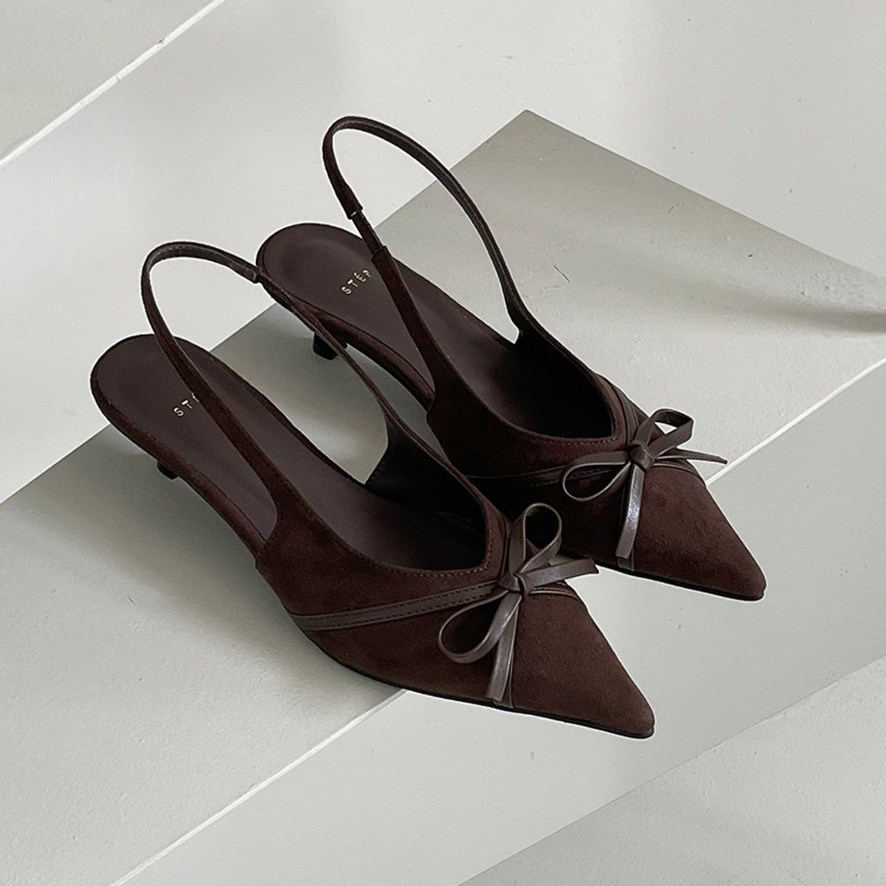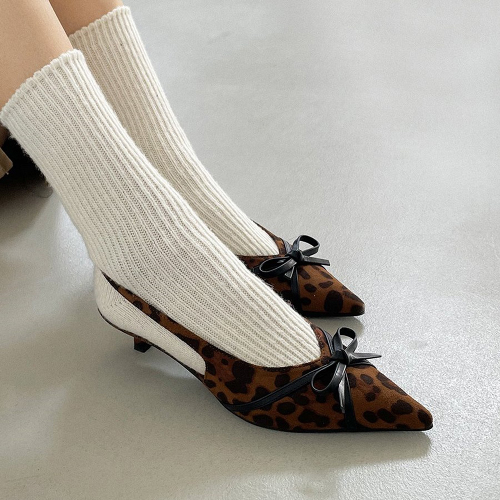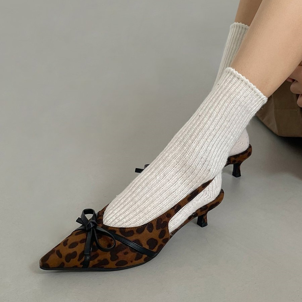 스틸레토 레오파드 스웨이드 리본 미들힐 슬링백힐