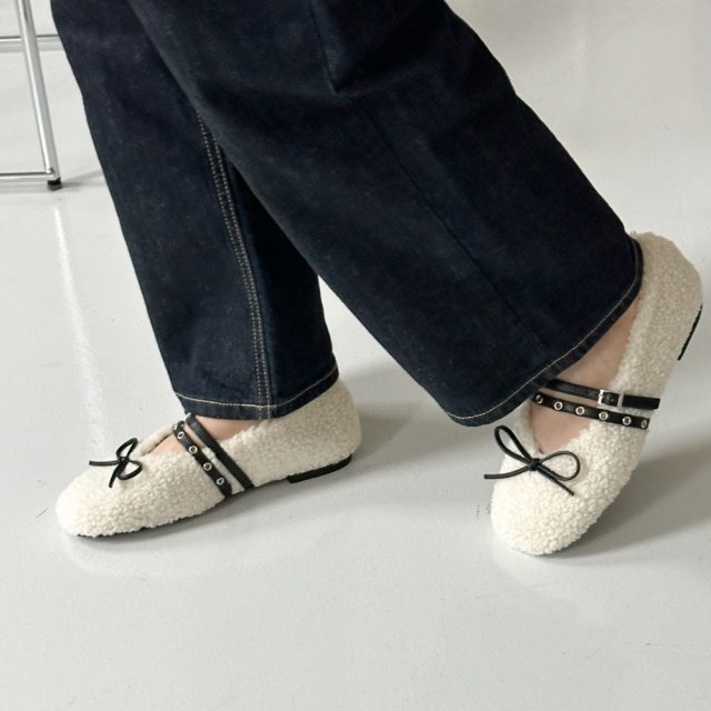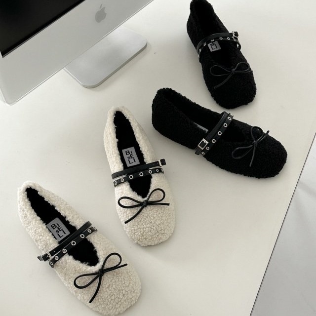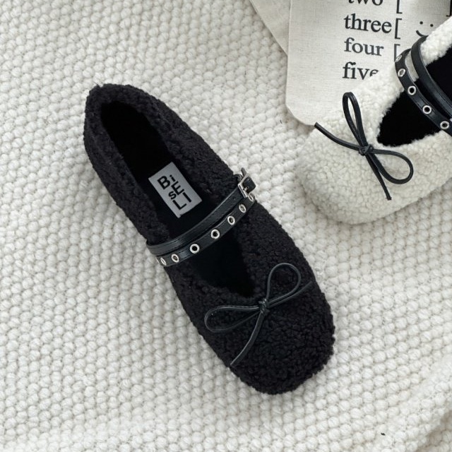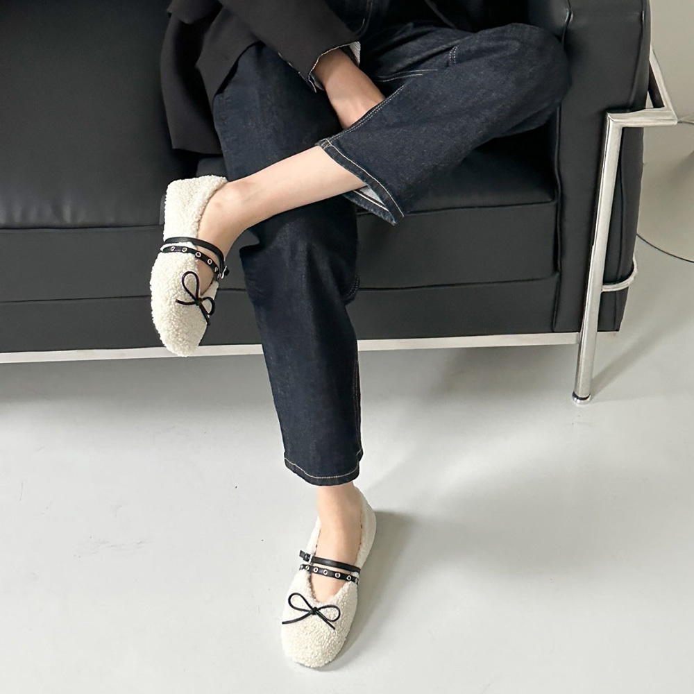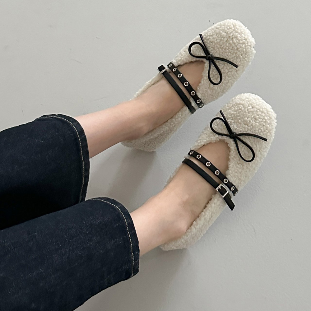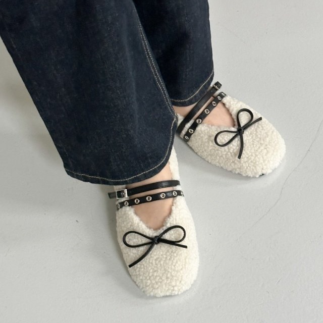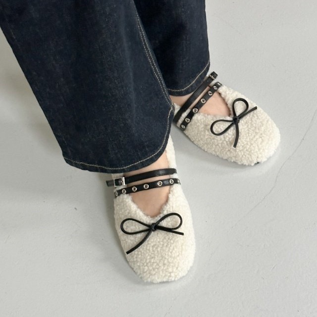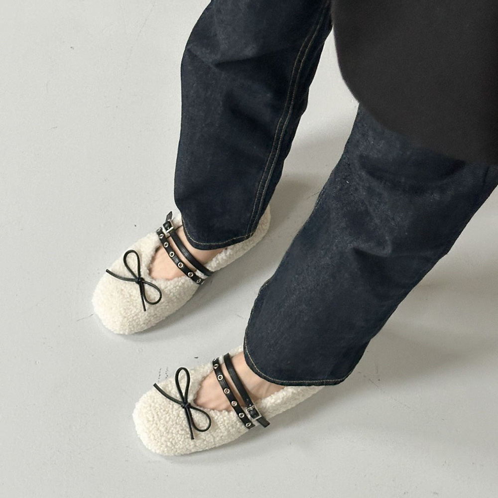 뽀글이 기모안감 양털 리본 스트랩 메리제인 겨울 여자 플랫슈즈