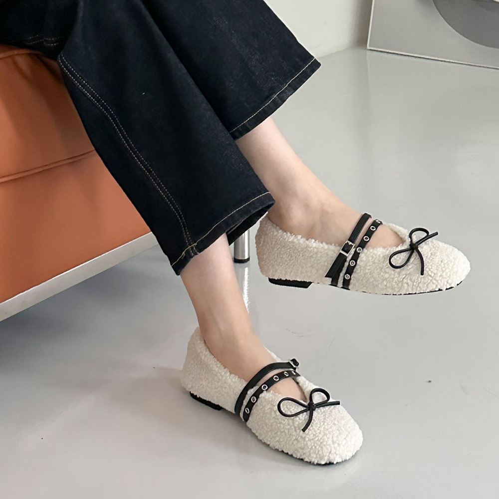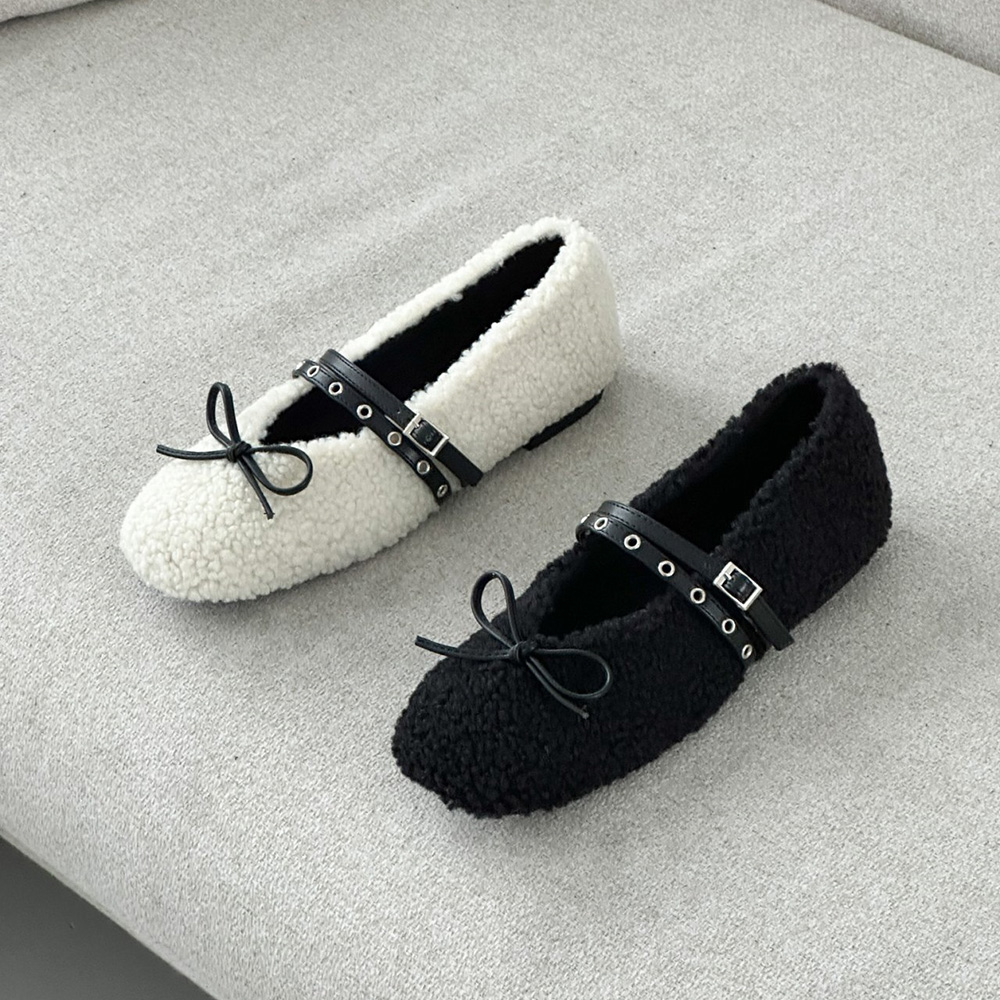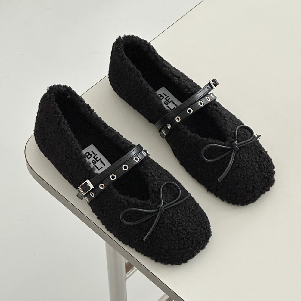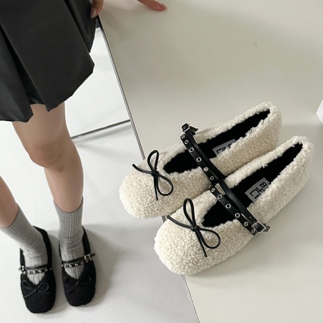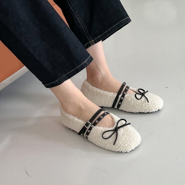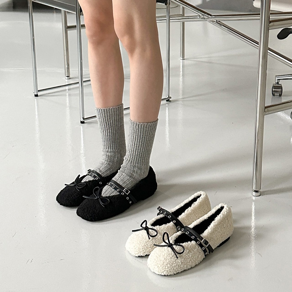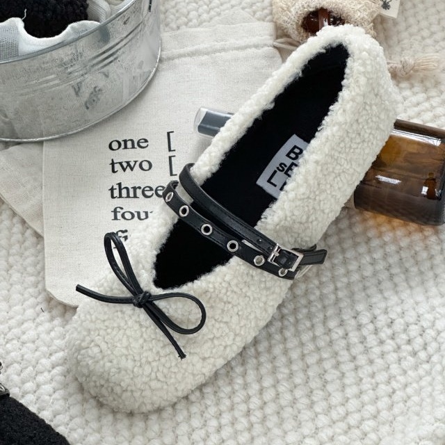 뽀글이 기모안감 양털 리본 스트랩 메리제인 겨울 여자 플랫슈즈