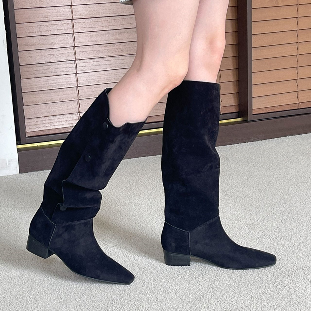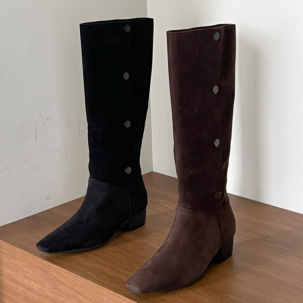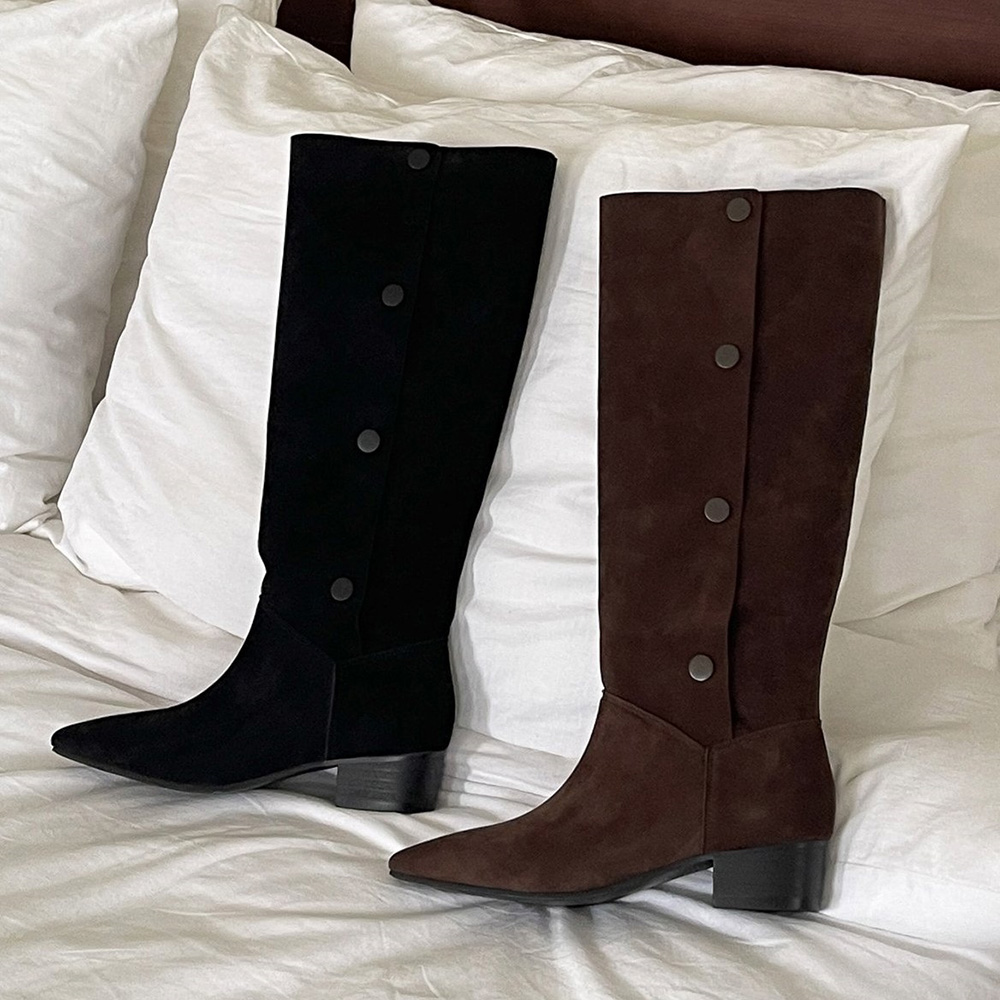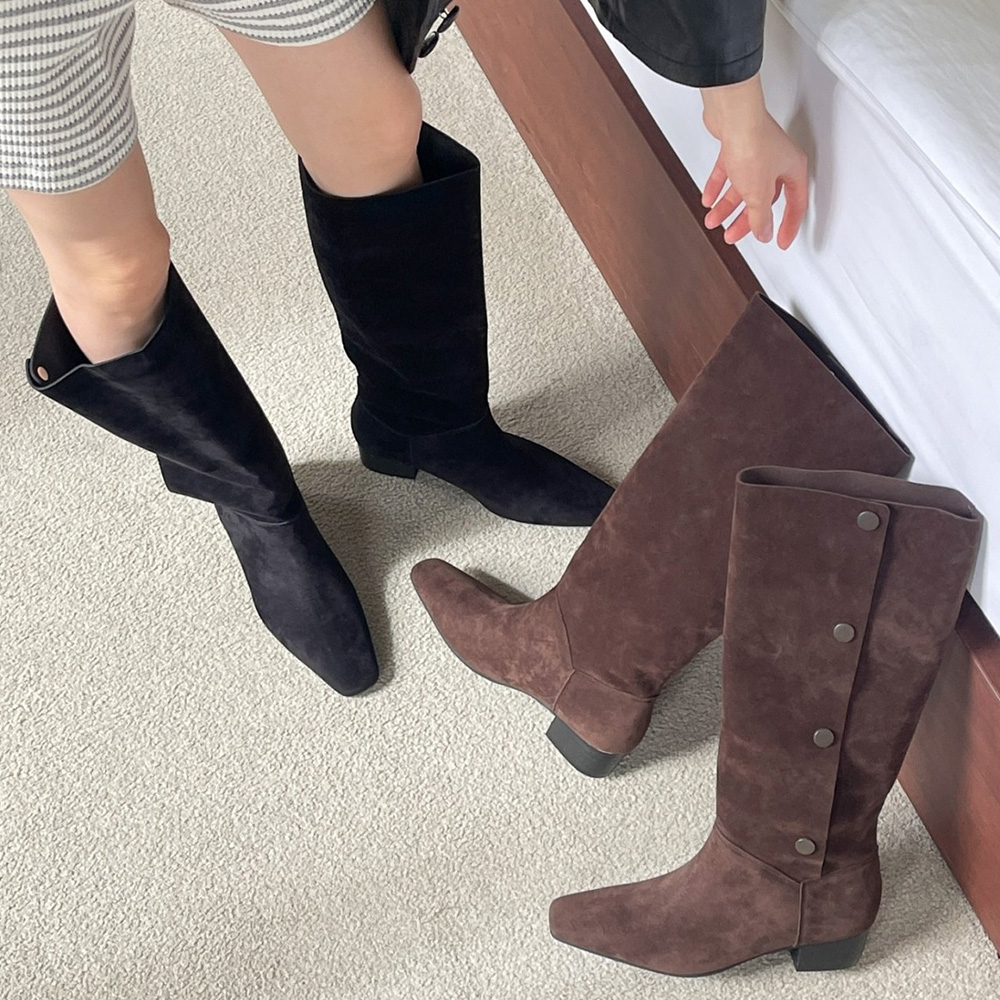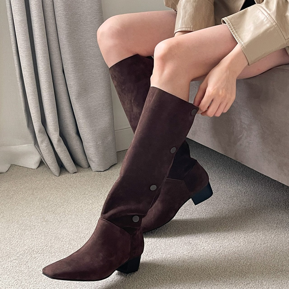 스웨이드 세무 스냅단추 셔링 투웨이 미들힐 여자 롱부츠