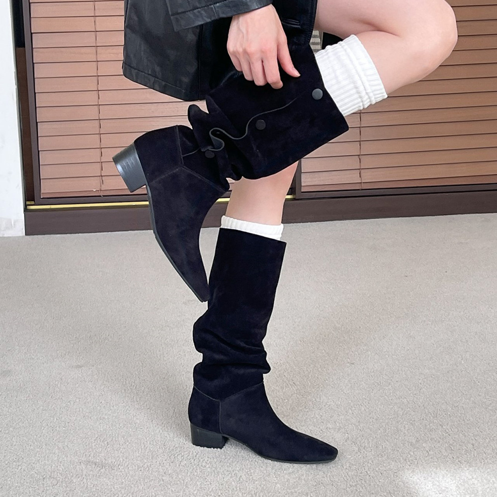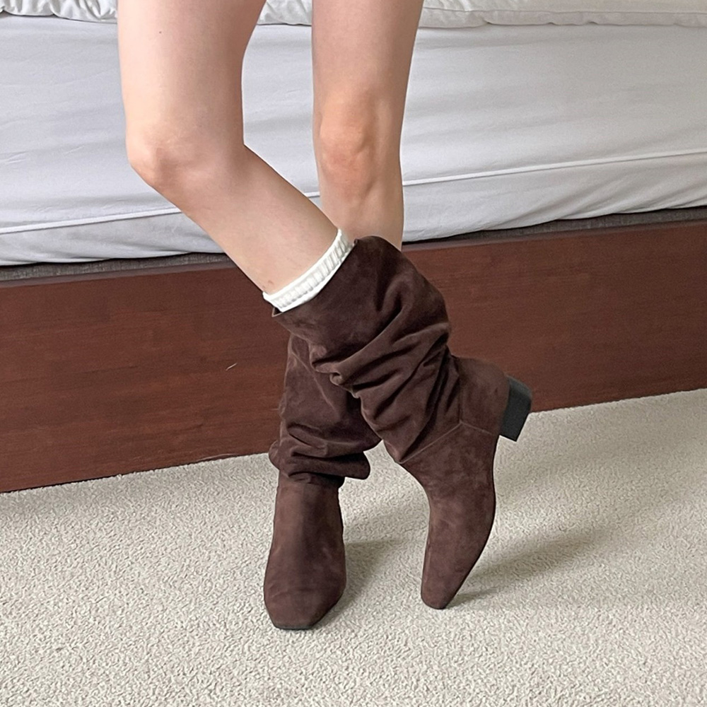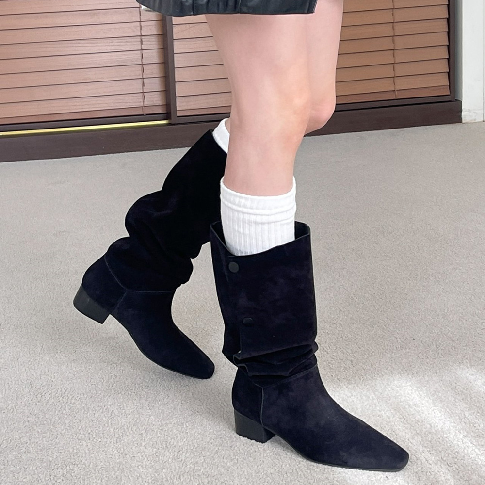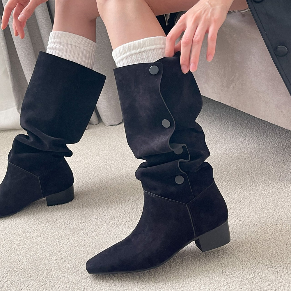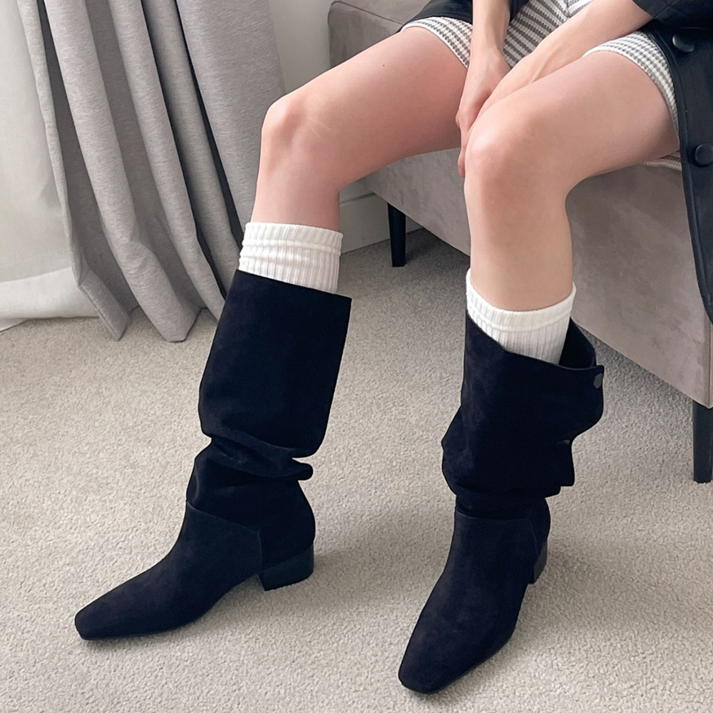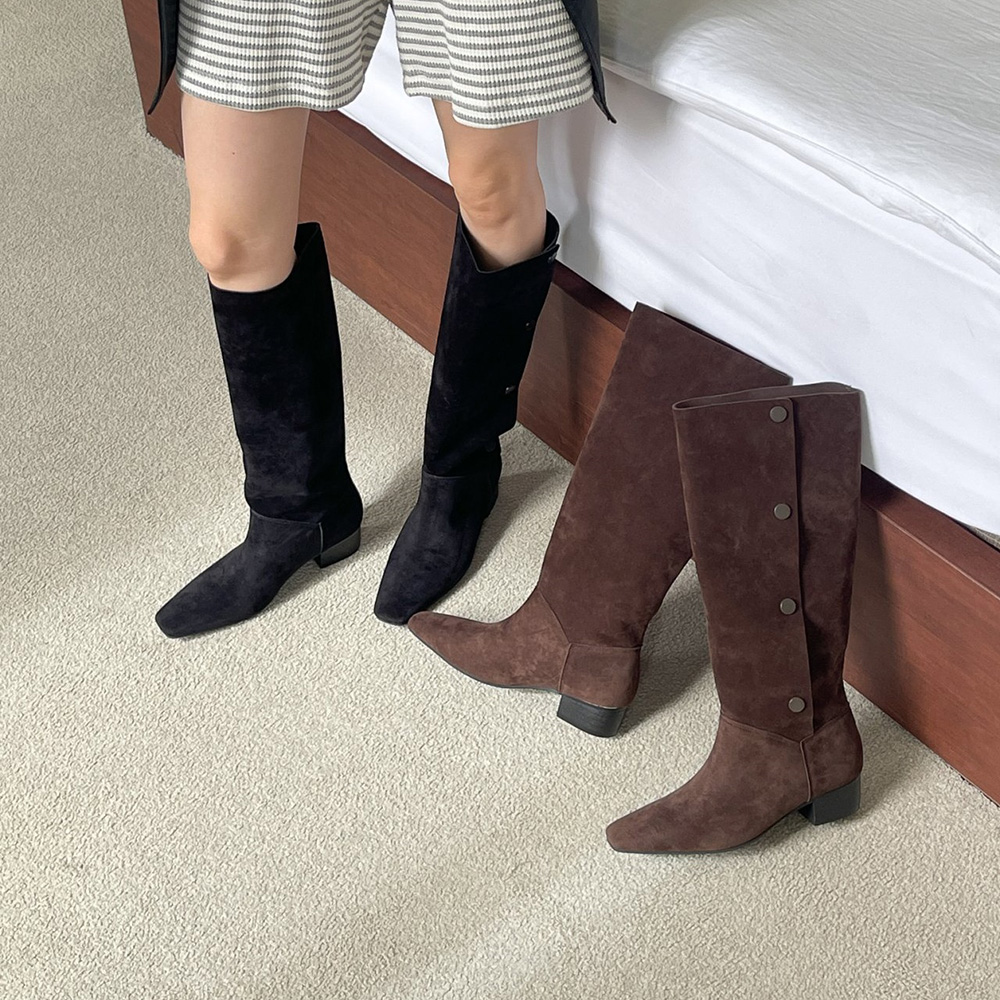 스웨이드 세무 스냅단추 셔링 투웨이 미들힐 여자 롱부츠