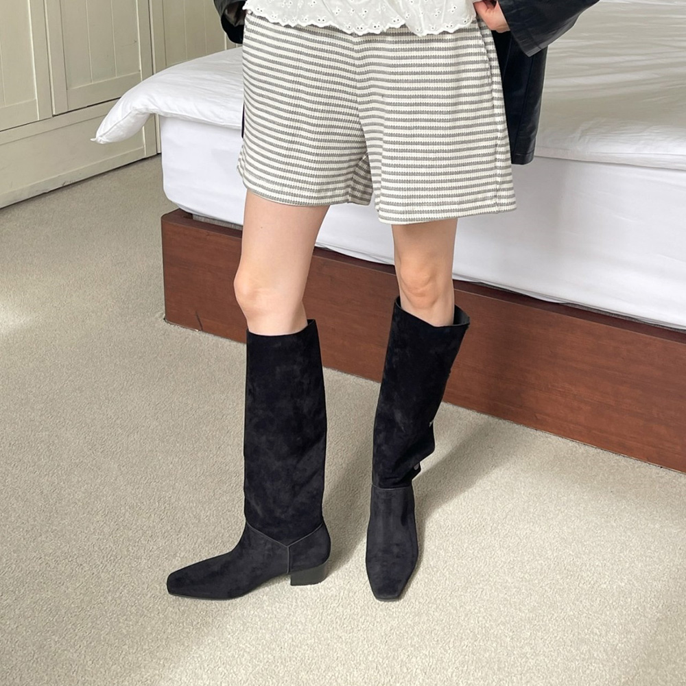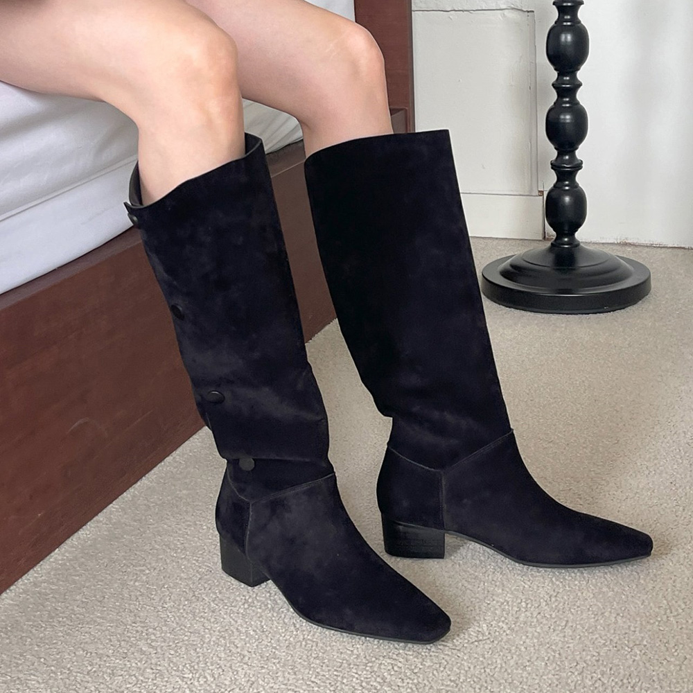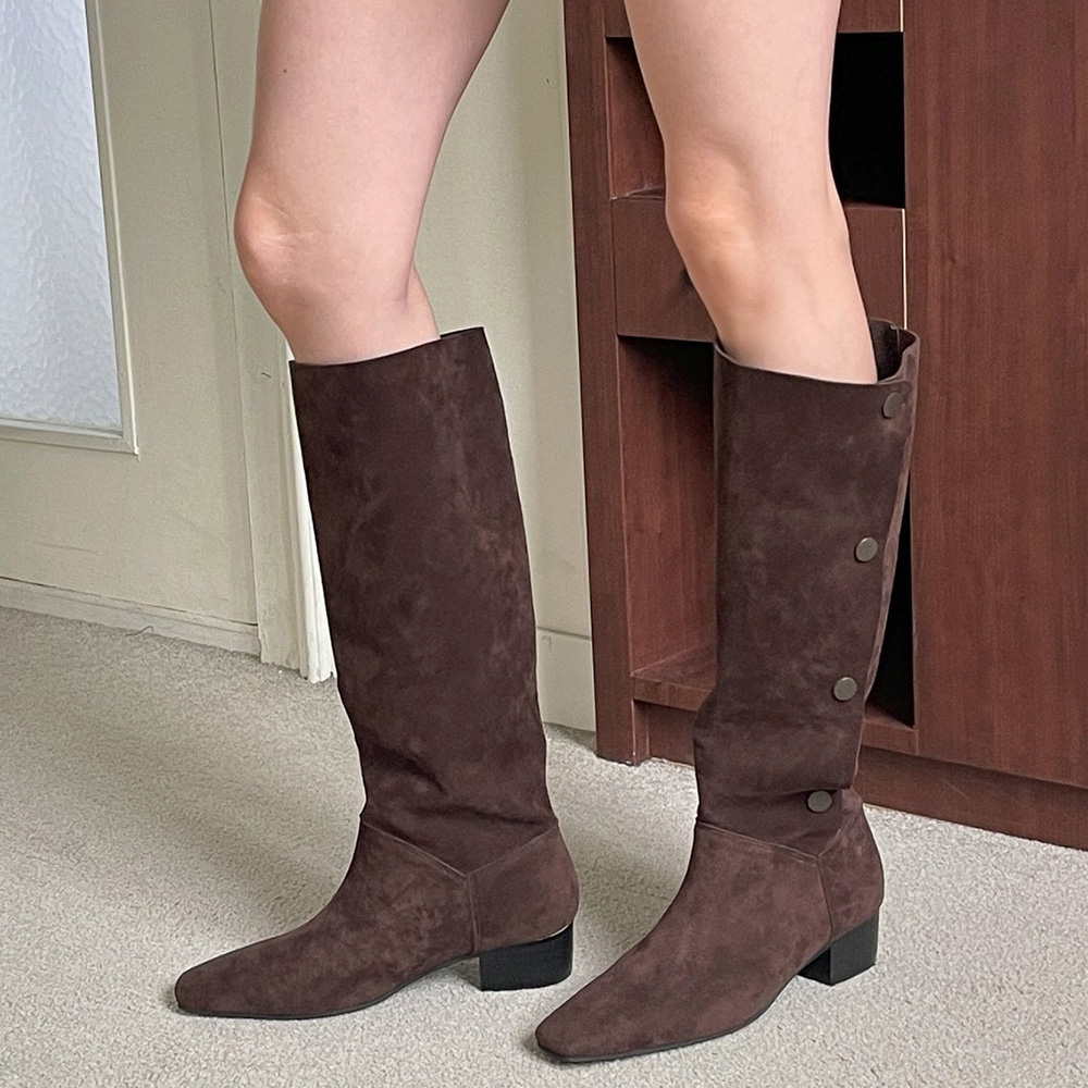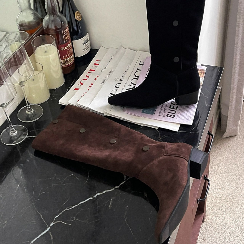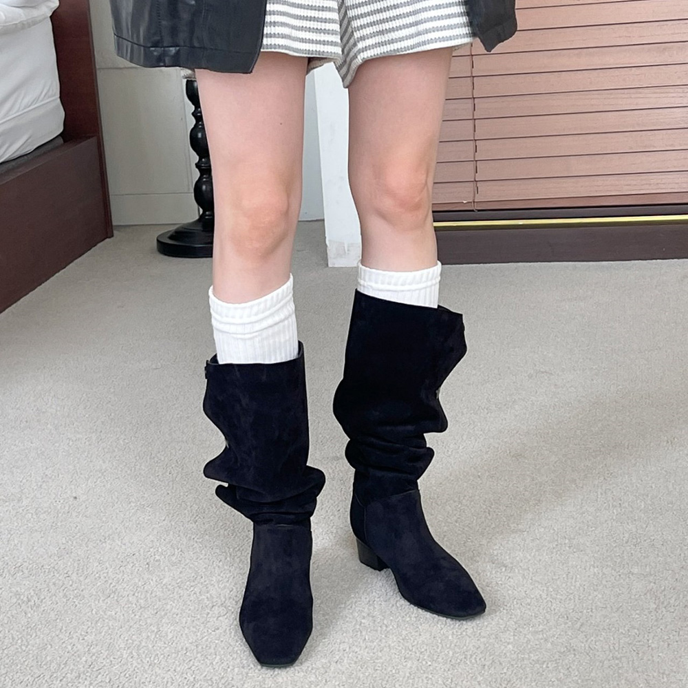스웨이드 세무 스냅단추 셔링 투웨이 미들힐 여자 롱부츠