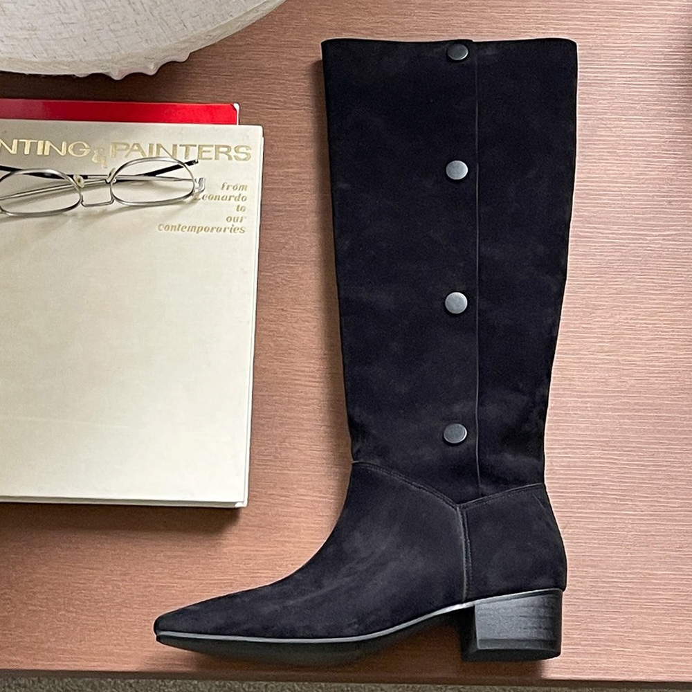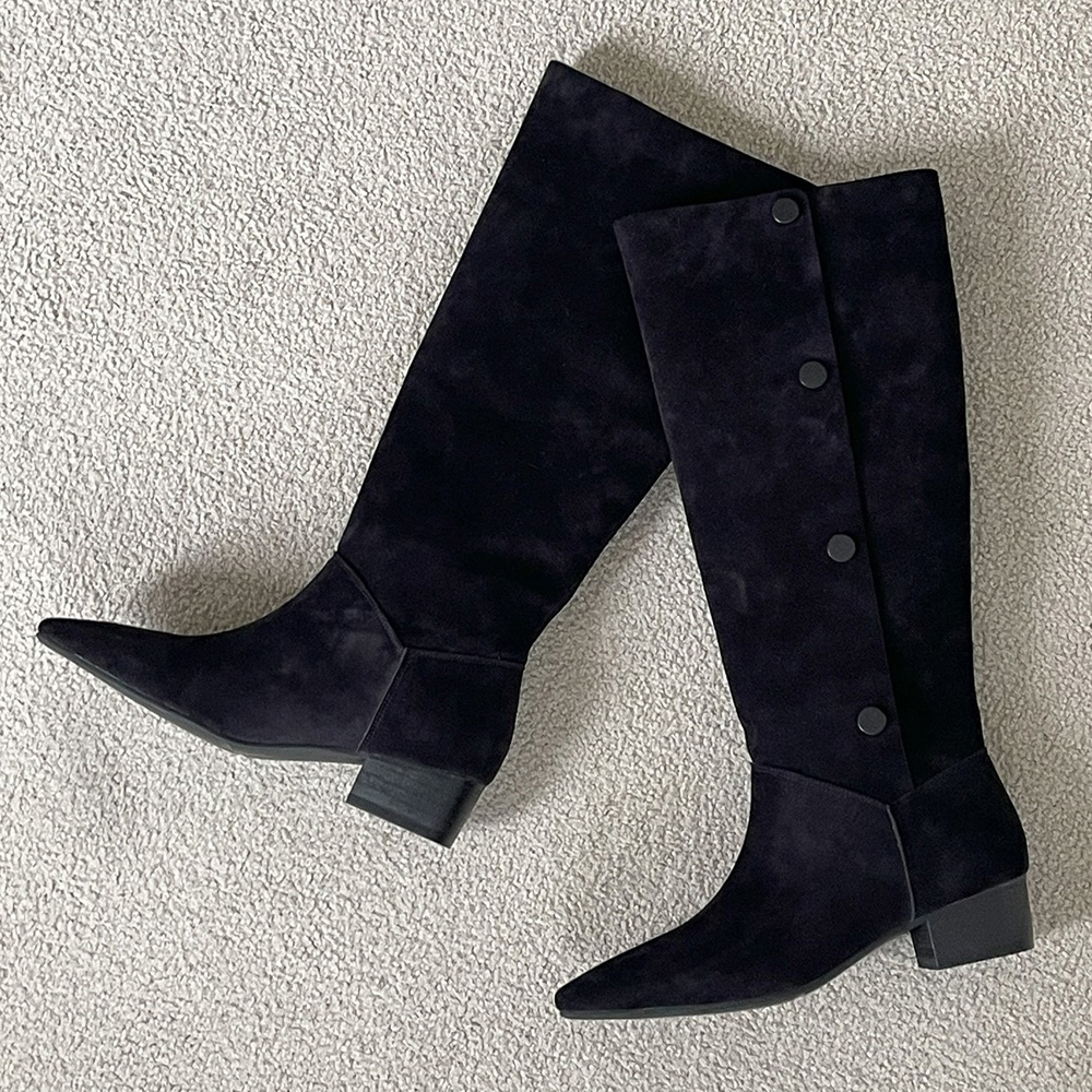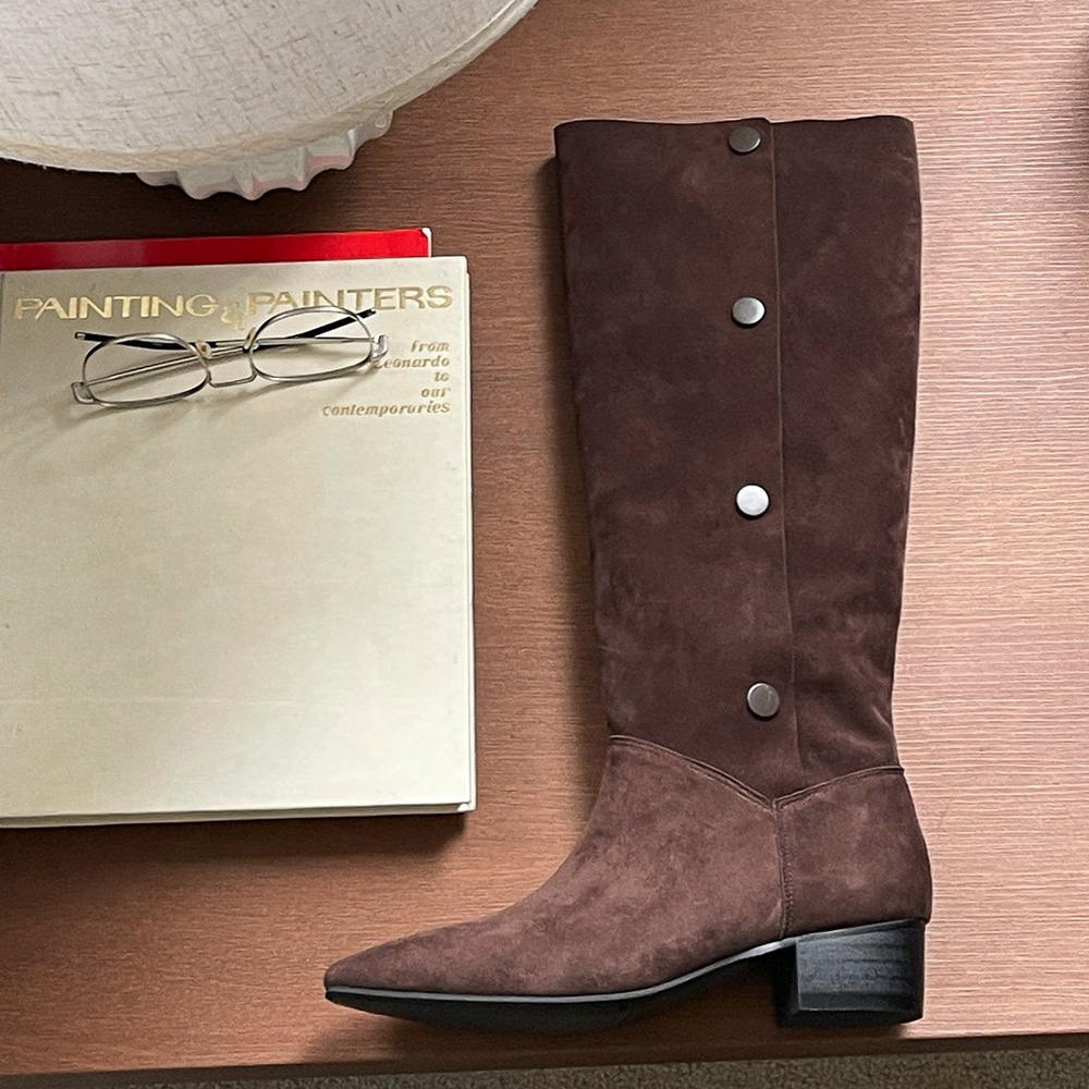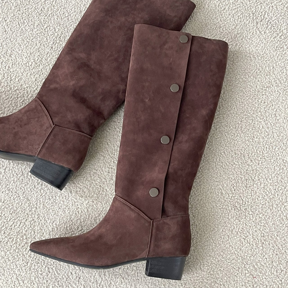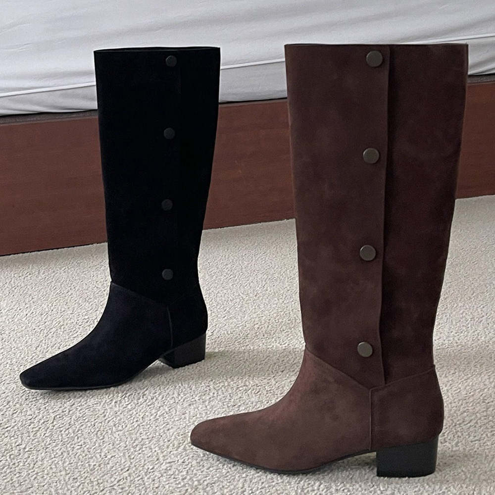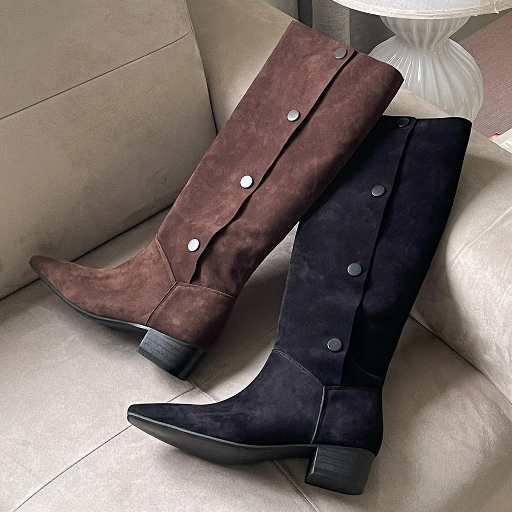 스웨이드 세무 스냅단추 셔링 투웨이 미들힐 여자 롱부츠