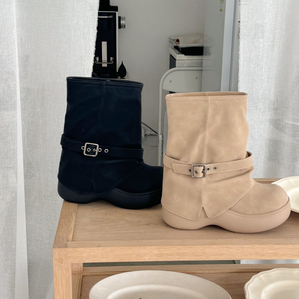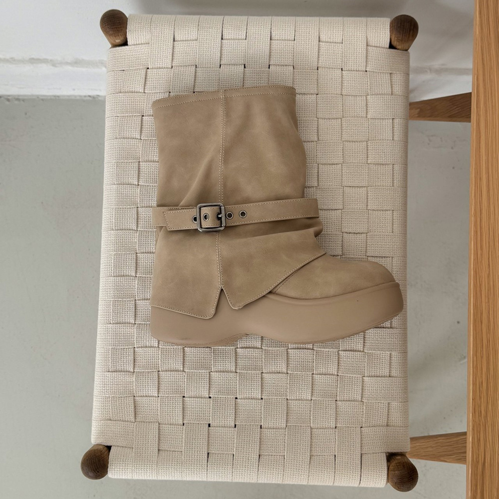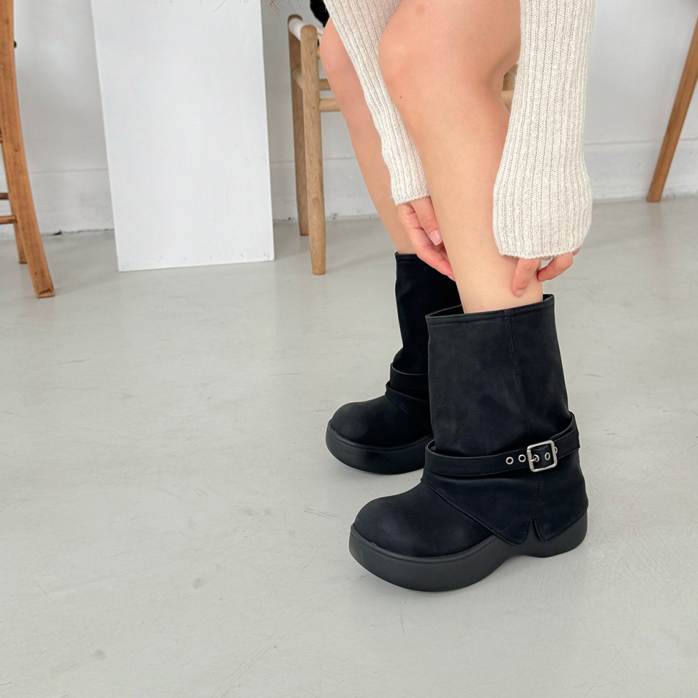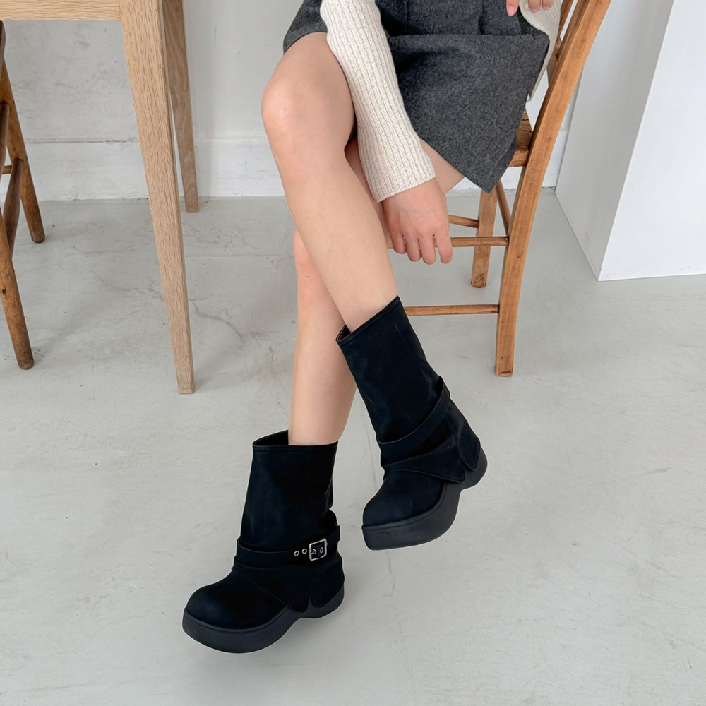 벨트 스웨이드 통굽 가보시 미들힐 미디부츠 여자 미들부츠