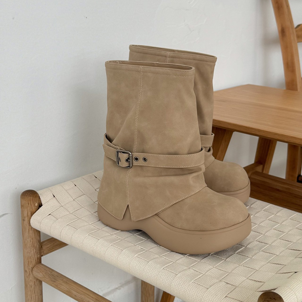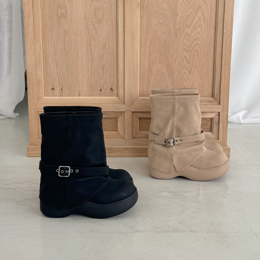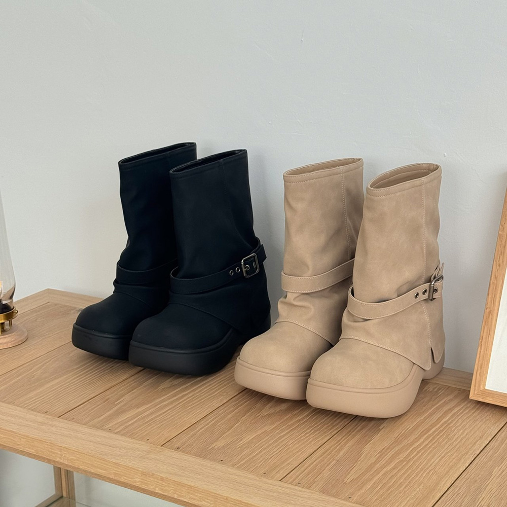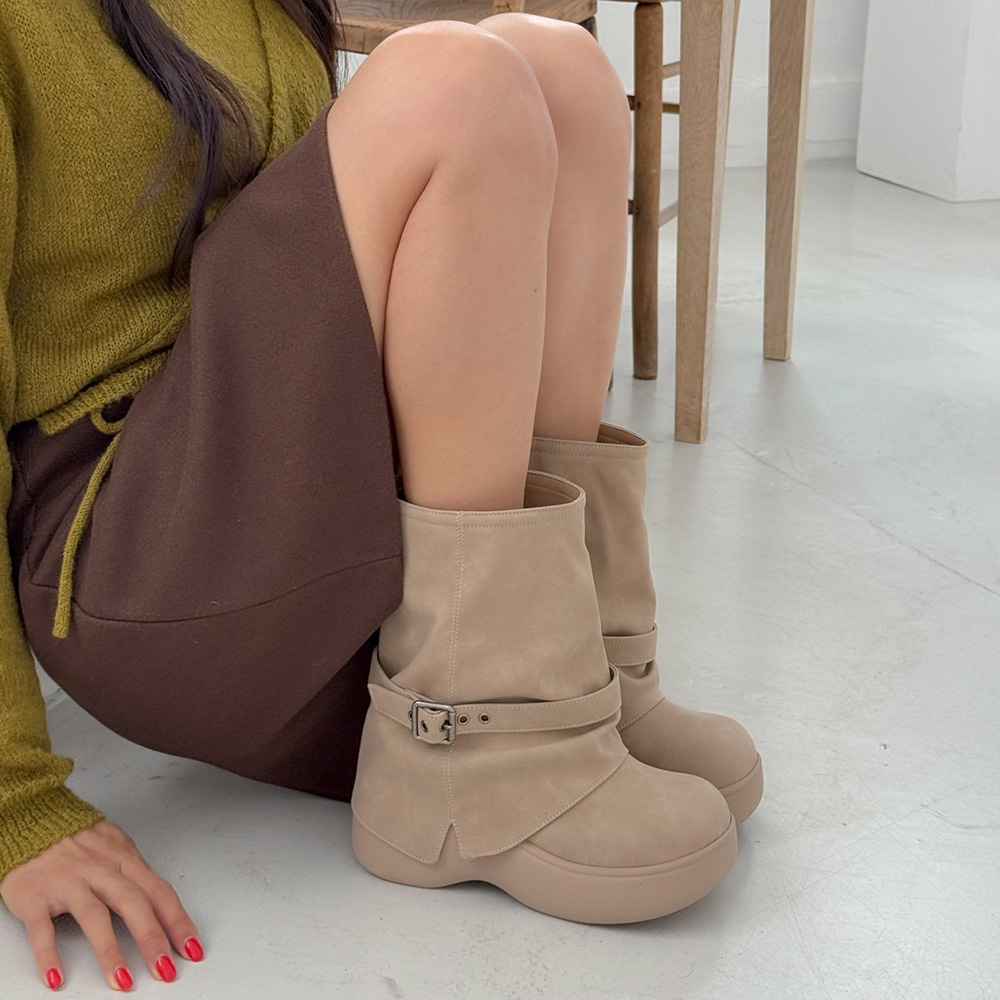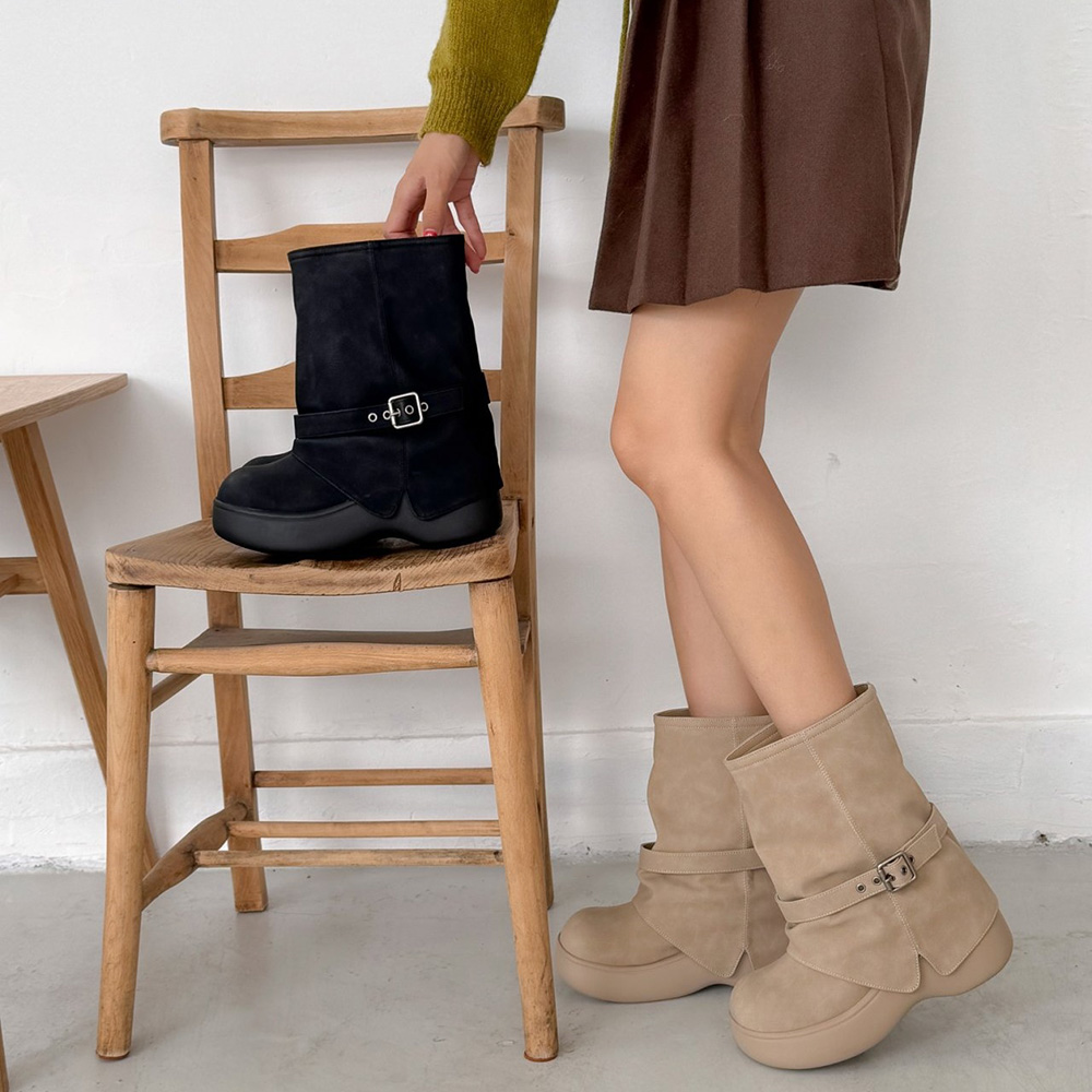 벨트 스웨이드 통굽 가보시 미들힐 미디부츠 여자 미들부츠