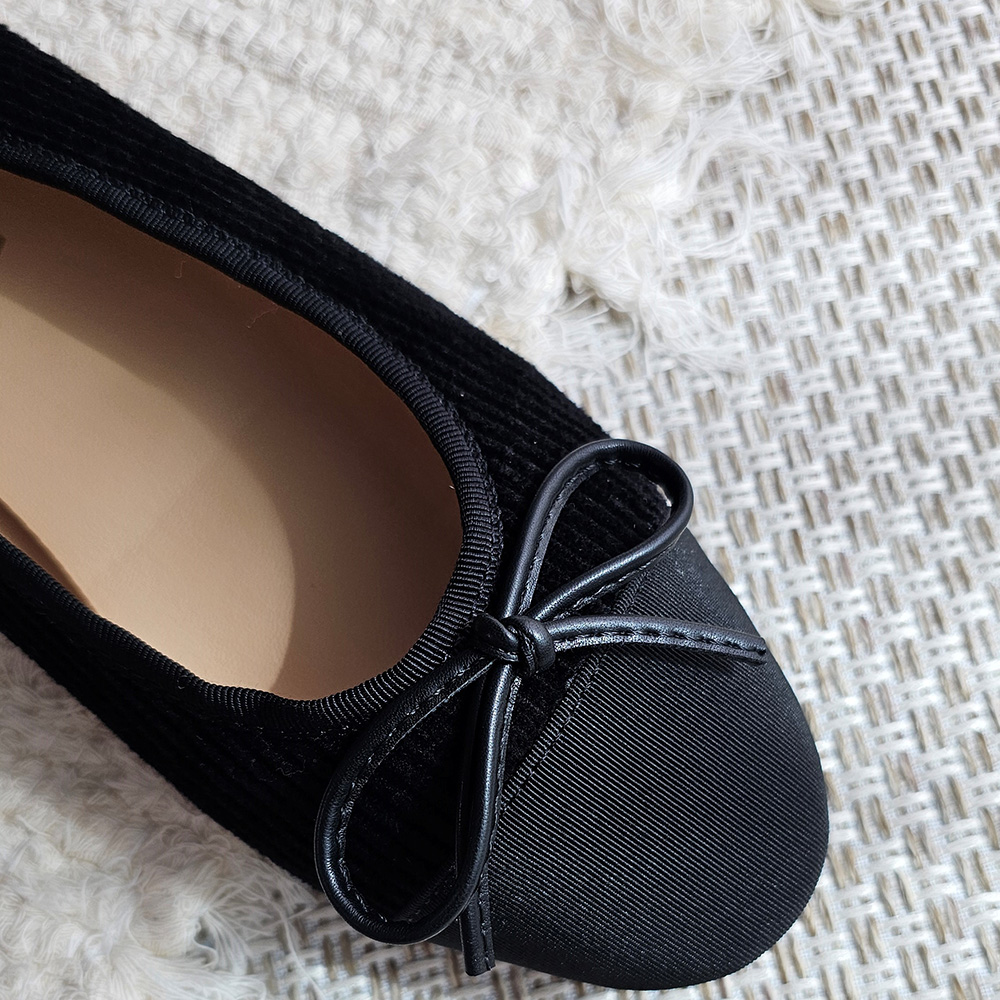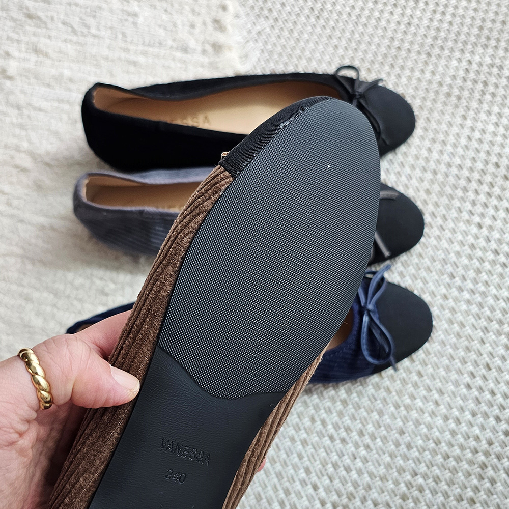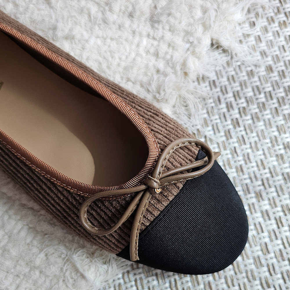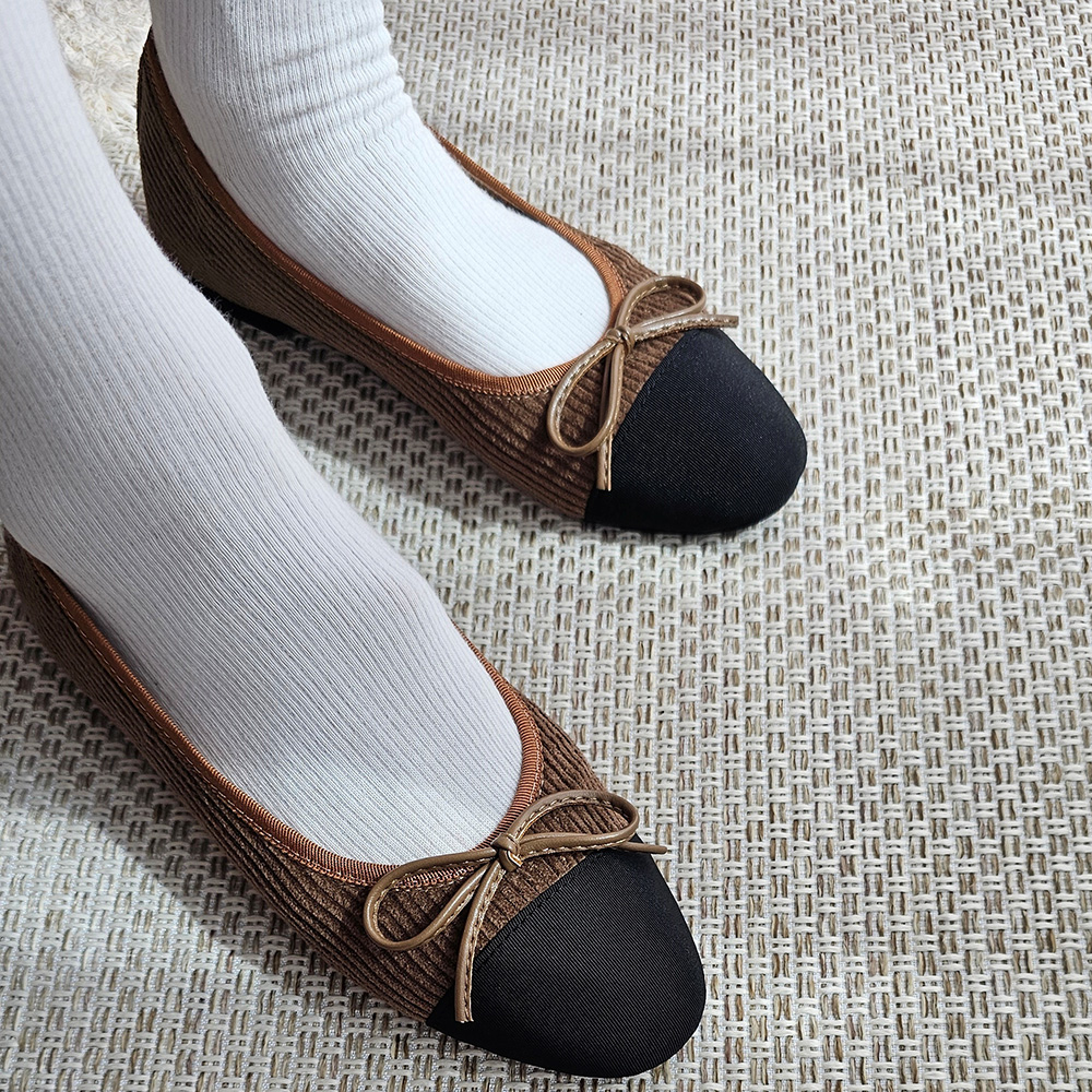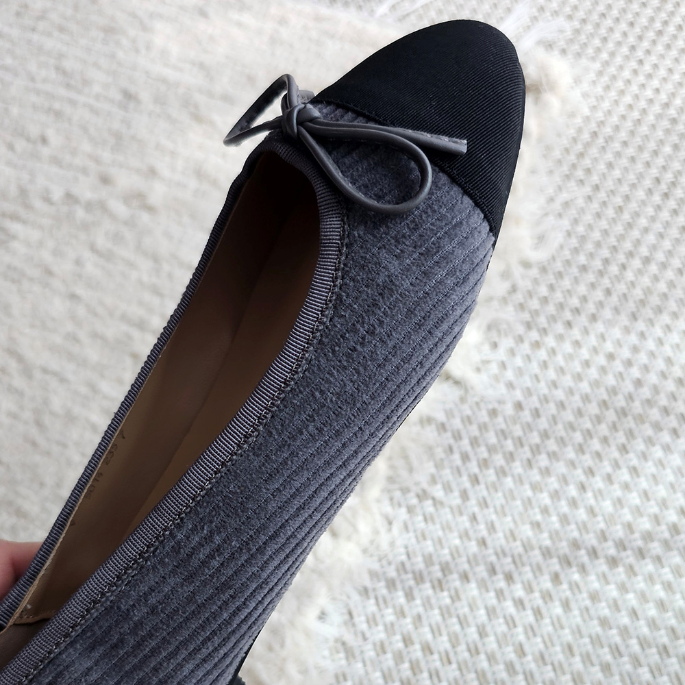 코듀로이 라운드토 투톤 리본 쿠션 발편한 여자 플랫슈즈