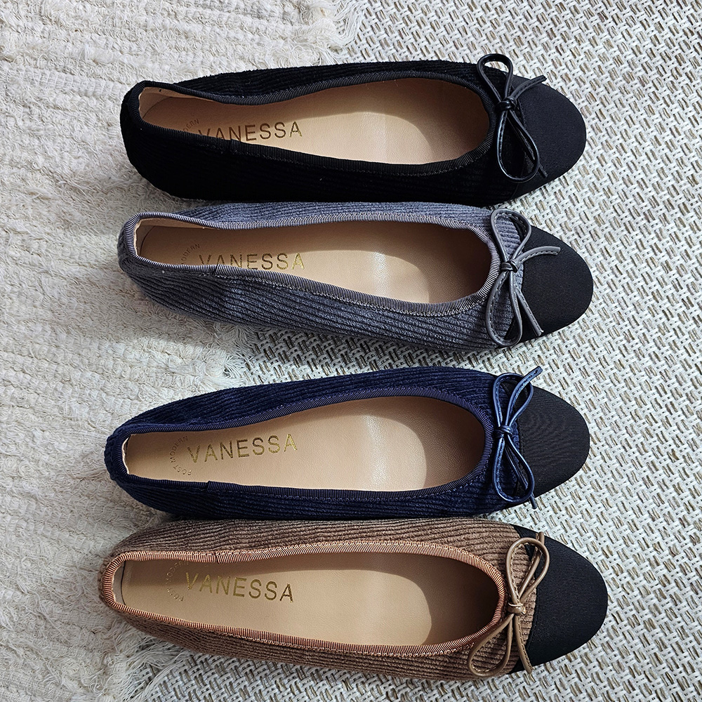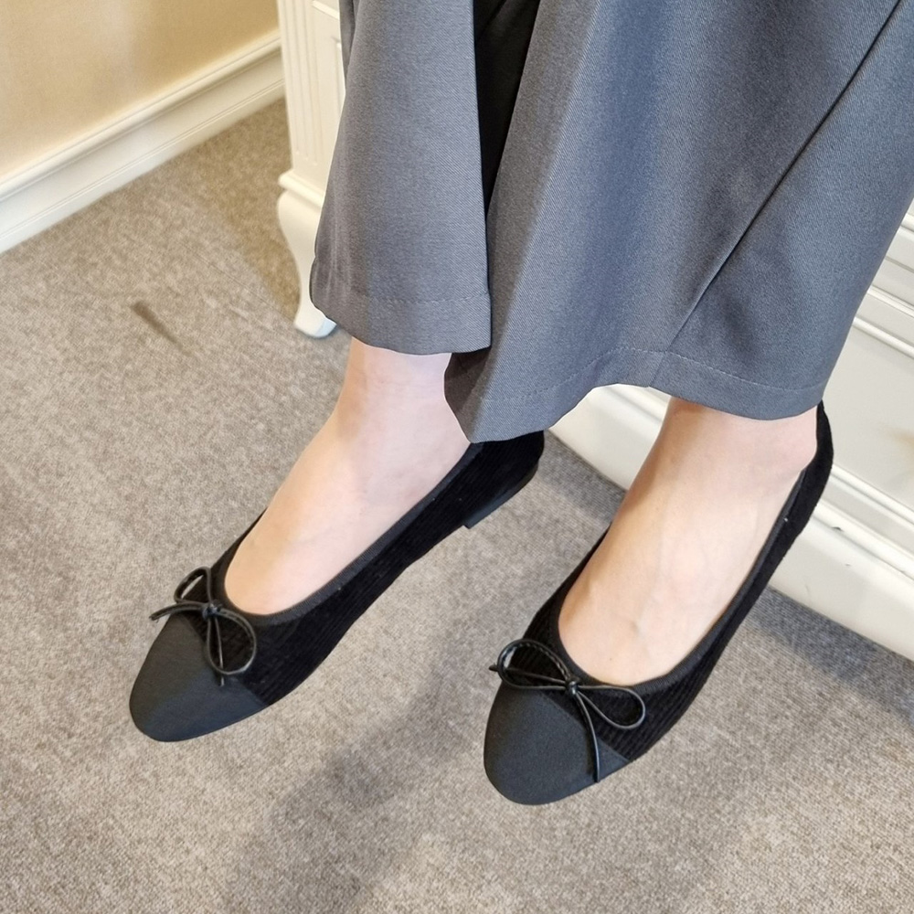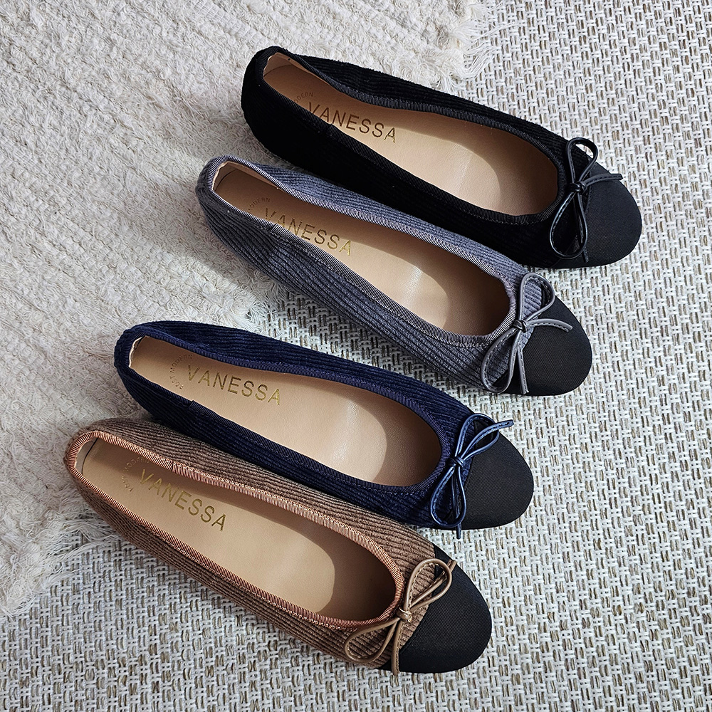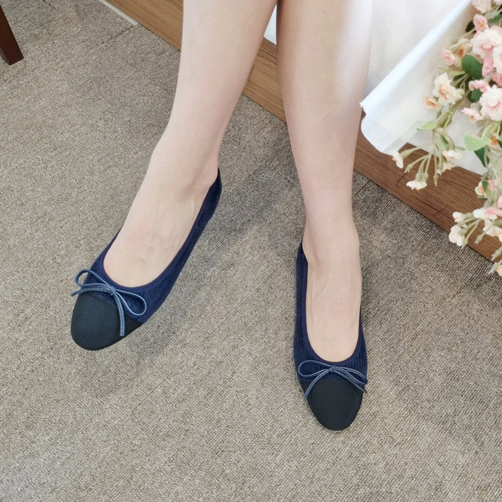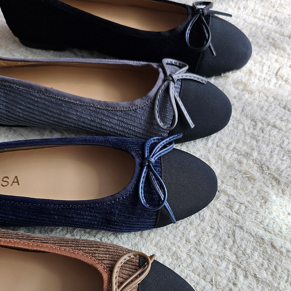 코듀로이 라운드토 투톤 리본 쿠션 발편한 여자 플랫슈즈