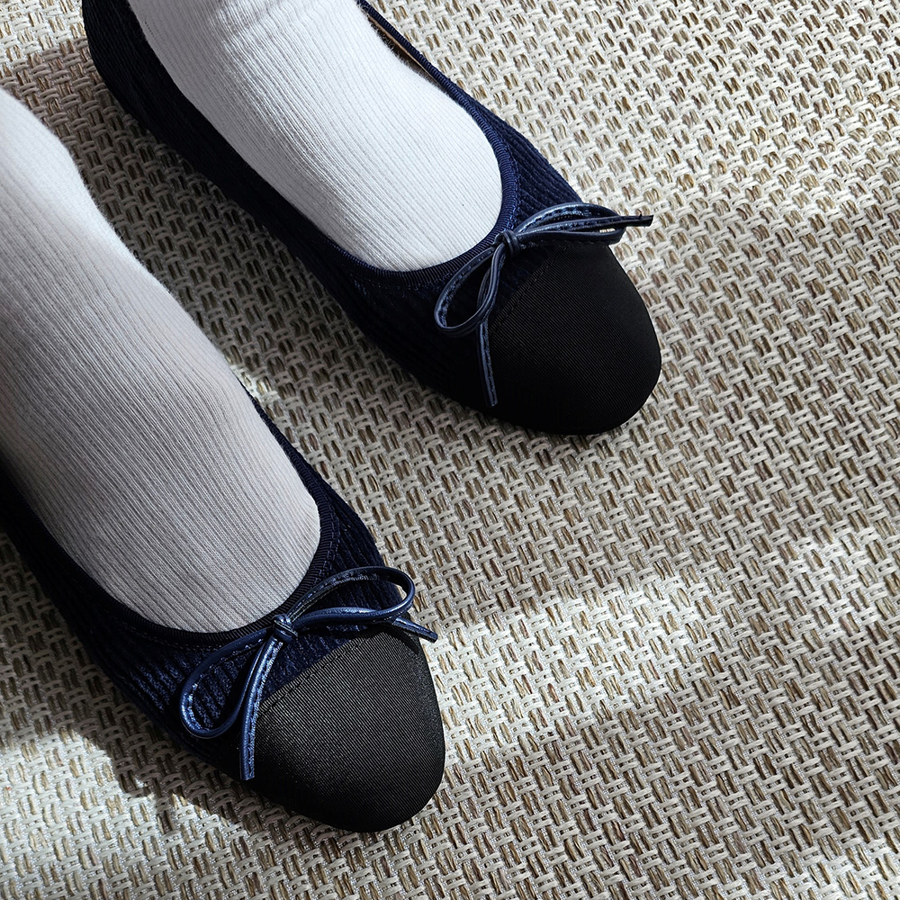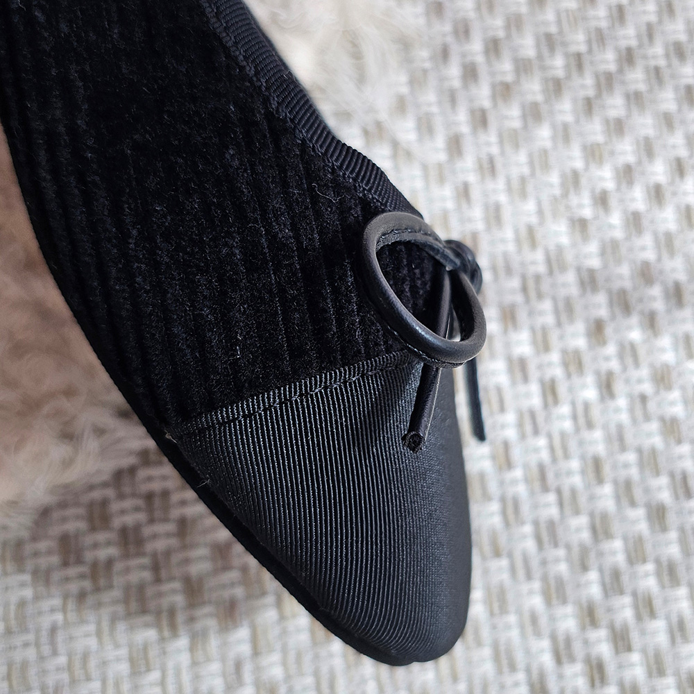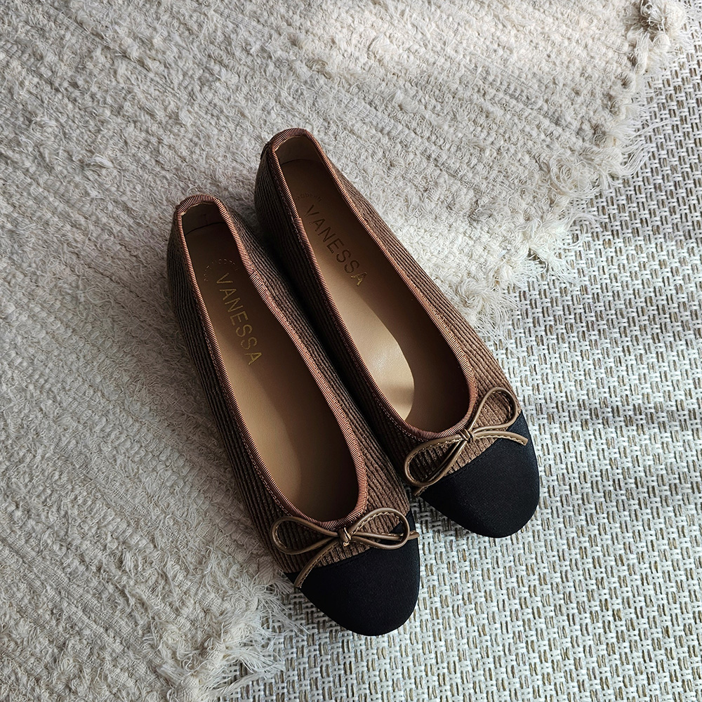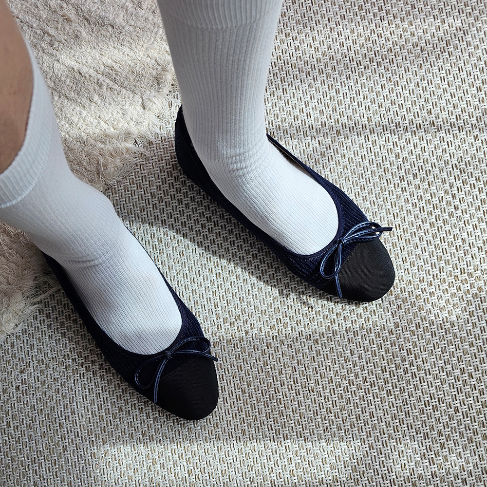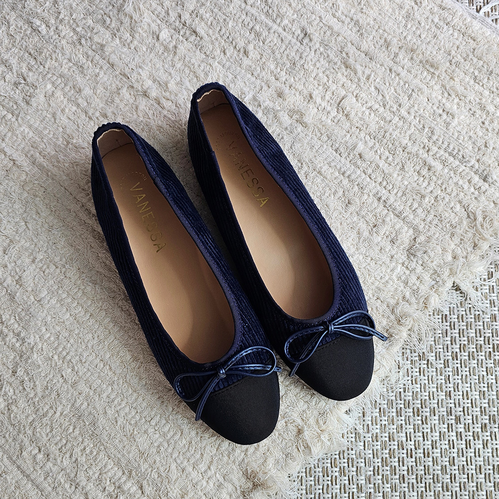 코듀로이 라운드토 투톤 리본 쿠션 발편한 여자 플랫슈즈