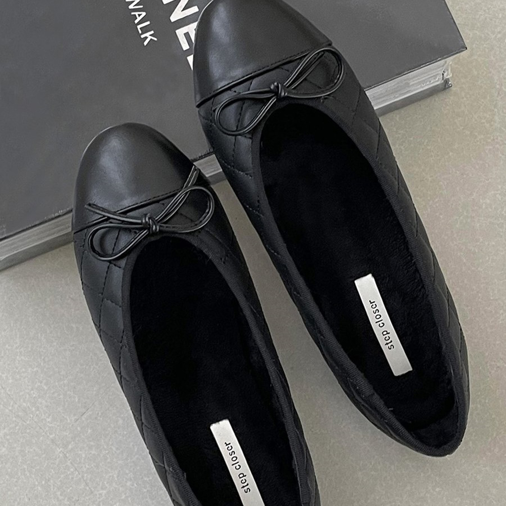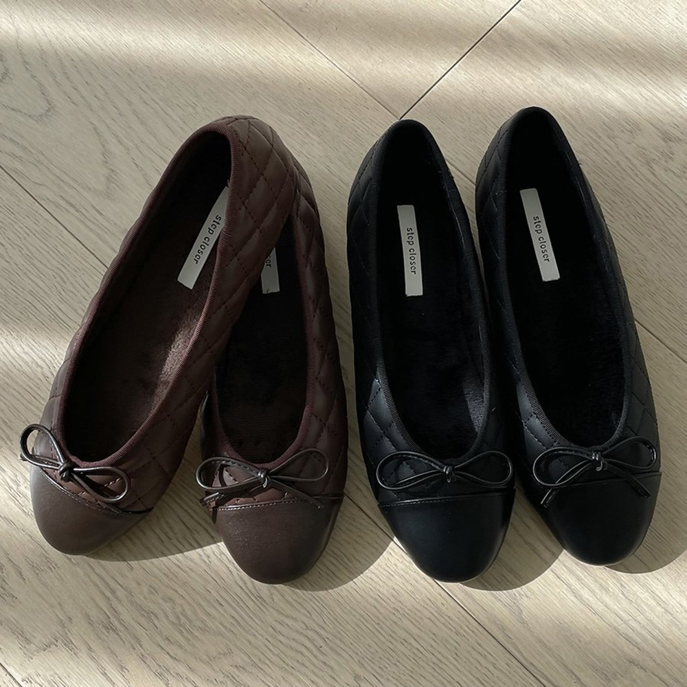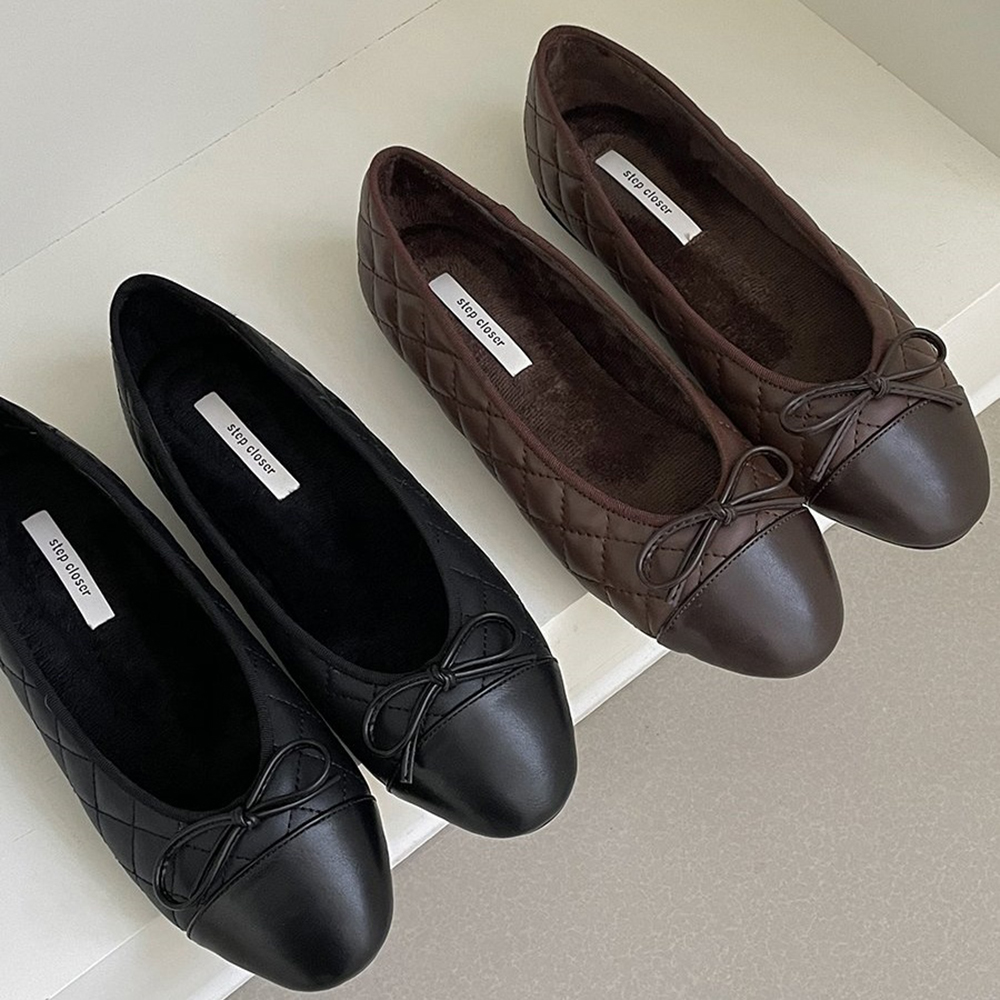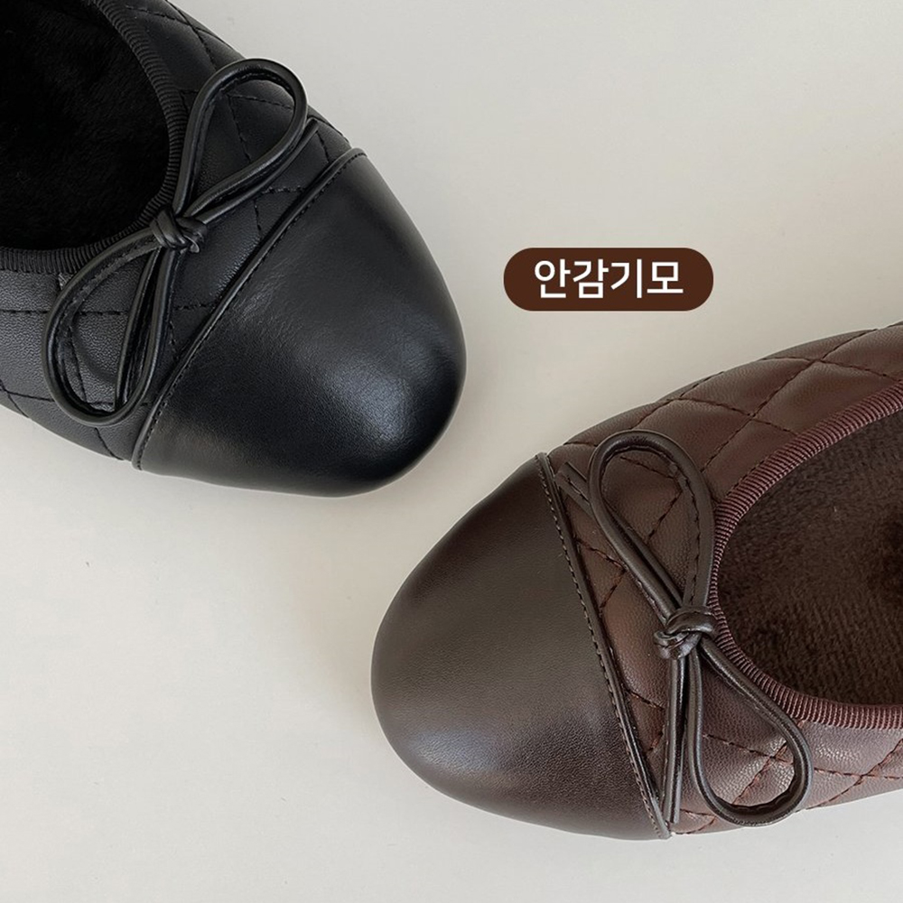 스퀘어 퀼팅 누빔 기모안감 리본 여자 겨울 플랫슈즈