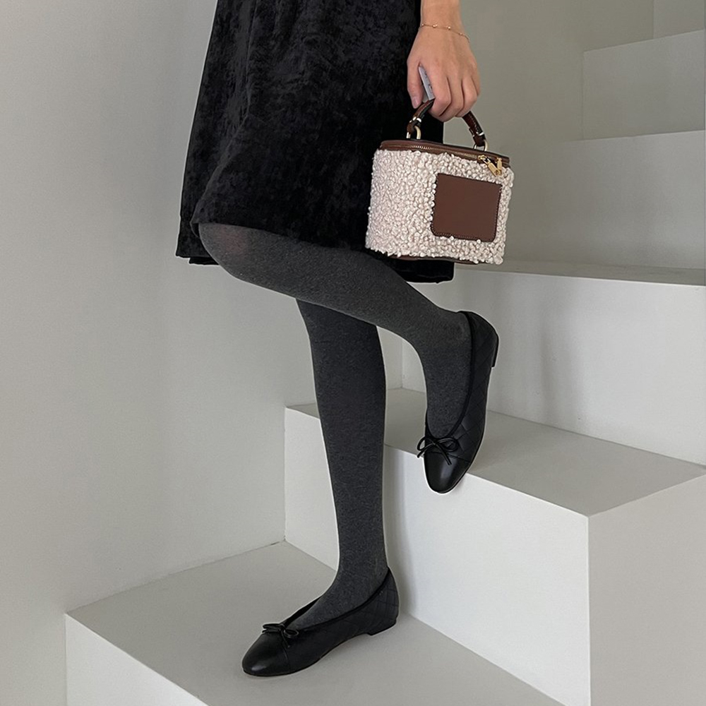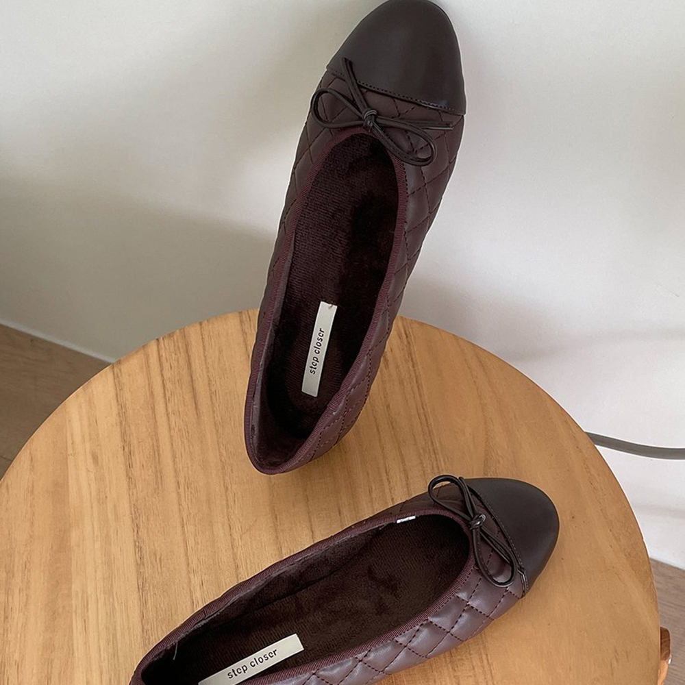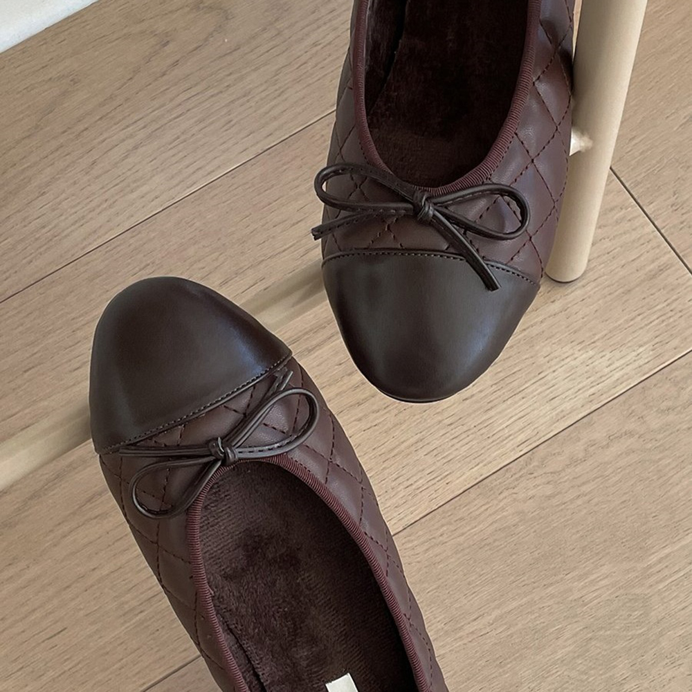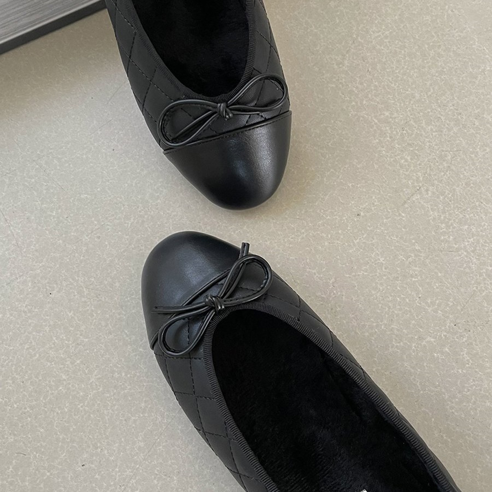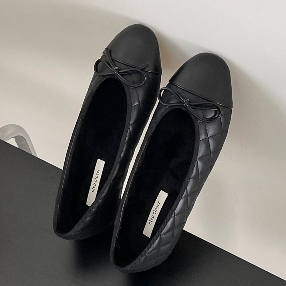 스퀘어 퀼팅 누빔 기모안감 리본 여자 겨울 플랫슈즈