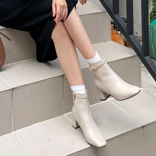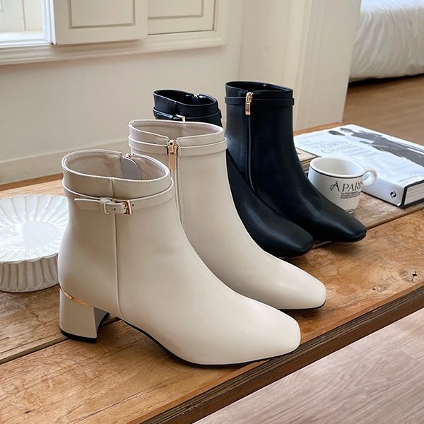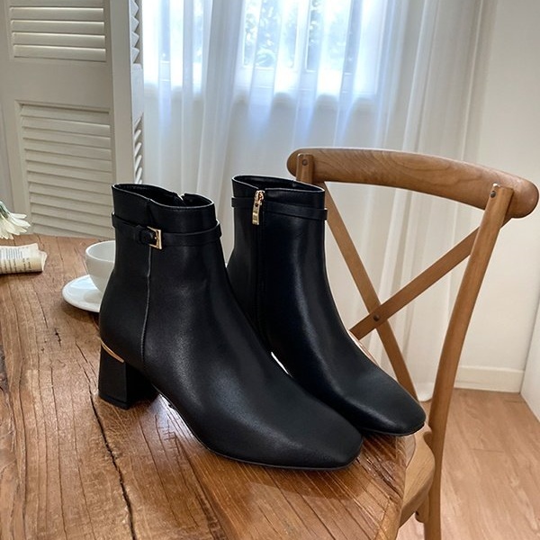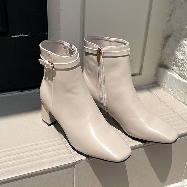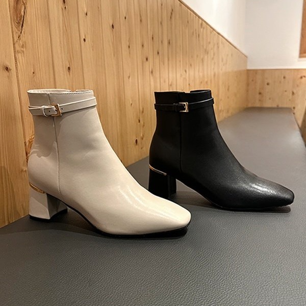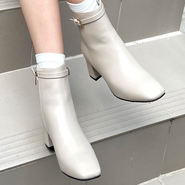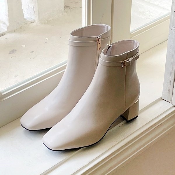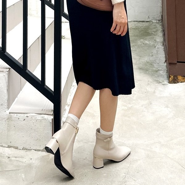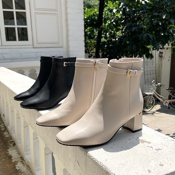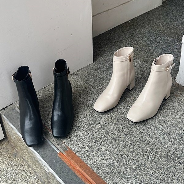 리얼가죽 스퀘어토 벨트 안쪽지퍼 미들힐 쿠션 발편한 여자 앵클부츠