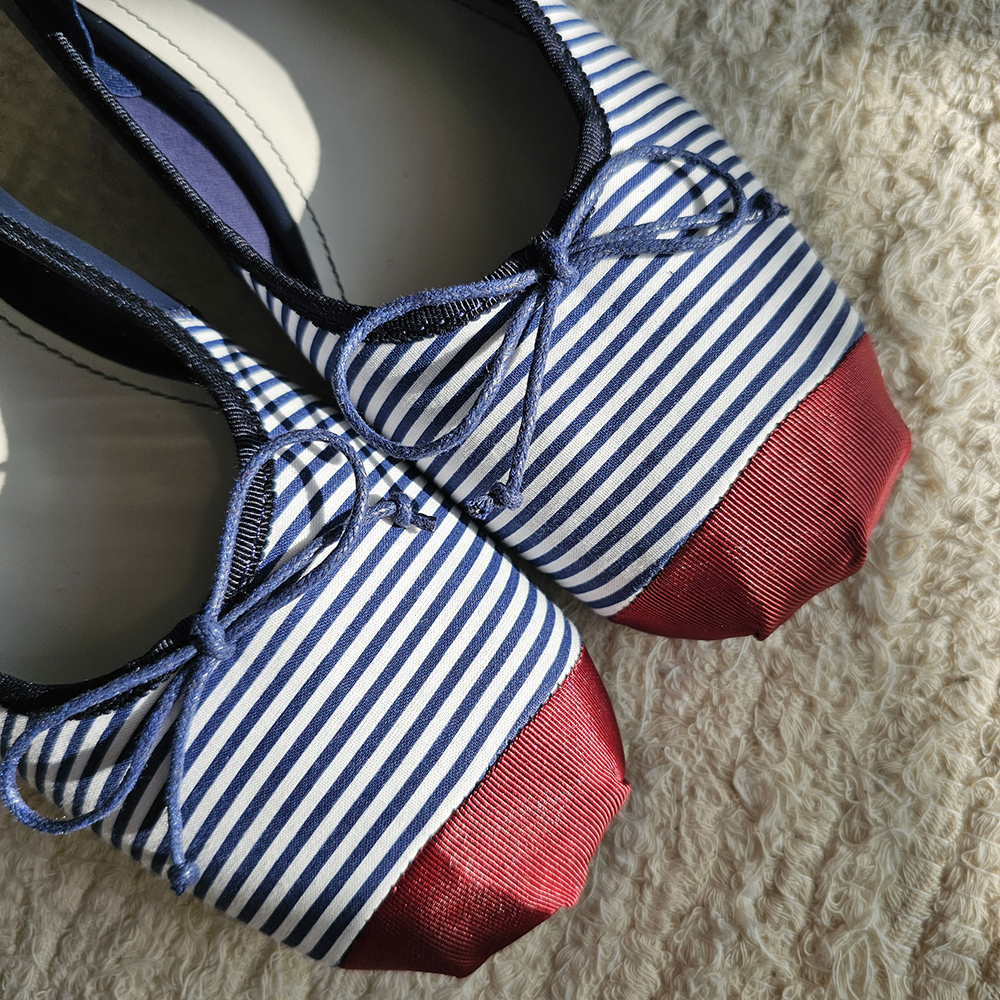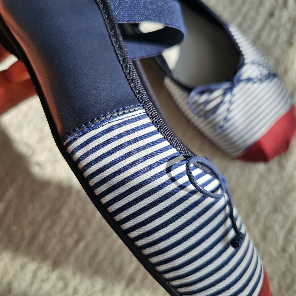 스트라이프: 경쾌한 패턴과 레드 포인트 토 배색으로