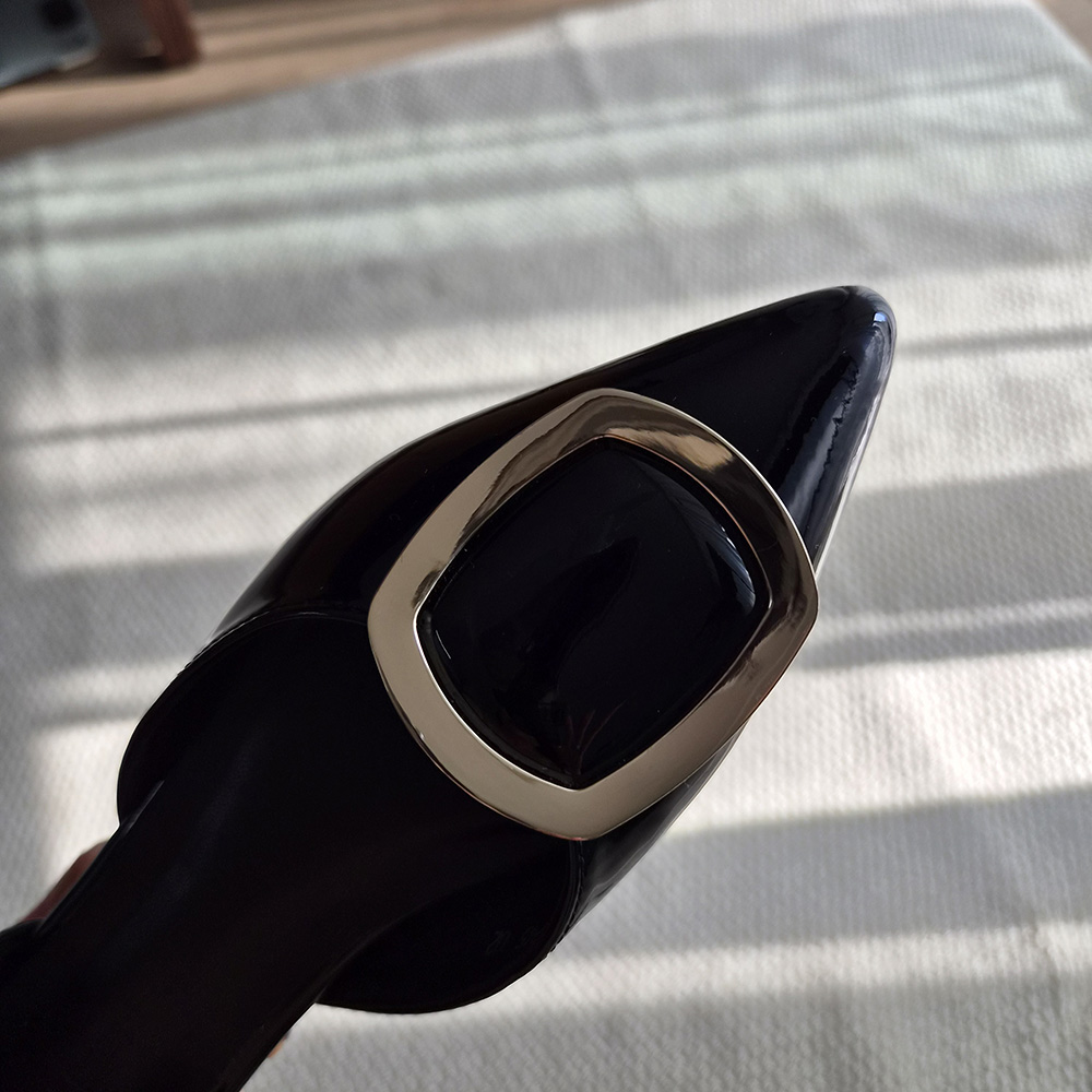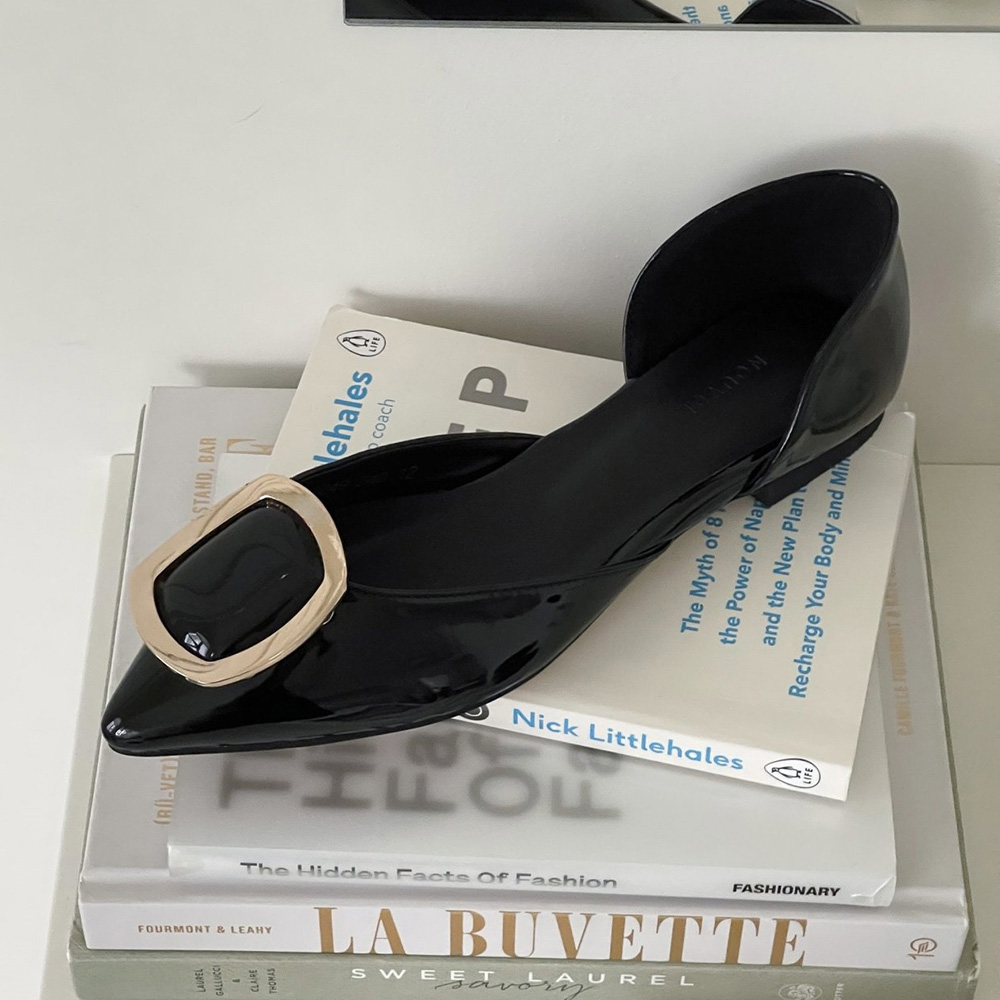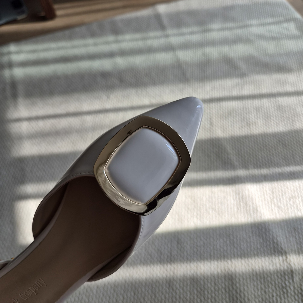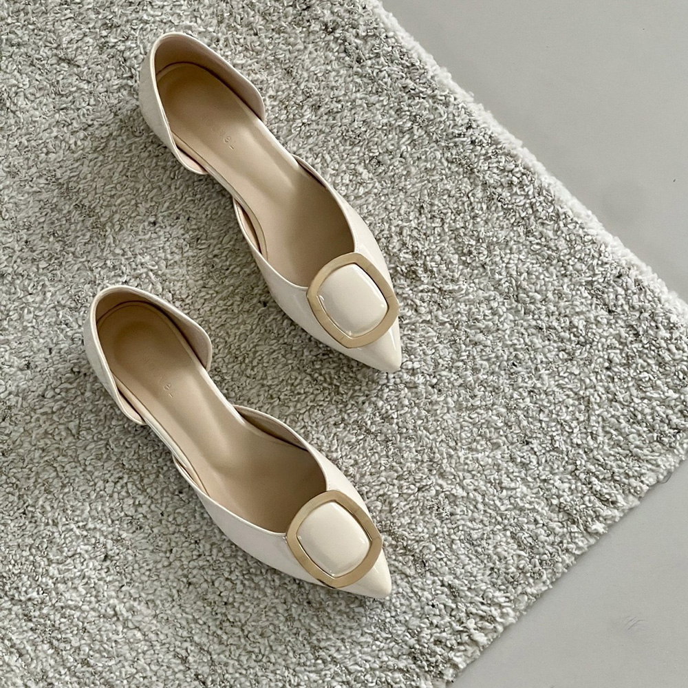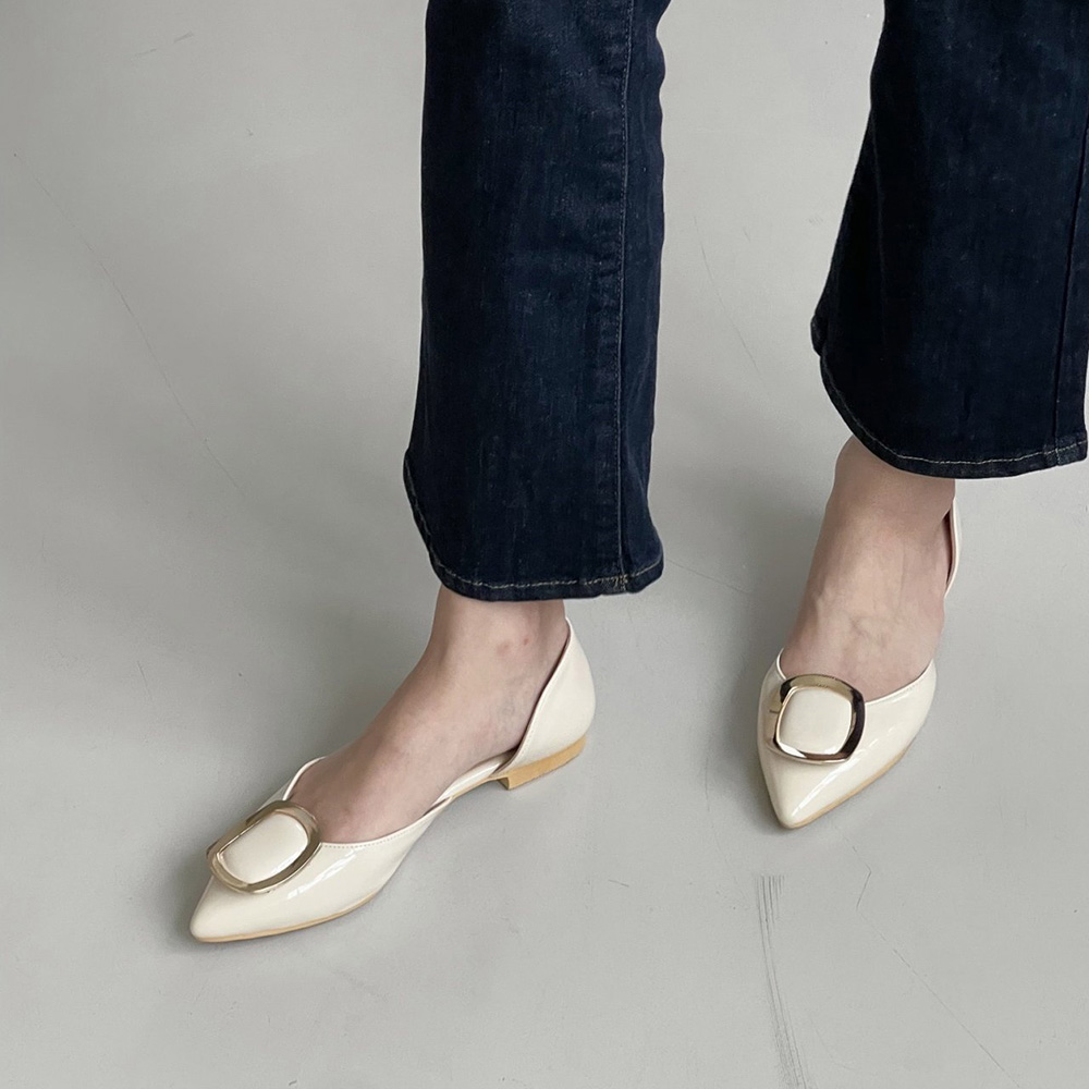 세련된 무드의 스틸레토 플랫 라인에 골드 사각 버클로