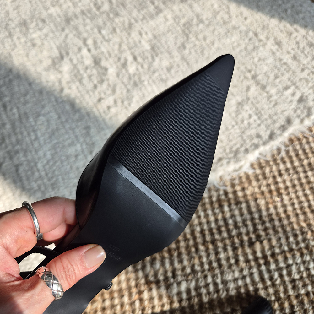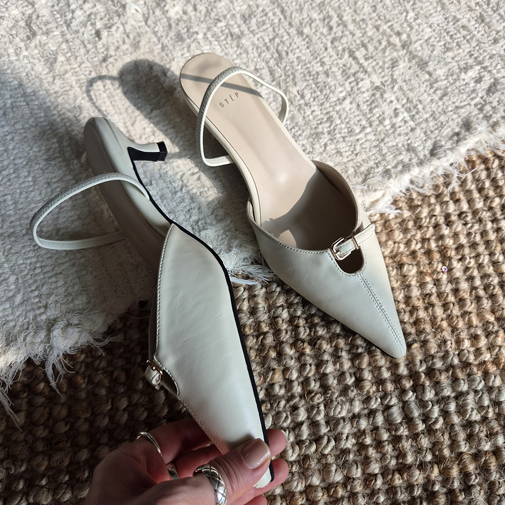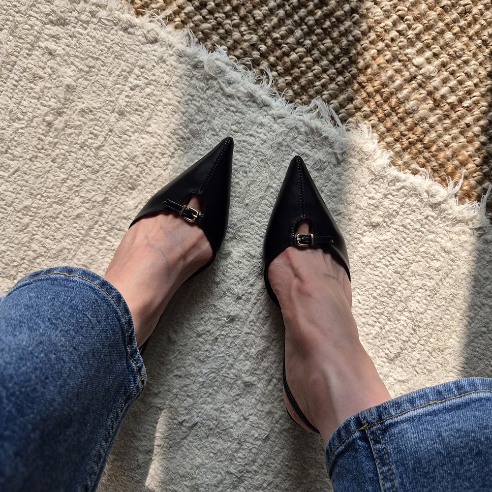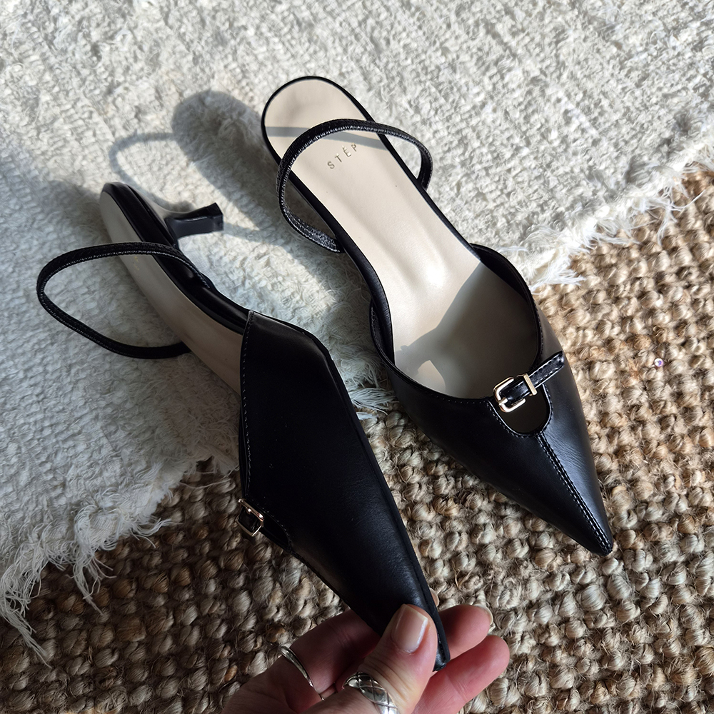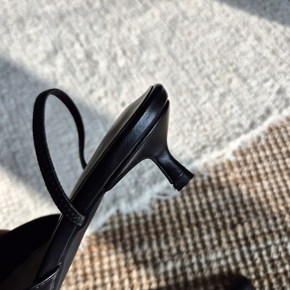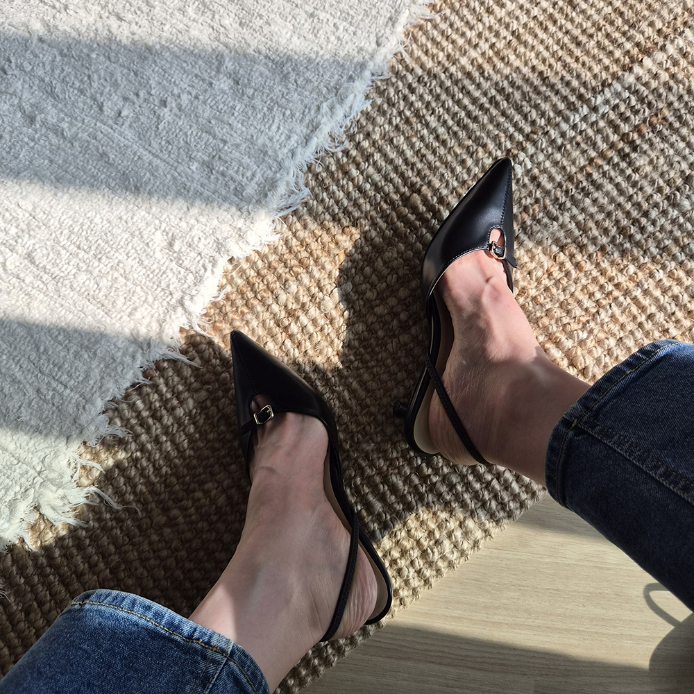 날렵한 5cm 스틸레토힐 라인이 돋보이는 세련된 무드의 슬링백입니다